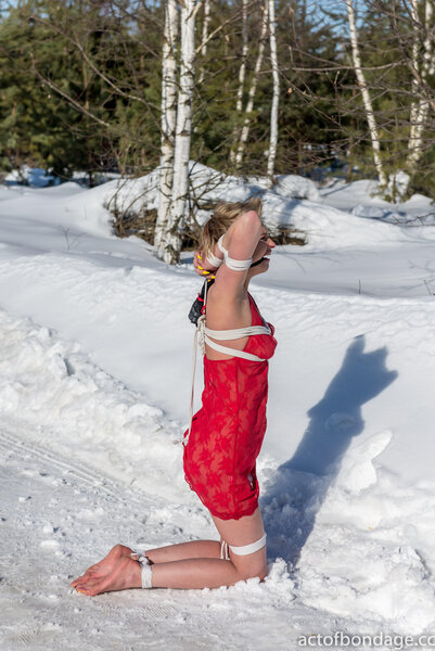 Claudia is tied after the party. She is sleeping at home in her stockings and peignoir. When her Master saw it he decides to punish her. While she is sleeping he bounds her wrinkles together and takes her to the forest. He takes her out of the car. Claudia is still with her arms in bondage and in stockings. First of all the Master takes off her stockings so she can feel the cold of snow directly with her bare soles. He ties her hands in an over-arm tie, makes a chest harness and ties her feet together. All this time Claudia is barefoot in the snow.