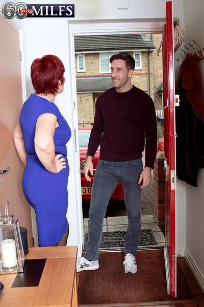 Linda Storm, a 63-year-old wife, mother and grandmother from Hertfordshire in southern England, answers the door and finds her daughter's boyfriend standing there. Her daughter is out shopping, so she invites him in. They immediately recognize each other: Mrs. Storm was his former teacher; Alexei was her former student. "You didn't know I was her mother, obviously," she says, sitting on the couch in a short dress, legs slightly parted, wearing stockings and heels. "No. I was quite surprised to see you at the door," he says. "Likewise," she says. Then he comments on her dress, which seems to be creeping up her legs, exposing more leg and more...well, you'll see. "You were my teacher crush," he admits. "All the boys used to talk about you. We used to try to get you to bend over at the blackboard." "I knew what you boys were up to," she says. "It was quite exciting." Well, by now, he can see right up her skirt, and guess what? She's not wearing panties! Bad teacher! He comes closer and eats her pussy then she sucks his cock. For the rest of this scene, he goes back and forth between fucking Mrs. Storm's pussy and mouth, and for the climax, he shoots his load down her throat. She helpfully sucks off the excess cum. Is this the kind of thing you can expect to happen when you encounter that former teacher you had a crush on? No. But it might happen. A guy can always dream.