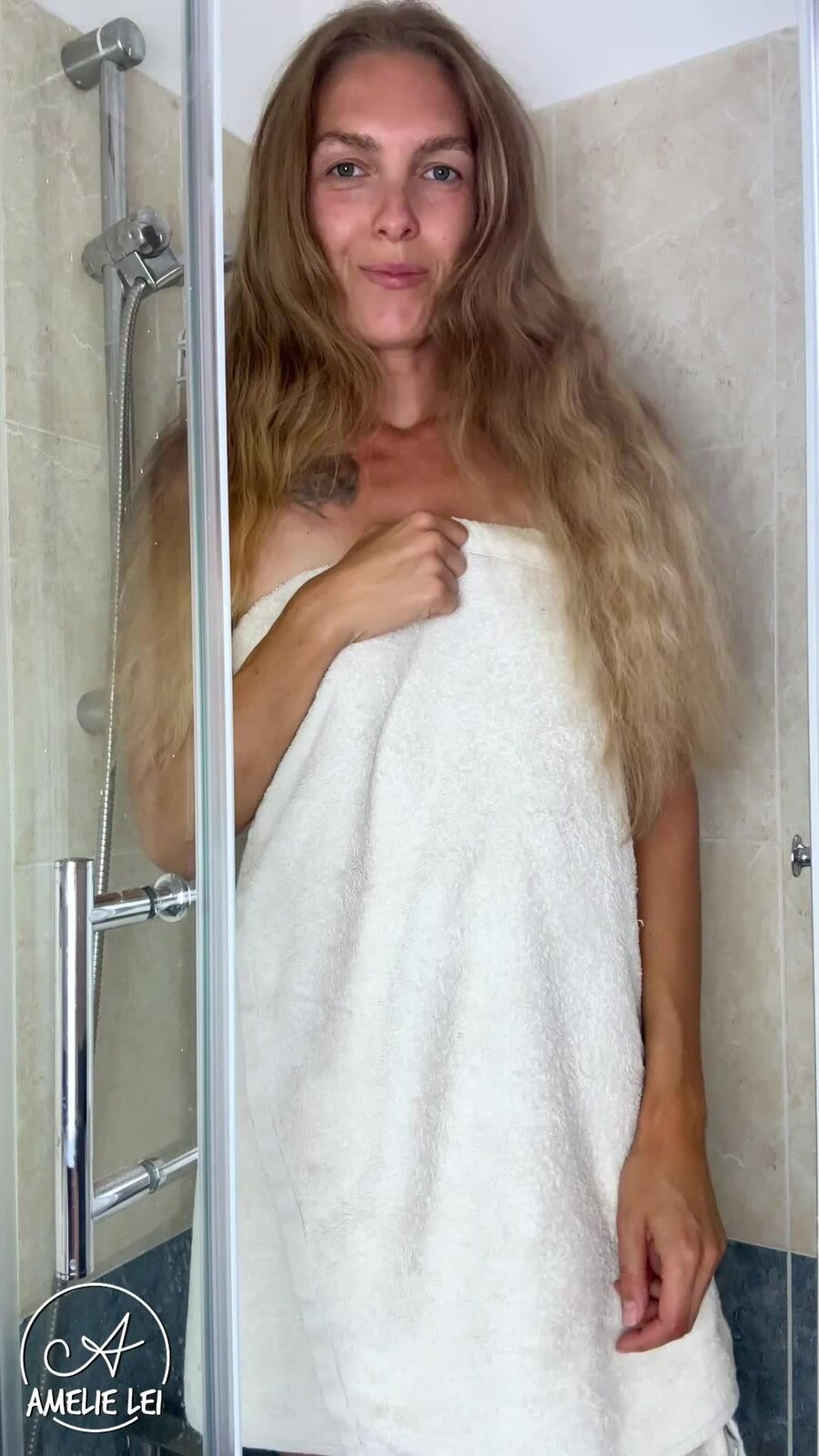 I want to have you in my shower and have fun with you! I drop my towel, close the doors and you still have a good view of my sexy body as the water runs down. Doesn't that look super hot? I love wet bodies, so sexy! And how do you like my hairy armpits and my bush down there? Oh dear, if you were only here now Oo it would be so hot! Can you even last that long? I want to cum with you, so I sit on the floor, spread my legs for you and tell you when I'm ready to cum! Are you cuming with me?
