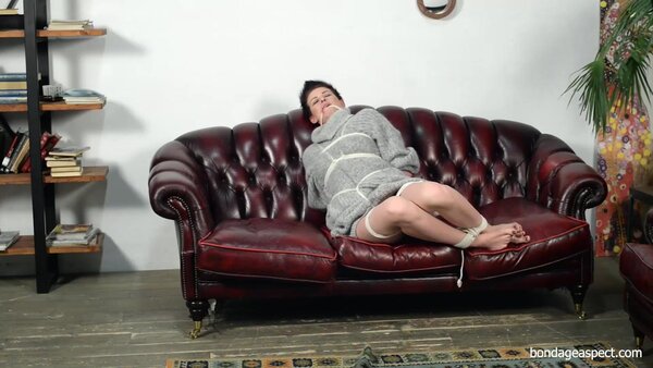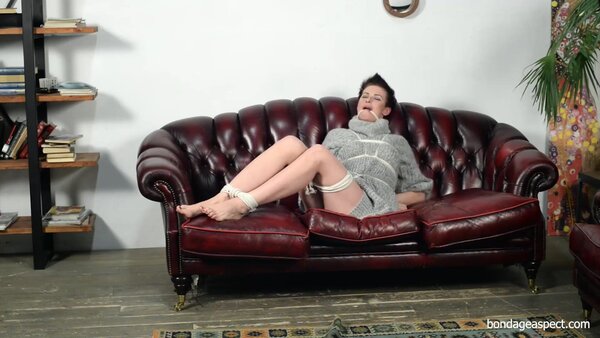 A cute girl Claudia wearing a poolover and stockins takes the stockings off ang gives a foot show with her legs and feet bare. She lays on a sofa in the pose showing soles. Then she is tightly bound in a hogtie. #bondage #footfetish
