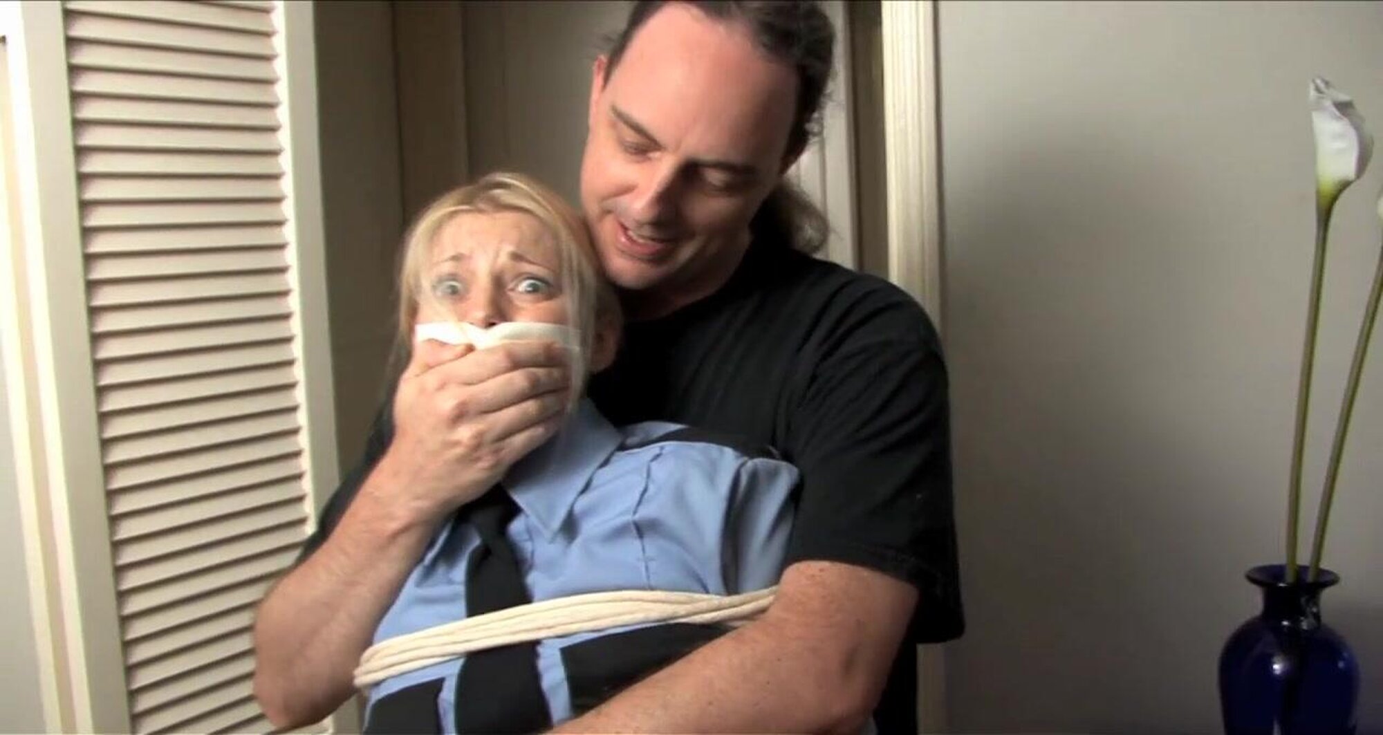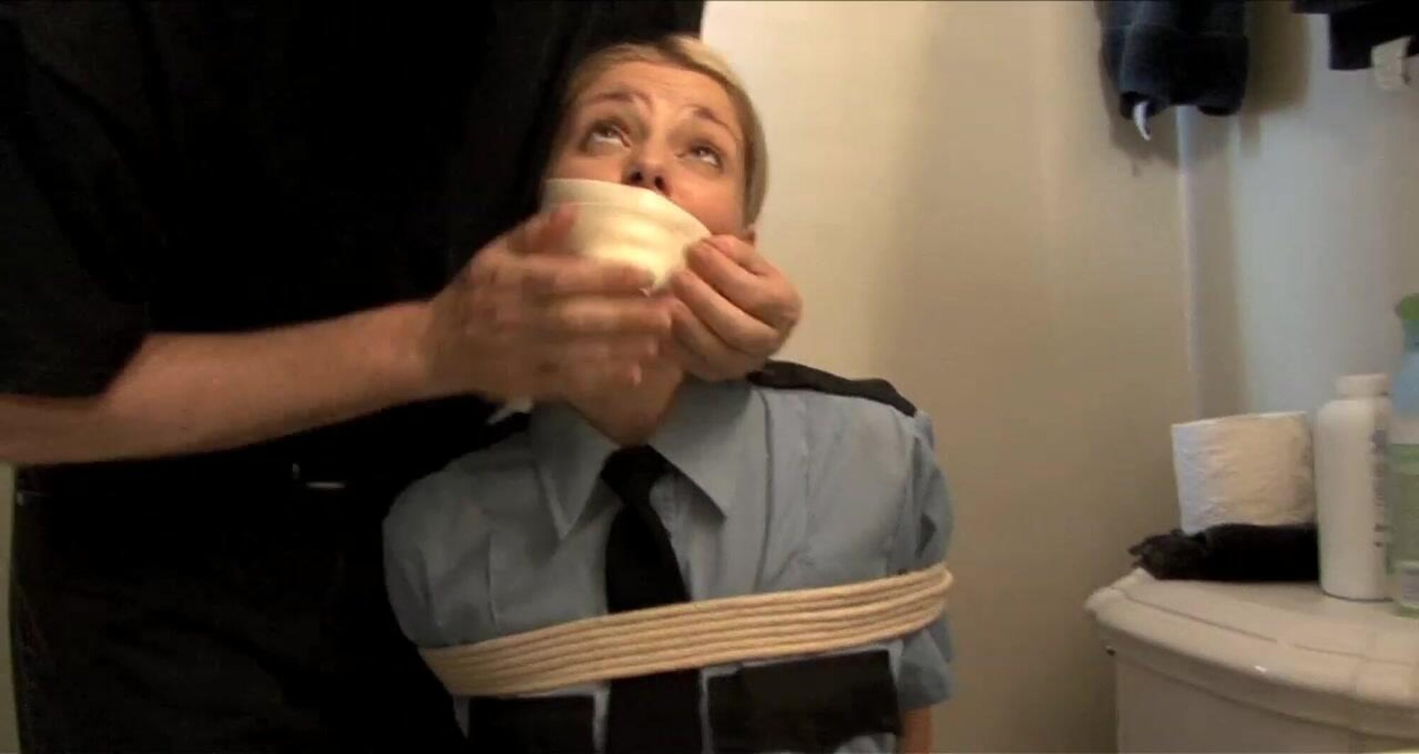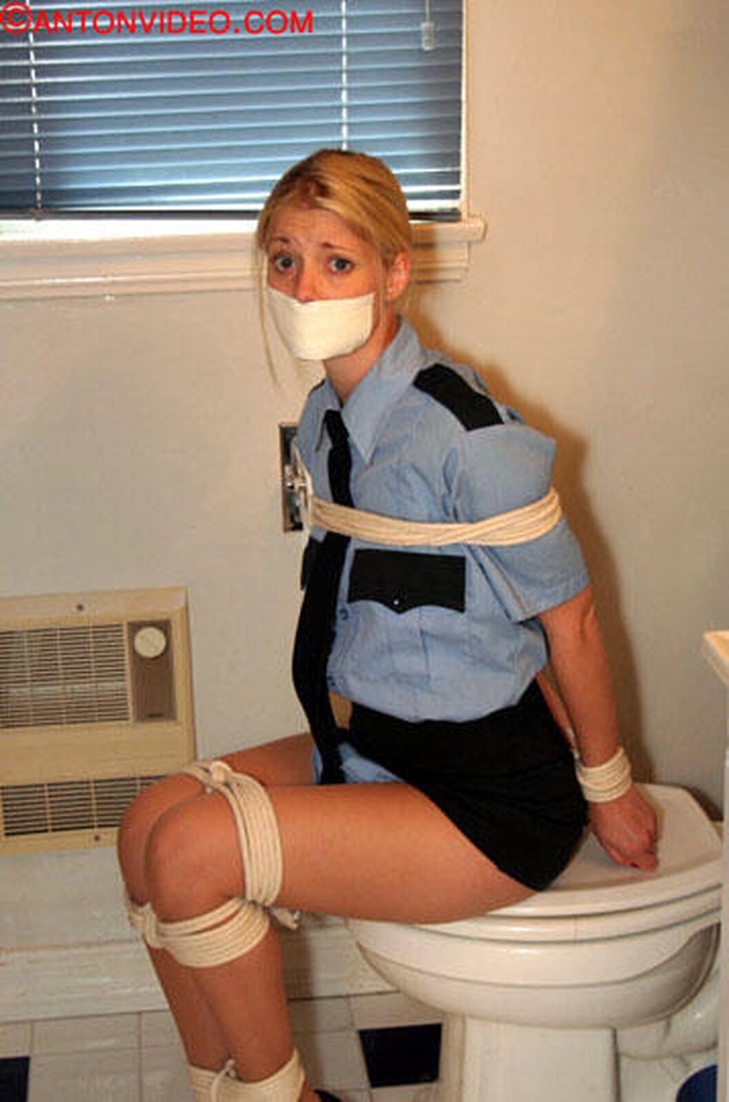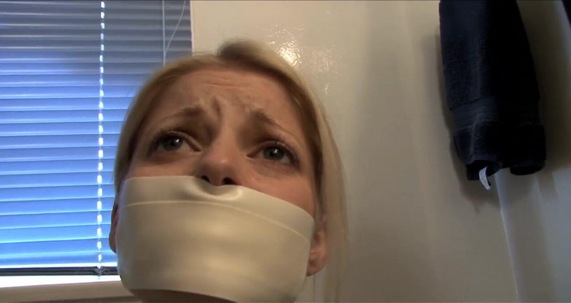 Starring Charlotte StokelyCharlotte looks really cute in her security guard uniform with a short black skirt and pantyhose. Evil Tim is robbing the museum where she works so he ties her up in the bathroom. Despite her pleading, he tapes her mouth and leaves here there. Charlotte struggles hard but can not get loose. When she hears Tim and his accomplice talking about getting rid of her, she works her shoes off and manages to get her legs loose. She cautiously tries to escape but is caught. The creeps decide to stuff Charlotte in a closet and lock her in for the night. About 4 minutes of outtakes, showing Charlotte being bound, conclude the video. Scene #BG0739
