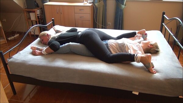 Stefanie likes to tickle others. She persuades Isabel to let her tie her up together. The bondage is designed so that each of them can tickle the other's feet.