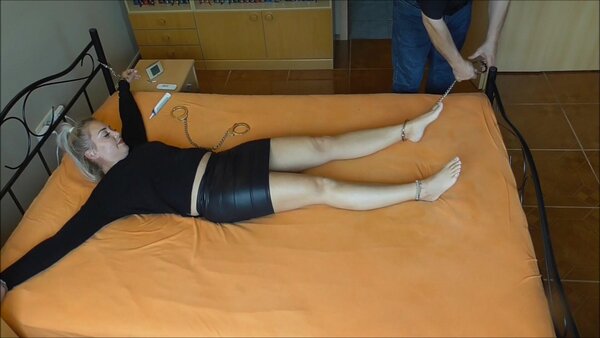 Janine is tied to the bed by Mike. He pampers her bare feet and tickles her.