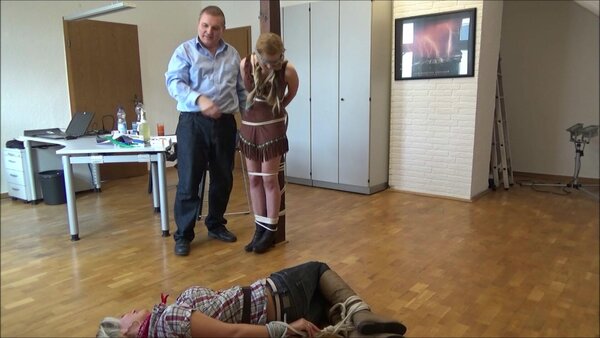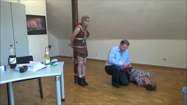 Melina and Steffie want to go to a costume party. They dressed up as cowboys and Indians. Of course they then have to test the mat post. Steffie is quickly tied up first and is tickled by Melina. What will happen next?