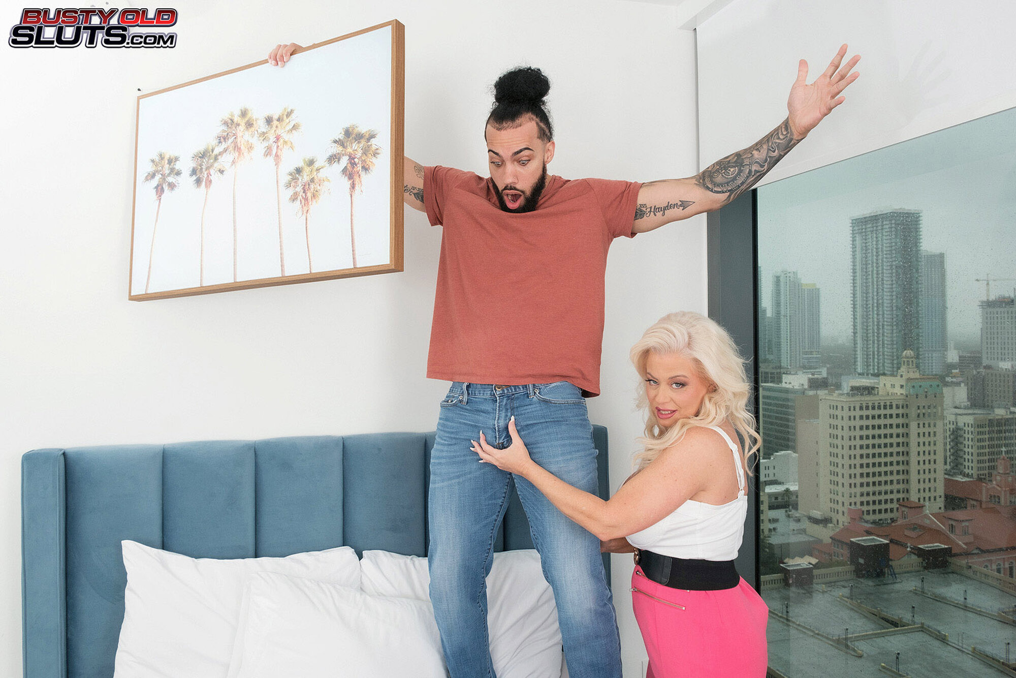 While James Angel waits for his friend, his friend's busty mom, 48-year-old Billie Jean Austin, puts him to work hanging a picture on the wall behind her bed. She reaches out to grab his butt and his cock. And you can guess what happens next, but we'll tell you. She sucks his cock. He eats her pussy and fucks it. And then he cums on her tits. Billie Jean, who's from Texas, used to be a stripper. Then she became a medical assistant. Now she's doing this and loving it. 40Something: How do you rate your sex drive from 1-to-10? Billie Jean: As I get older, I'm getting closer to 10. 40Something: Do you have any nightly rituals like rubbing lotion on your breasts or legs? Billie Jean: My nightly bedtime ritual is a hot shower and then I rub my whole body down with lavender and honey lotion. 40Something: Do you ever go to strip clubs as a customer or go to male strip shows? Billie Jean: I used to go and scope out the clubs. I would look at the girls and the clientele and the cash flow. I was looking for high-end clubs with class. I would often take my dad and brother and buy them table dances. It was fun. My sister and mom and I sometimes would go see the men strip and get table dances. 40Something: What kind of outfits and heels do you feel the sexiest in? Billie Jean: High platform heels, thigh-high stockings and garter belts with a sexy lacy, sheer bra. When it comes to summer clothes, the tightest tops to show off my big boobs with short-shorts. 40Something: Do you have any favorite fantasy costumes and heels? Billie Jean: My favorite costumes were a hot teacher in sexy stockings, white collared shirt and a tight pencil skirt. I danced to the song "Hot For Teacher." I also loved wearing a Catholic schoolgirl outfit. I was more of a stage performer than a pole dancer.