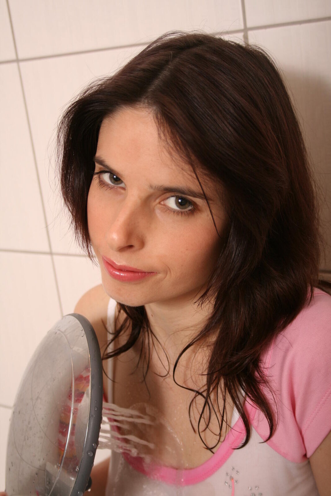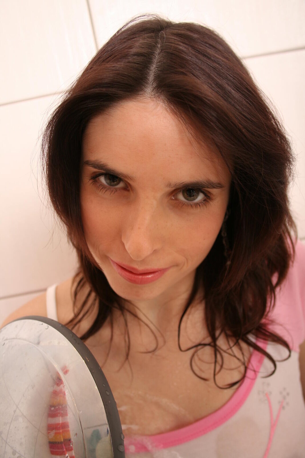 I love playing in the shower, the warm jets of water soaking my t-shirt and panties, as well as getting my fishnet pantyhose wet. Once my panties and t-shirt were good and wet, I stripped the panties off and used the warm water from the shower to massage my pussy until I made myself cum.