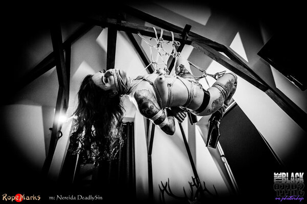 Today we play, we play with our Spanish beauty and sweetheart Nereida DeadlySin. We tie her in a diamond shaped, hojo-based, gote, a bondage that will be her main support during this session (diamonds are a girl's best friend). A session where she wil go sideways, have her legs opened, her face wrapped tight and her breath taken away.