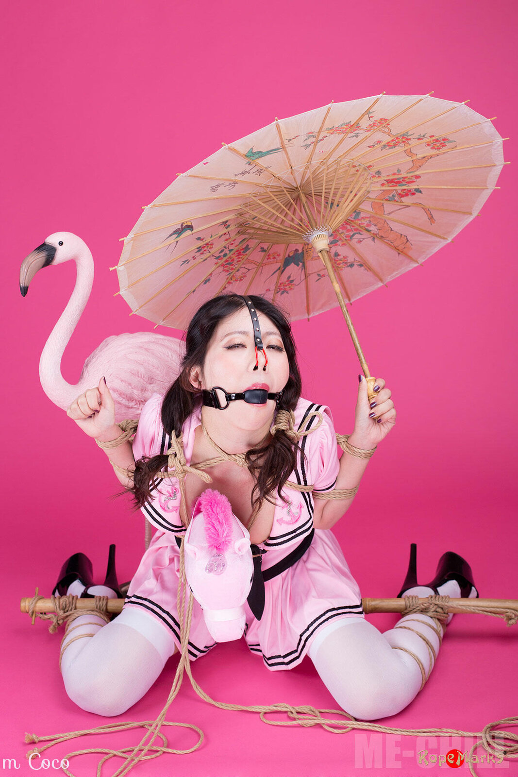 Please enjoy Coco vs the flamingo, on a wooden stick-horse, wearing a tengu and a bamboo stick, a ball gag, a nose hook and an umbrella. Everything is in pink, ofcourse.