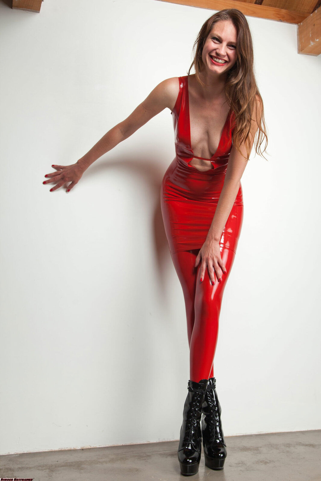 Today starts out with the sexy Spring dressed in a beautiful, tight, red latex outfit. She is posing for us in her high platform heels. It does not take long before we decide she is better off with some added latex and restraing. We make spring wear long rubber opera gloves, hood her face and strap her arms one her back, elbow touching, with rubber belts. Now we are getting somewhere!