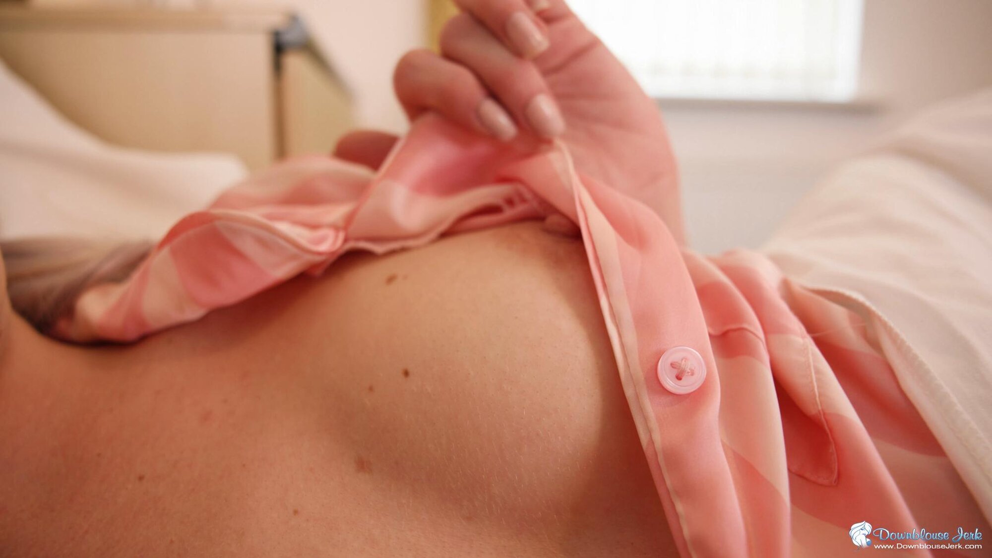 You shared a bed with your friend Gabie last night, but you've woken up to her breast fallen out of her pyjama top and she can see it's given you morning glory! Seeing as you're such good friends, Gabie suggests you wank your cock and she'll carry on teasing you with her silky pyjama top and exposing her natural perky tits!