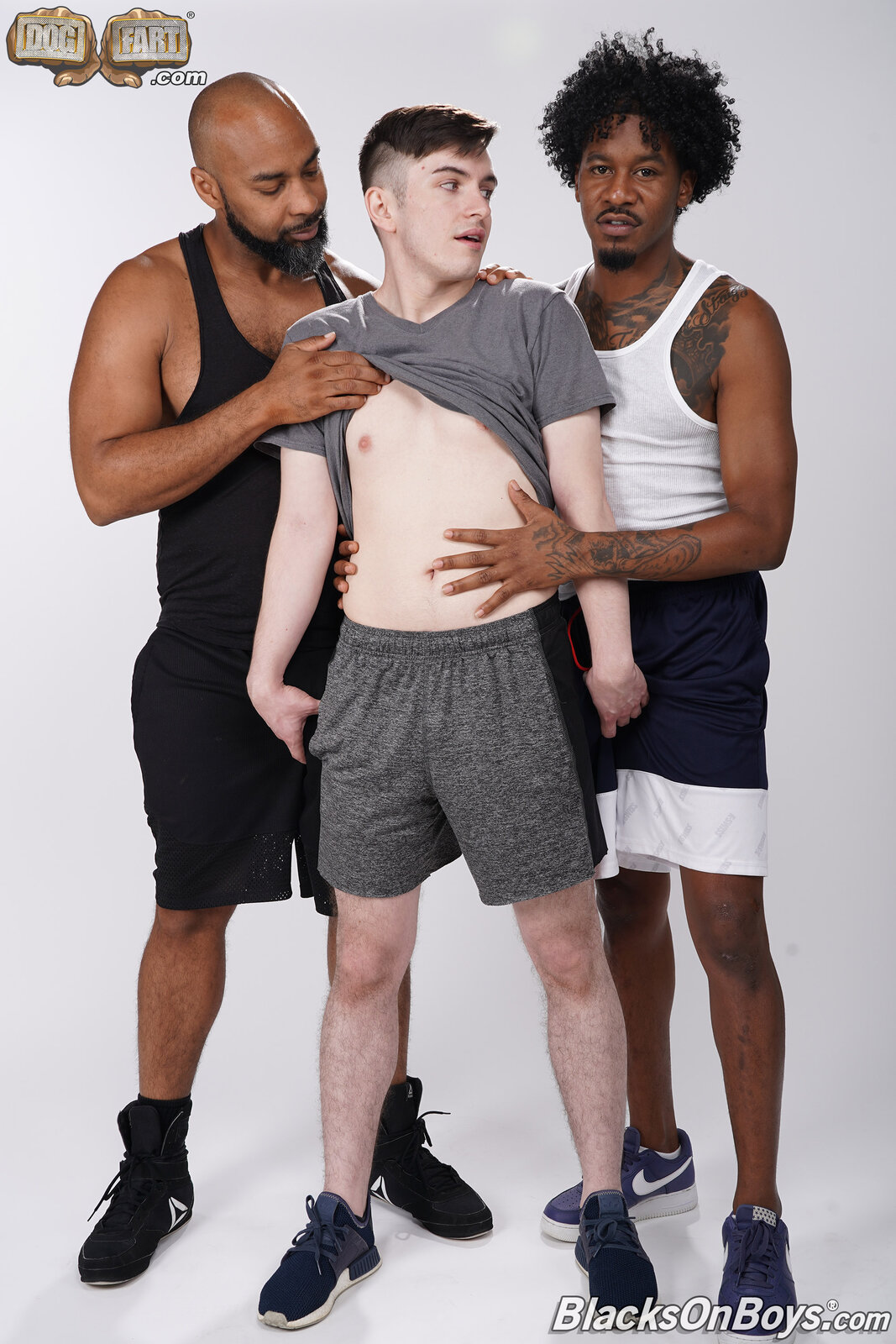 Caleb has been cooped up at home for two long and glad to get back to the gym. He is going to try out that new one he hears rumors about of guys hooking up there. He quickly finds the back of the locker room where the glory holes are and finds just the big dicks he is desperately needing. He sucks cock with abandon when all of a sudden they pull out and offer a note, with an invite to come back to their place and really get some dick. Back at their place they waste no time getting down to opening this boys ass up. He takes the first 9 inches like a champ and rides the next thick dick like a boy in heat. Shooting his load while getting pounded and then taking two loads on his face ensures he will be a repeat invite to this house.