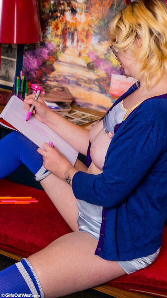 Pretty new girl Daisy Chains is sitting drawing a picture of a vagina. It's her good looks and charming smile that gets you drawn in. Her body is lovely and supple. Gorgeous long pubes cover her vagina. Her legs, she plays with her pussy and feels it up and gets ready to ORGASM.