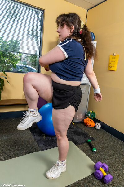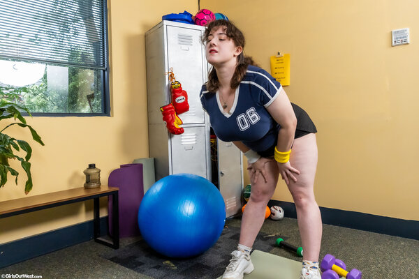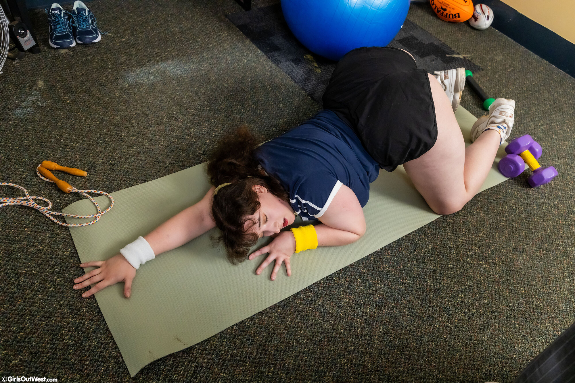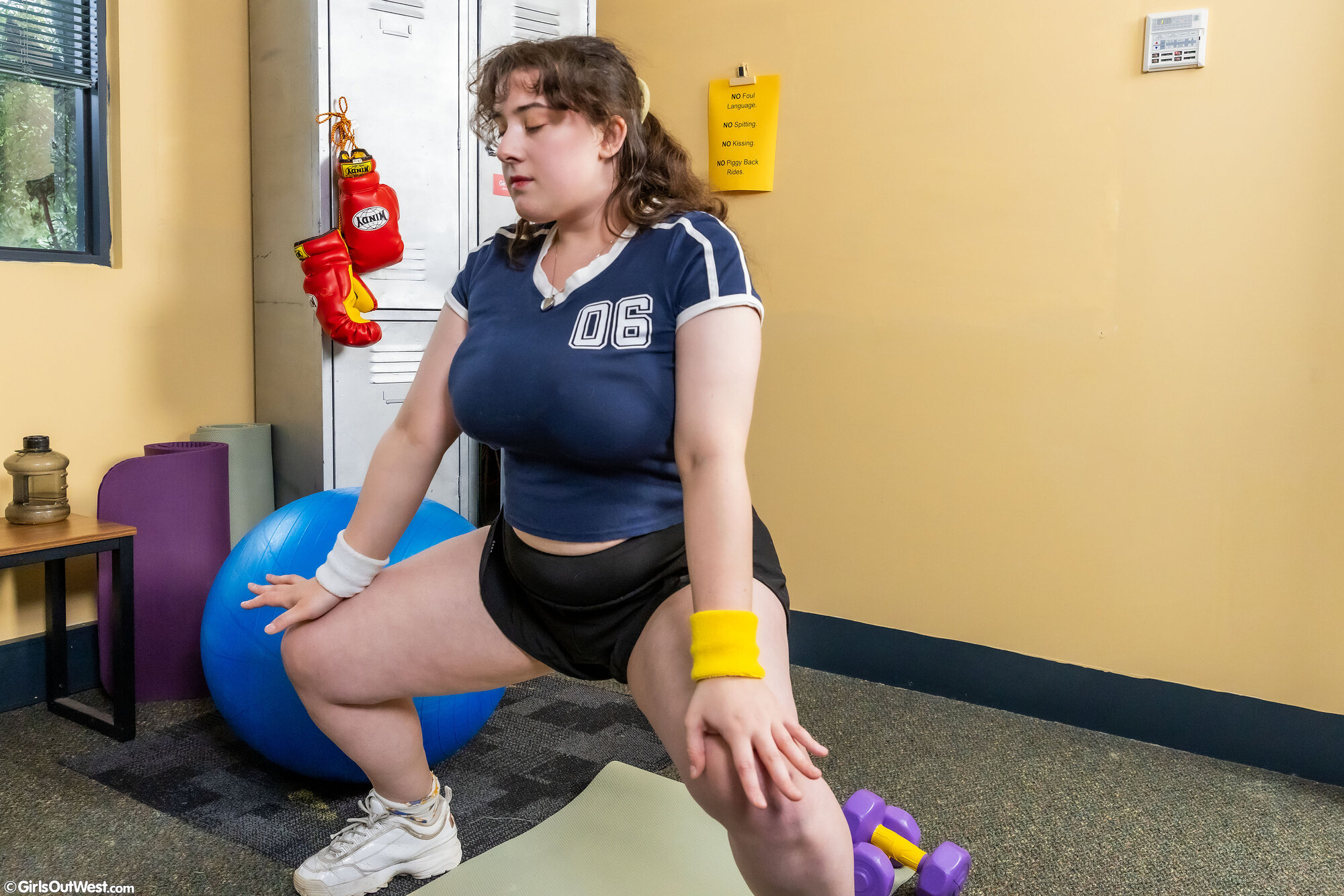 Eleanor moves around the room, stretching and loosening her body, getting ready for a big workout. She’s wearing the cutest little workout fit, but what’s underneath is even sweeter!