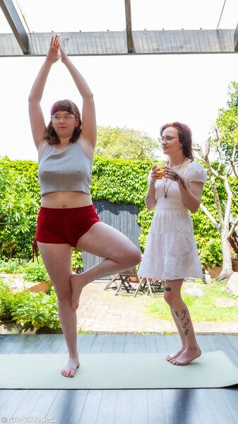 Kirby and Ophelia are chilling out in a beautiful space. Feeling warm and tingly all over they share a kiss and start foreplay.