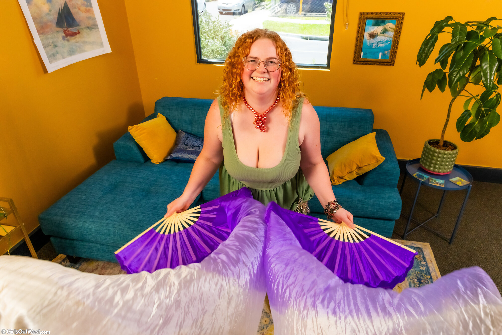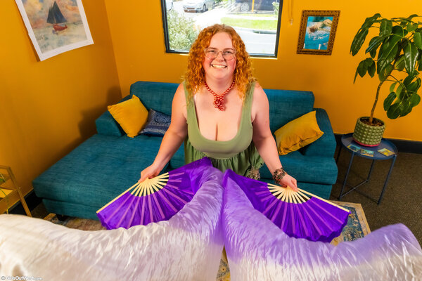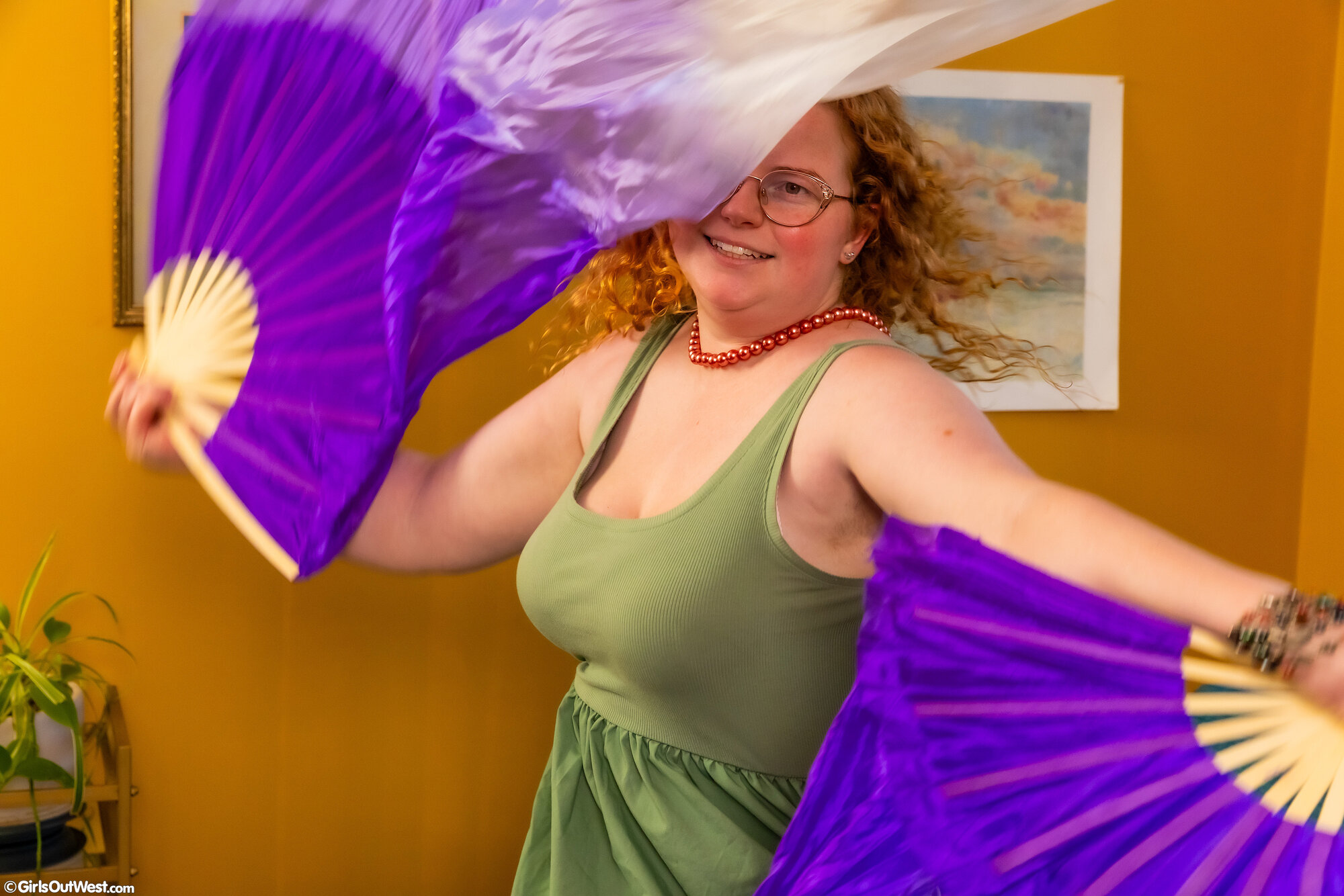 Lizzy likes to entertain and she really brings it on in this fan dance photo set. Her smiling face shines as she twirls around with all the colours swirling around her delicious curvy body.
