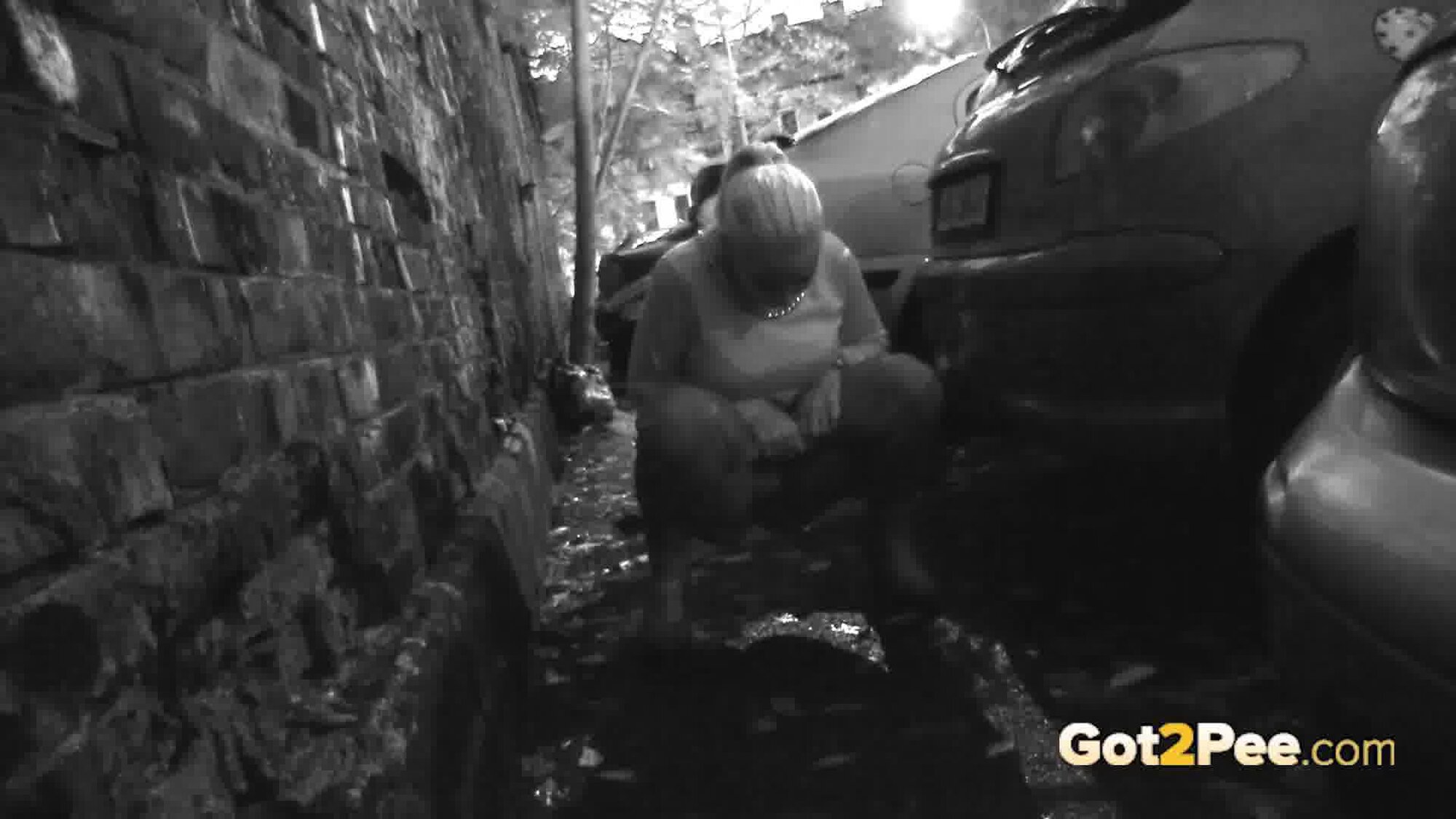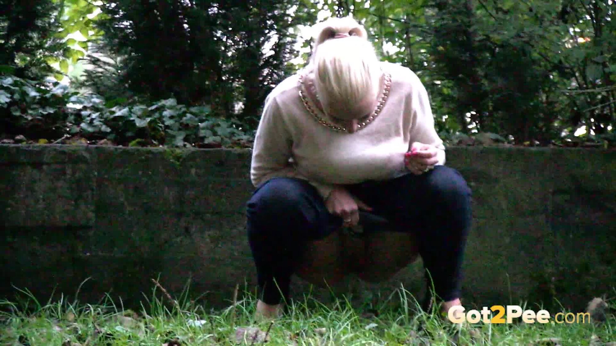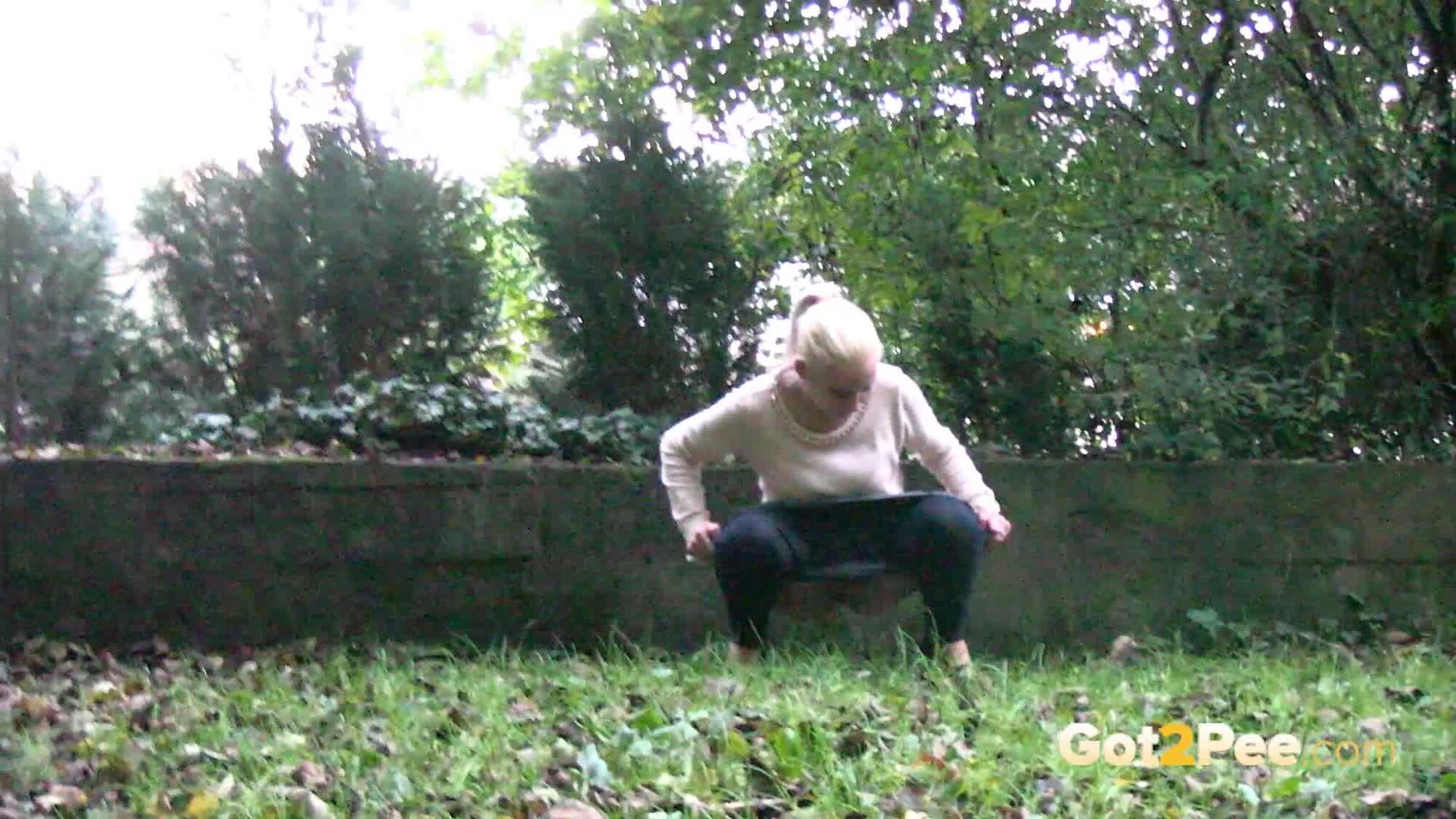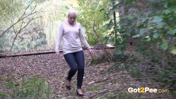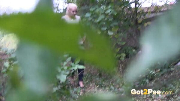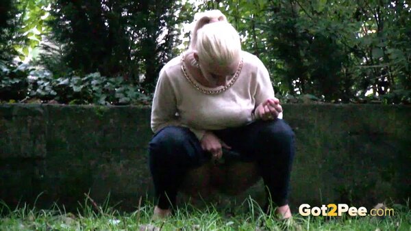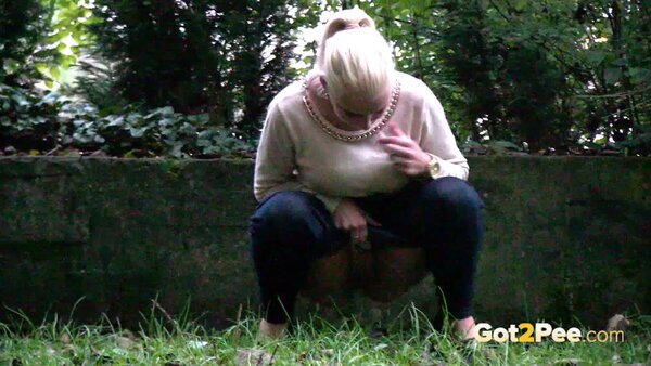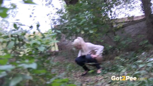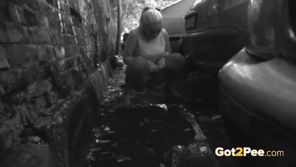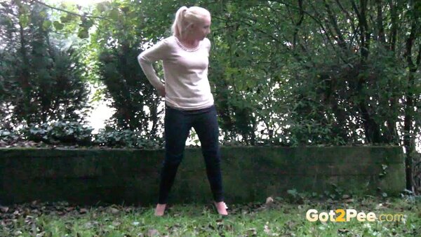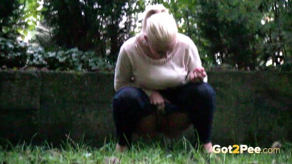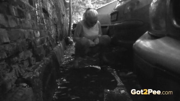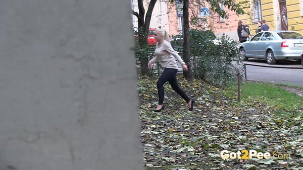 A cute, shy blonde is in the city trying to find somewhere to pee. She tries a few locations, the first being too busy with plenty of people but she manages to relieve herself on the grass and behind a parked car.