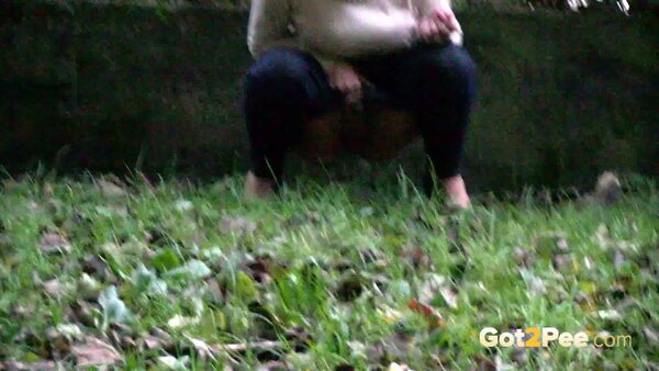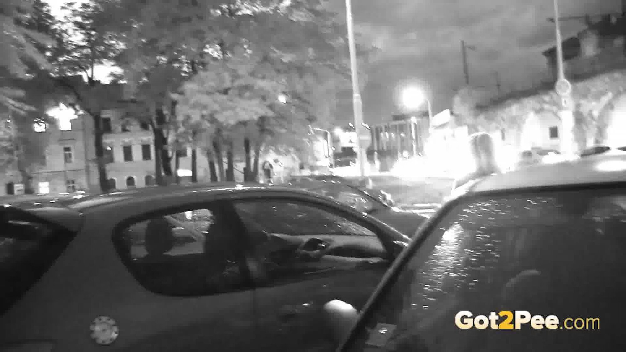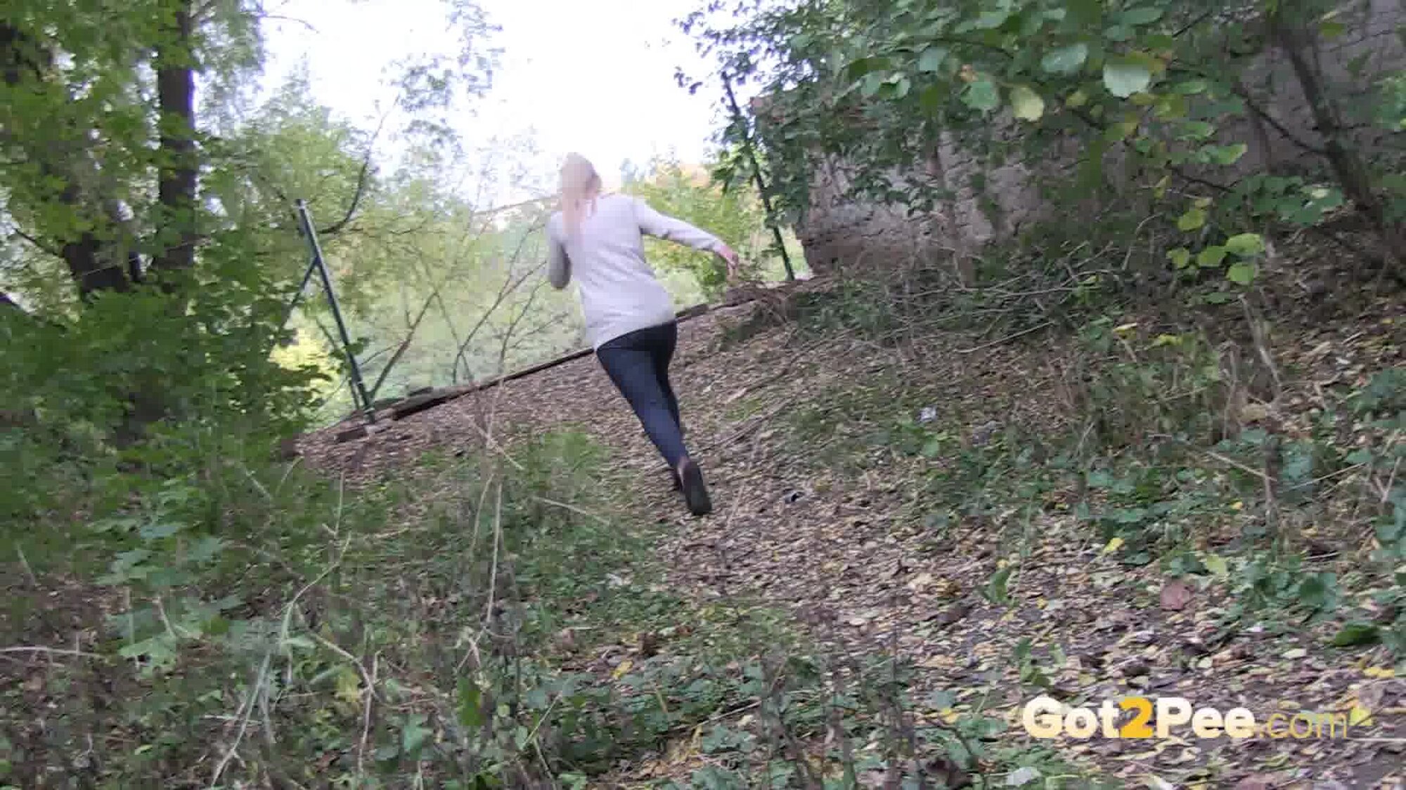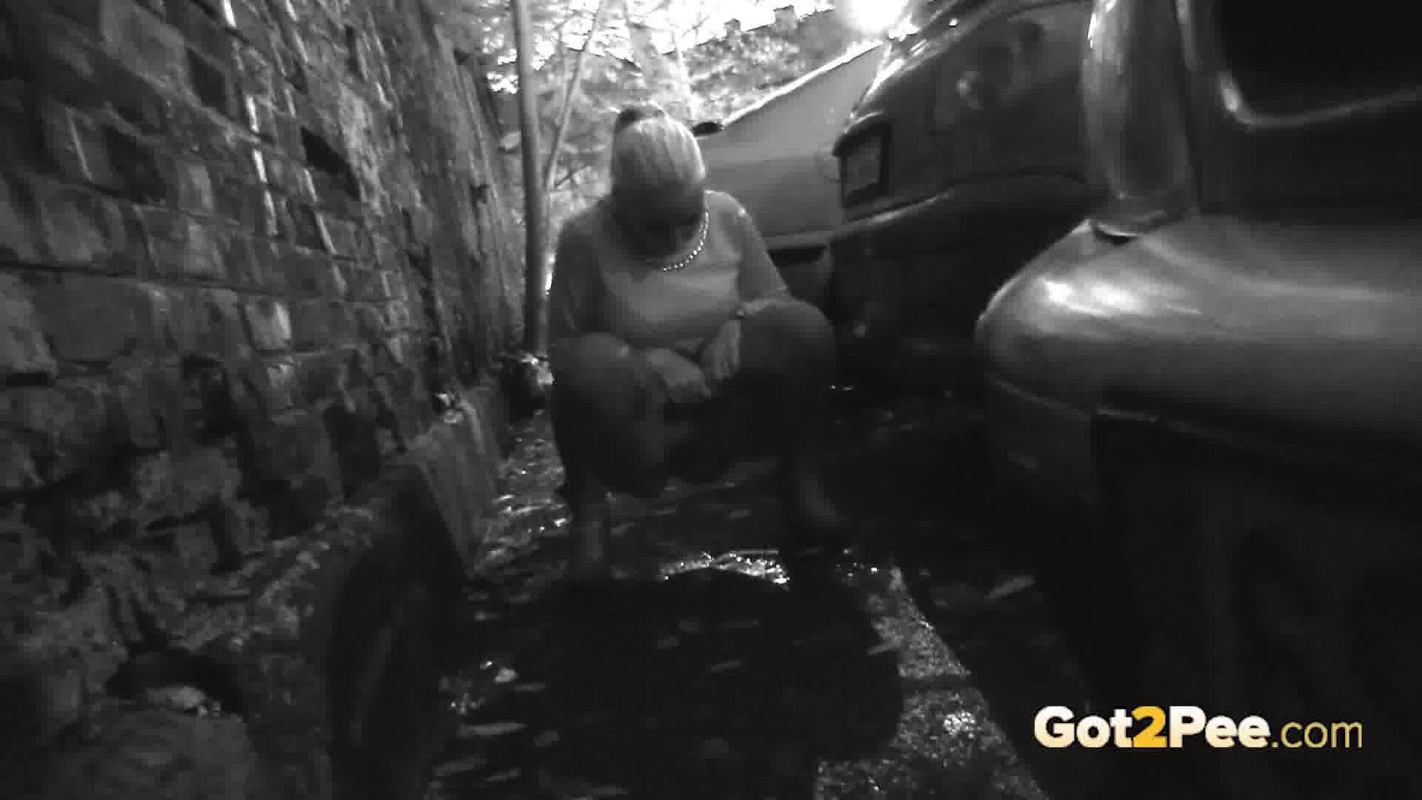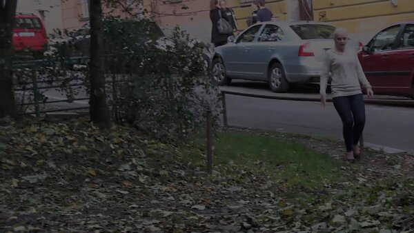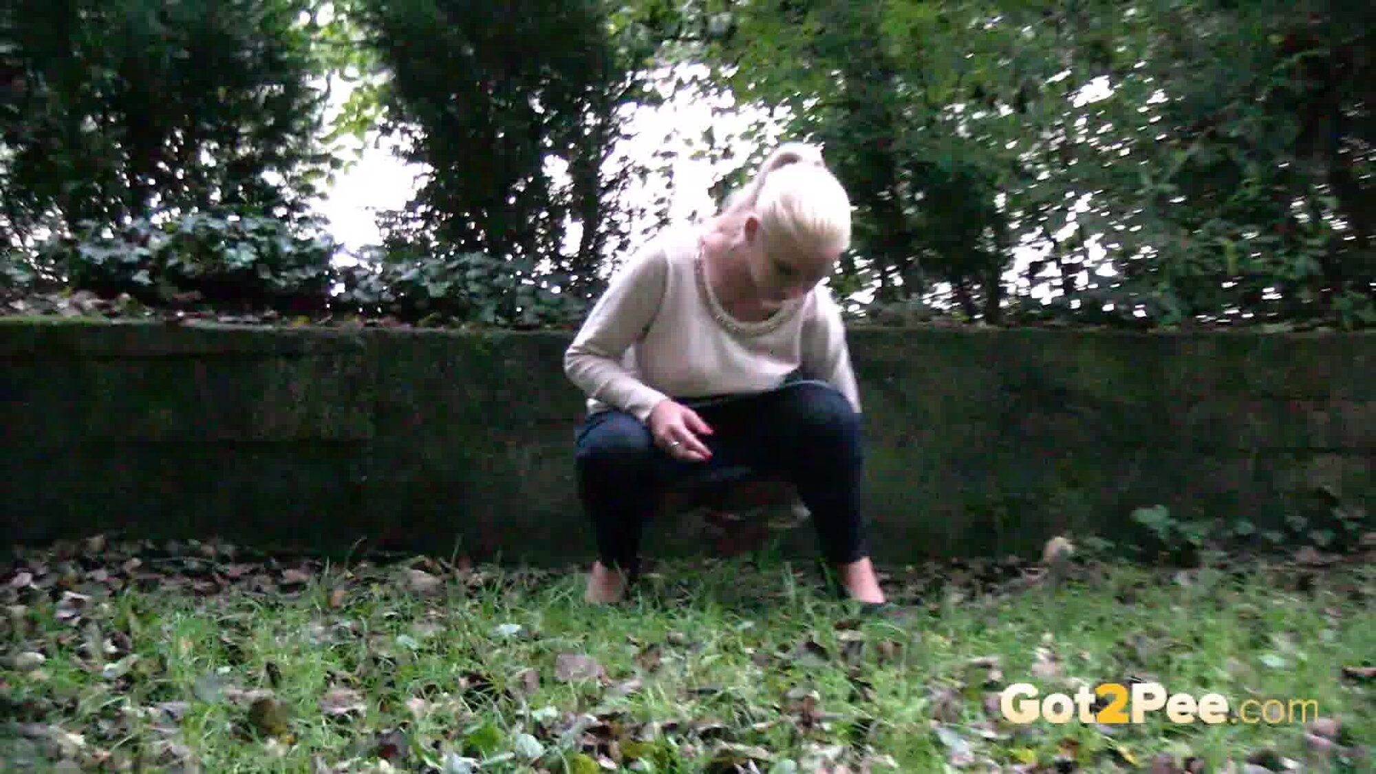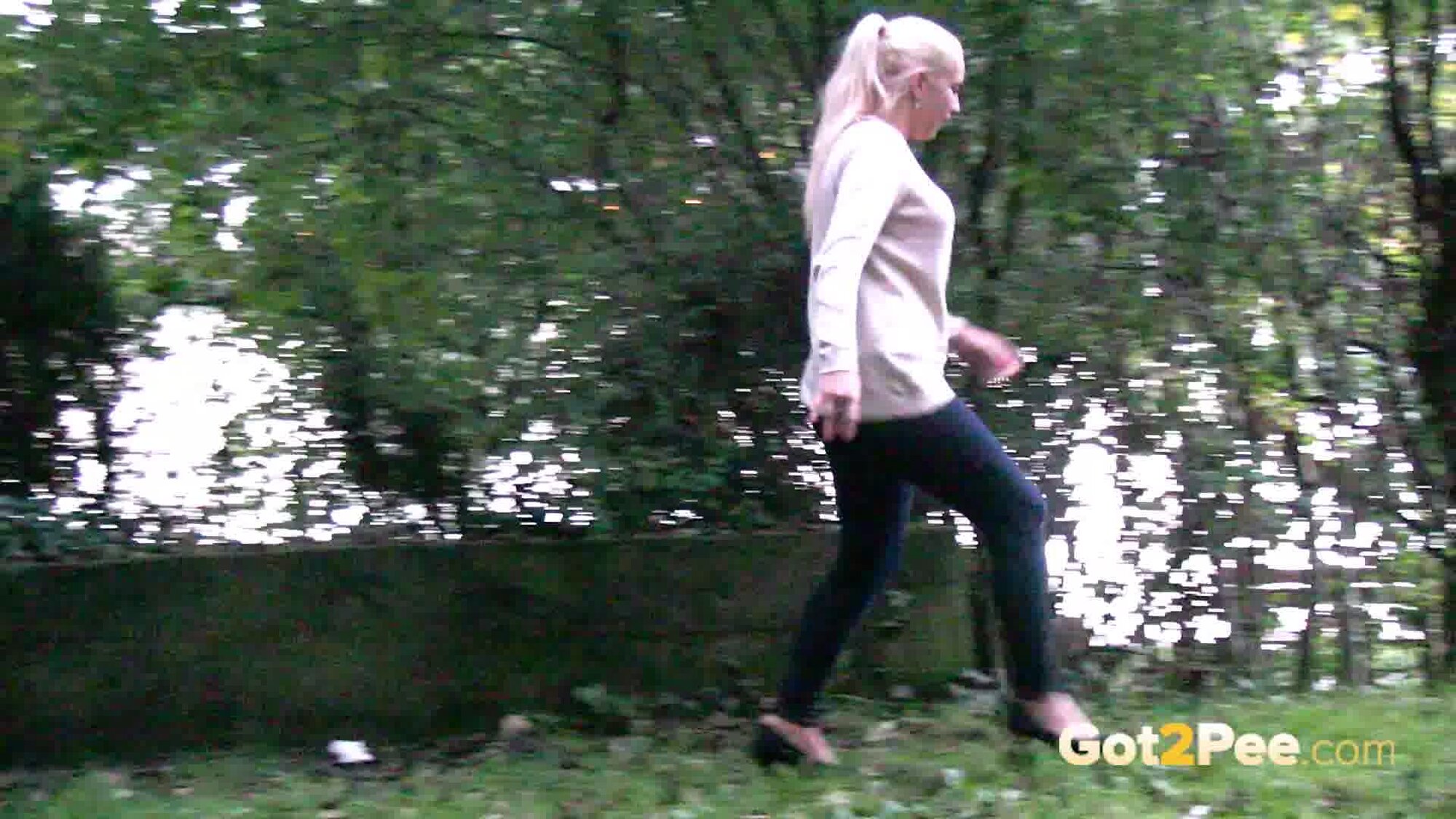 A cute, shy blonde is in the city trying to find somewhere to pee. She tries a few locations, the first being too busy with plenty of people but she manages to relieve herself on the grass and behind a parked car.