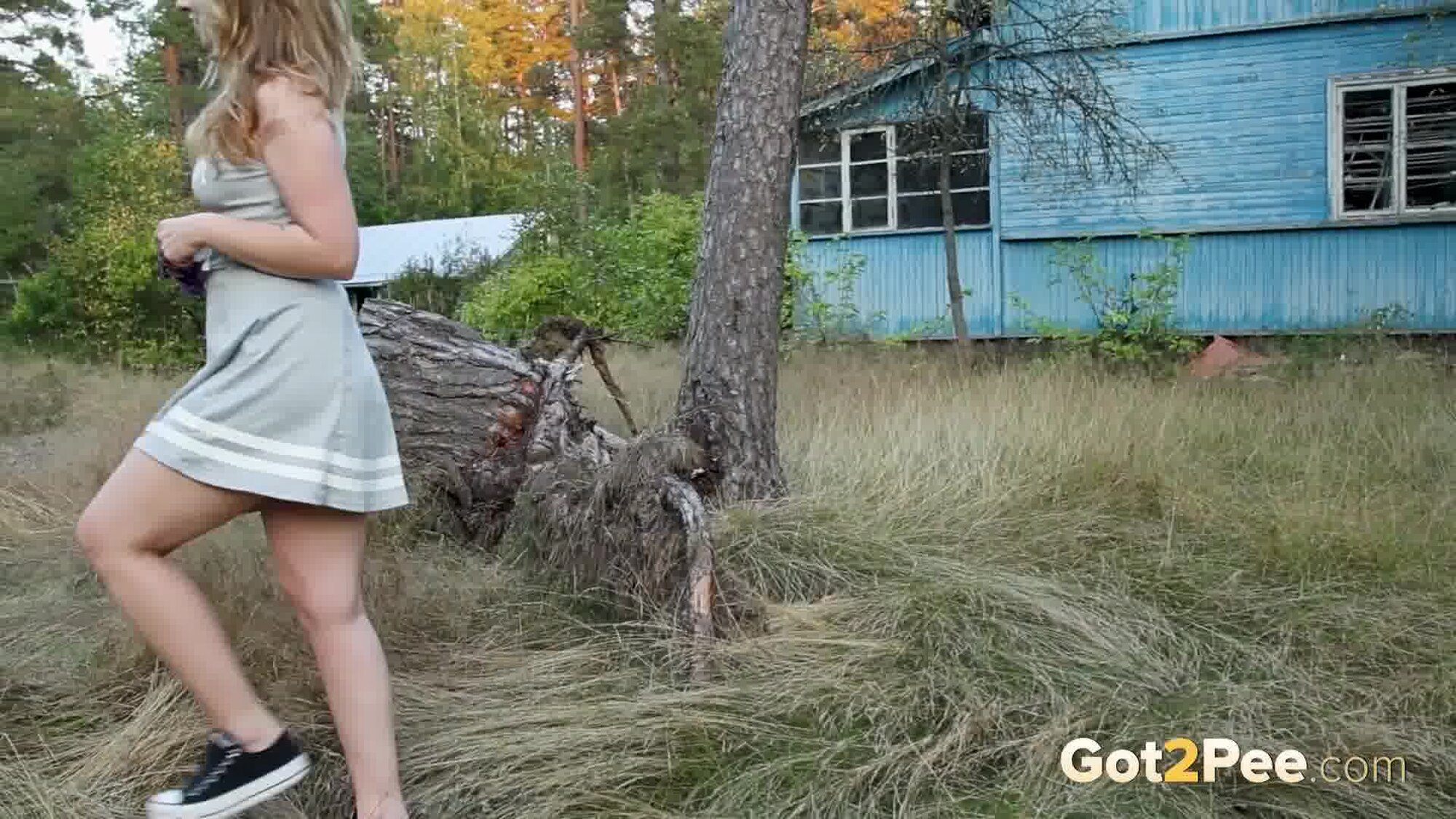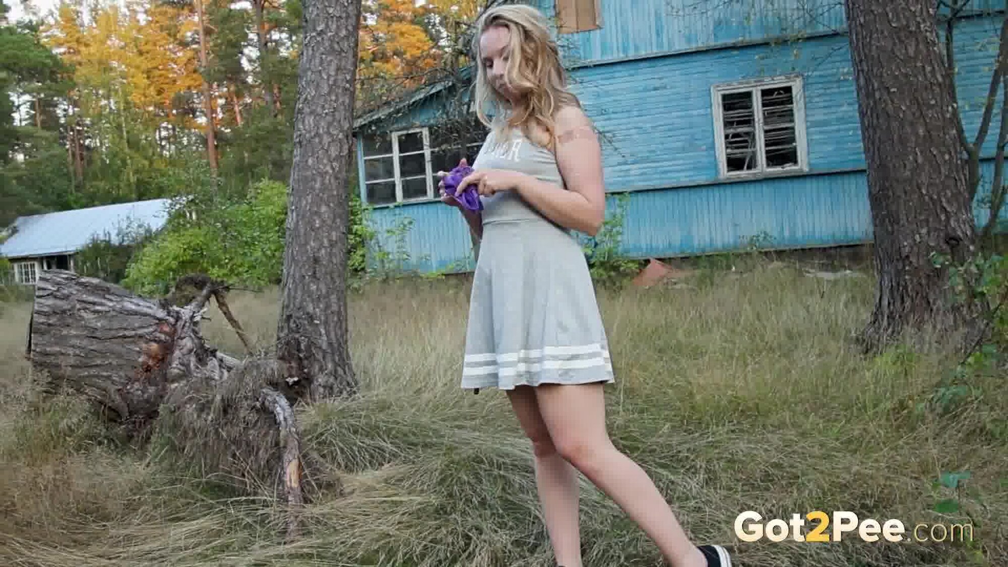 Alice Klay returns to Got2Pee for our latest pissing porno and this slim babe sits down on the grass while stretching her arms in the air. She takes down her hair, followed by her panties before holding herself up with her ass in the air! She starts pissing a straight stream down onto the grass to relieve her pee desperation.