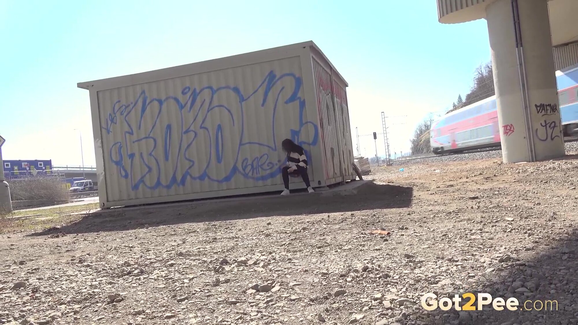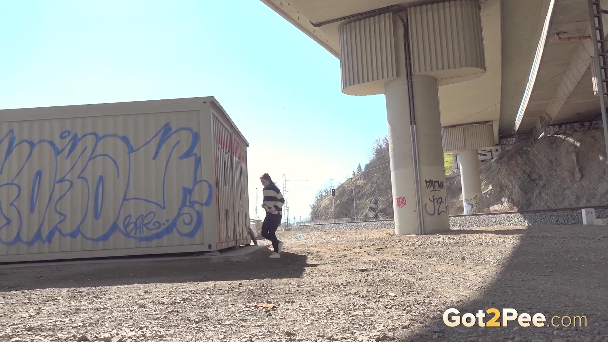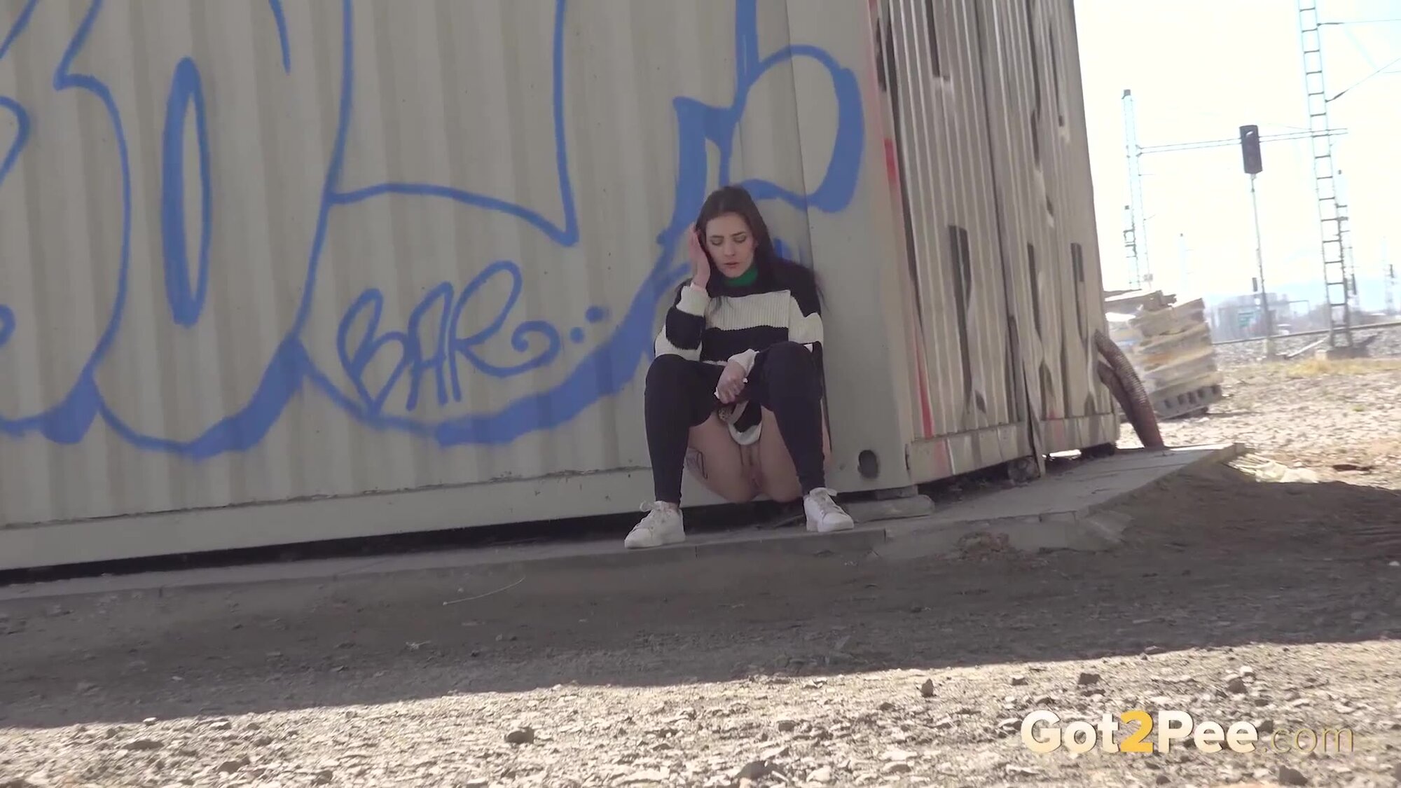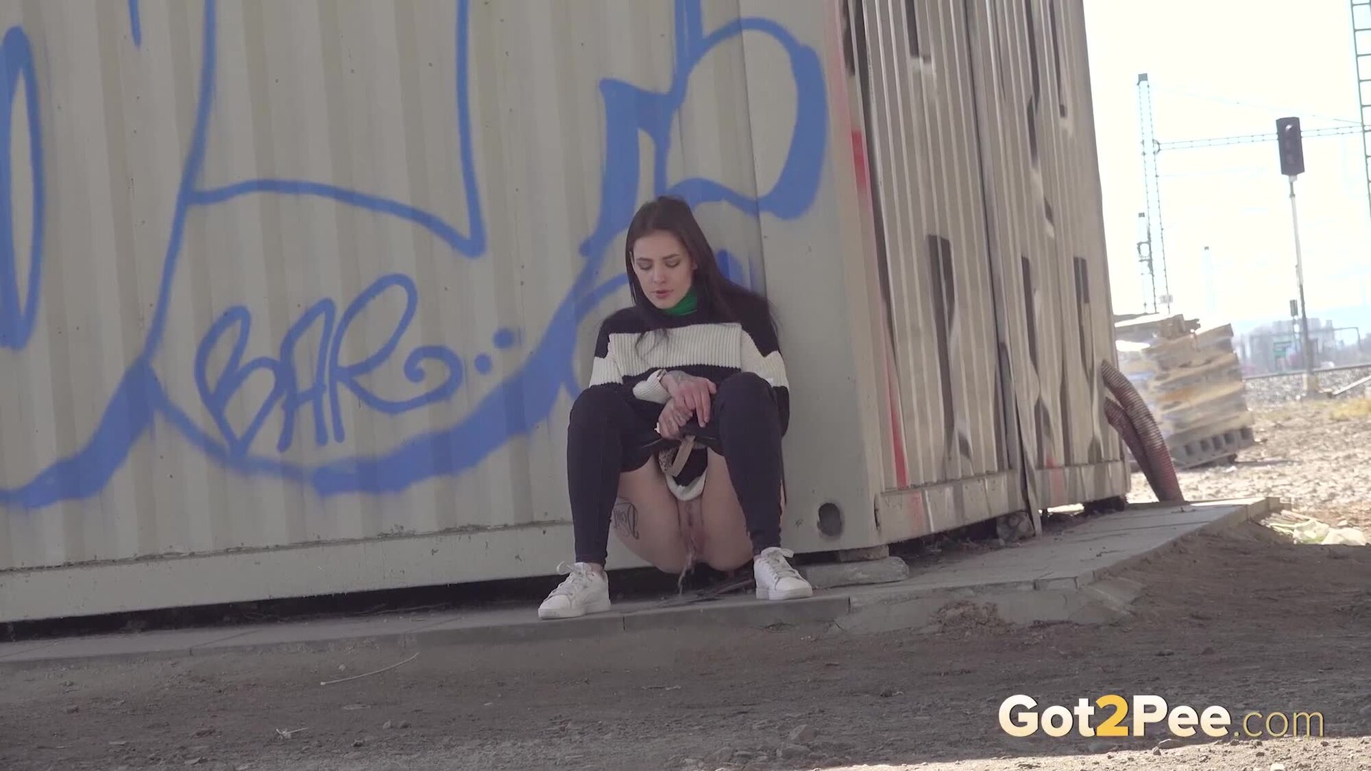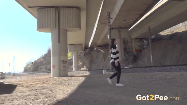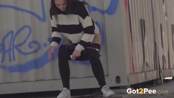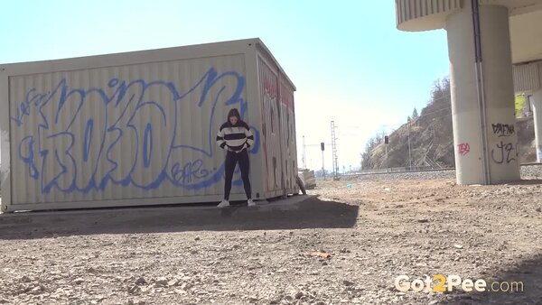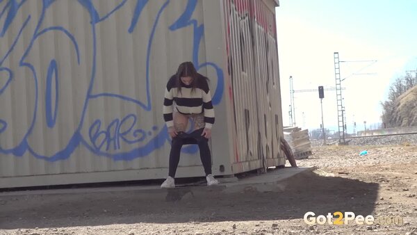 We welcome back Alexa Throat in our newest pissing porno here on Got2Pee as she rushes away from the railway line to find somewhere to relieve her piss desperation. She stops behind a container and squatting to pee, sprays a neat stream of piss down onto the concrete below.