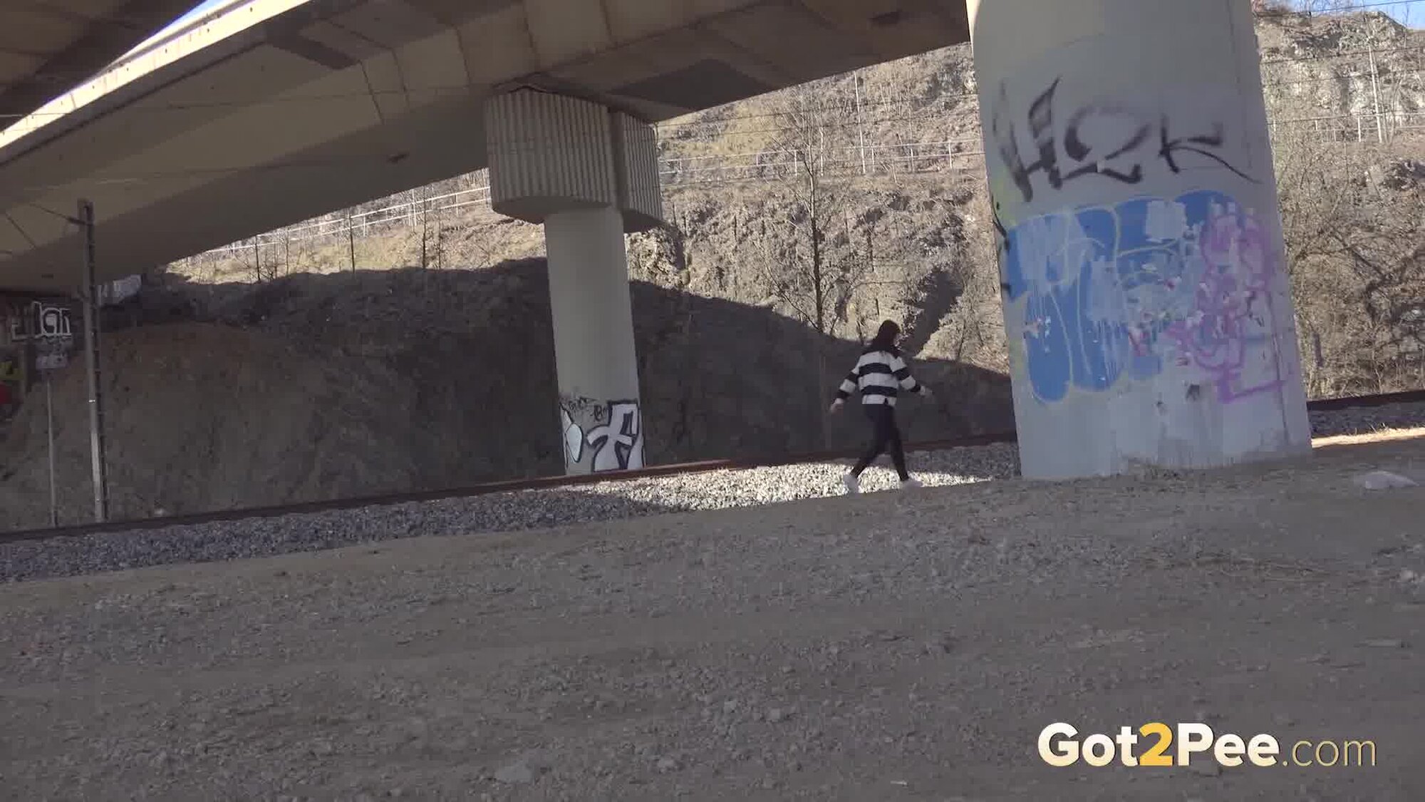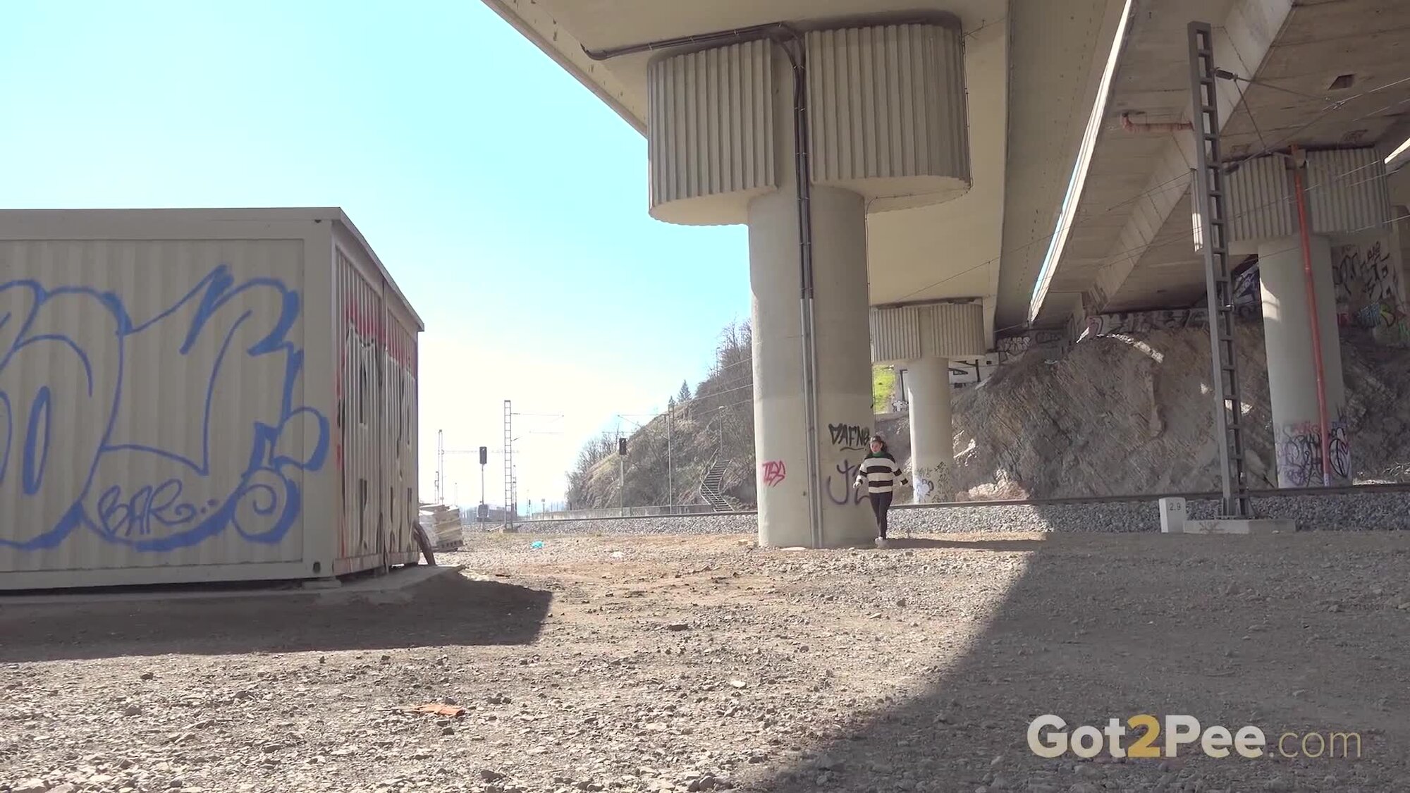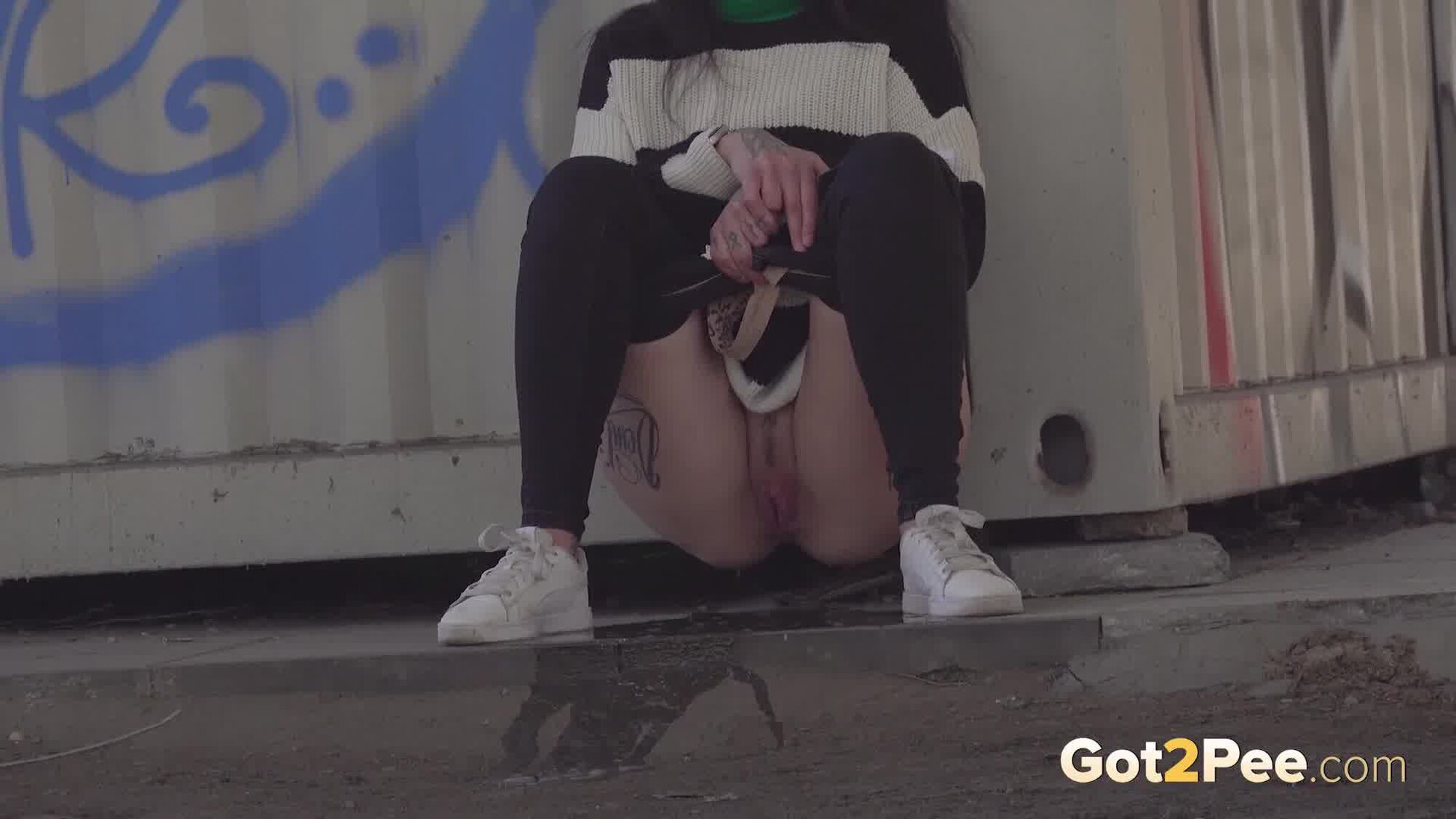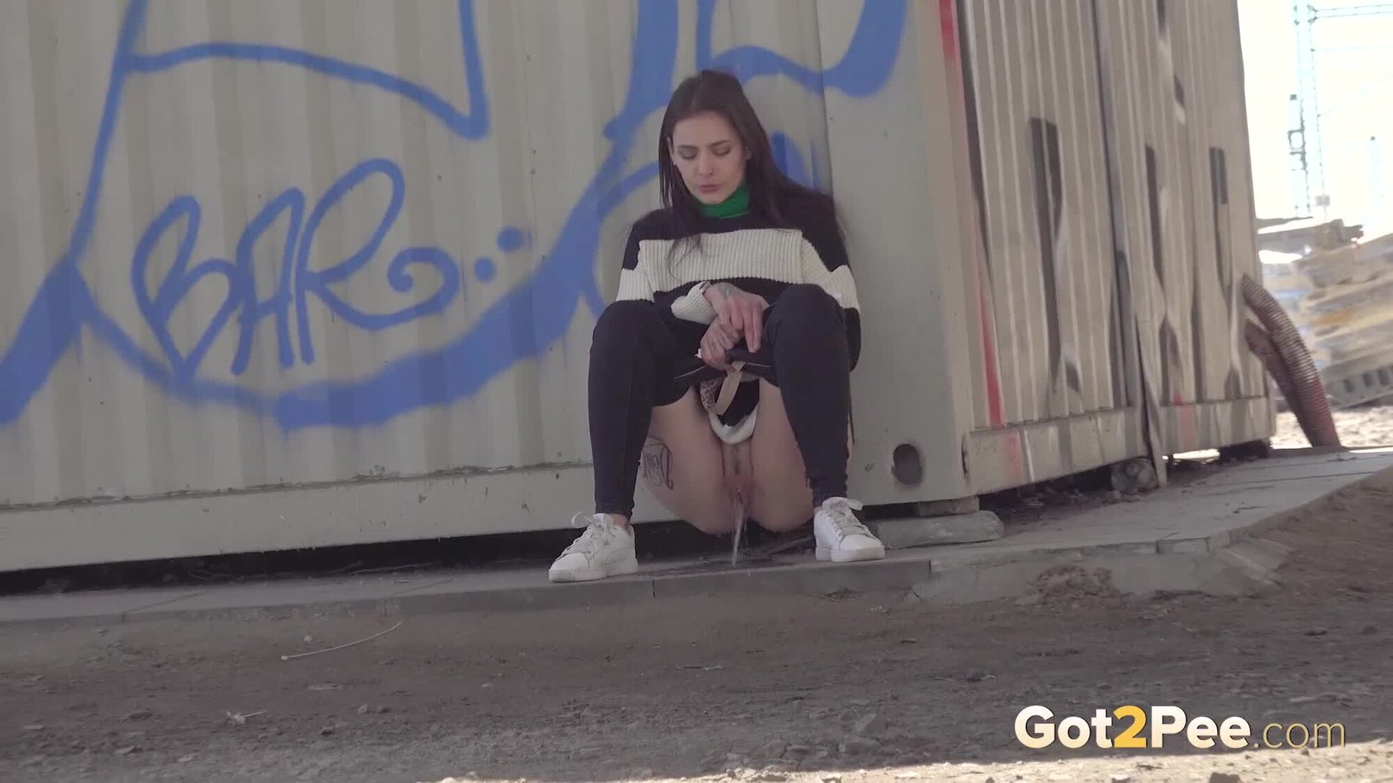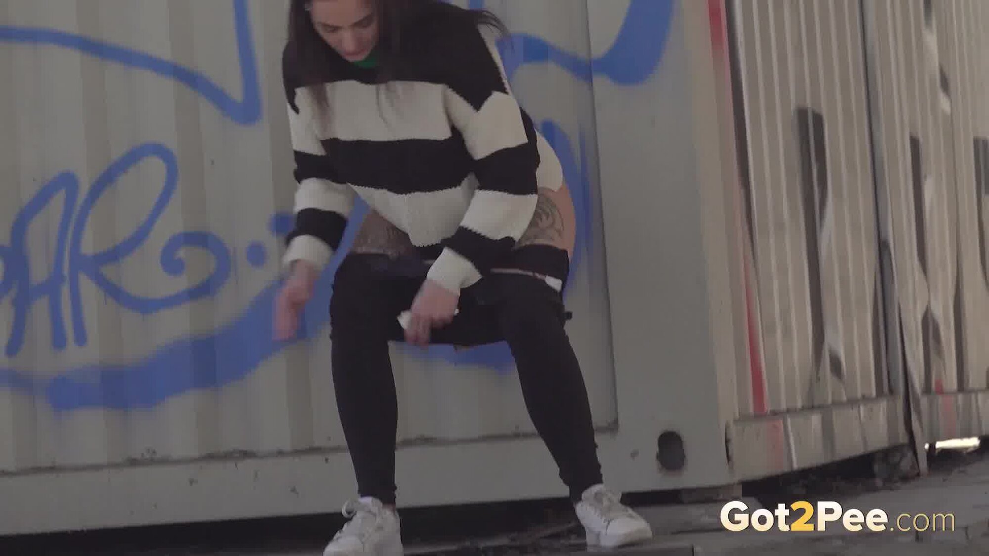 We welcome back Alexa Throat in our newest pissing porno here on Got2Pee as she rushes away from the railway line to find somewhere to relieve her piss desperation. She stops behind a container and squatting to pee, sprays a neat stream of piss down onto the concrete below.