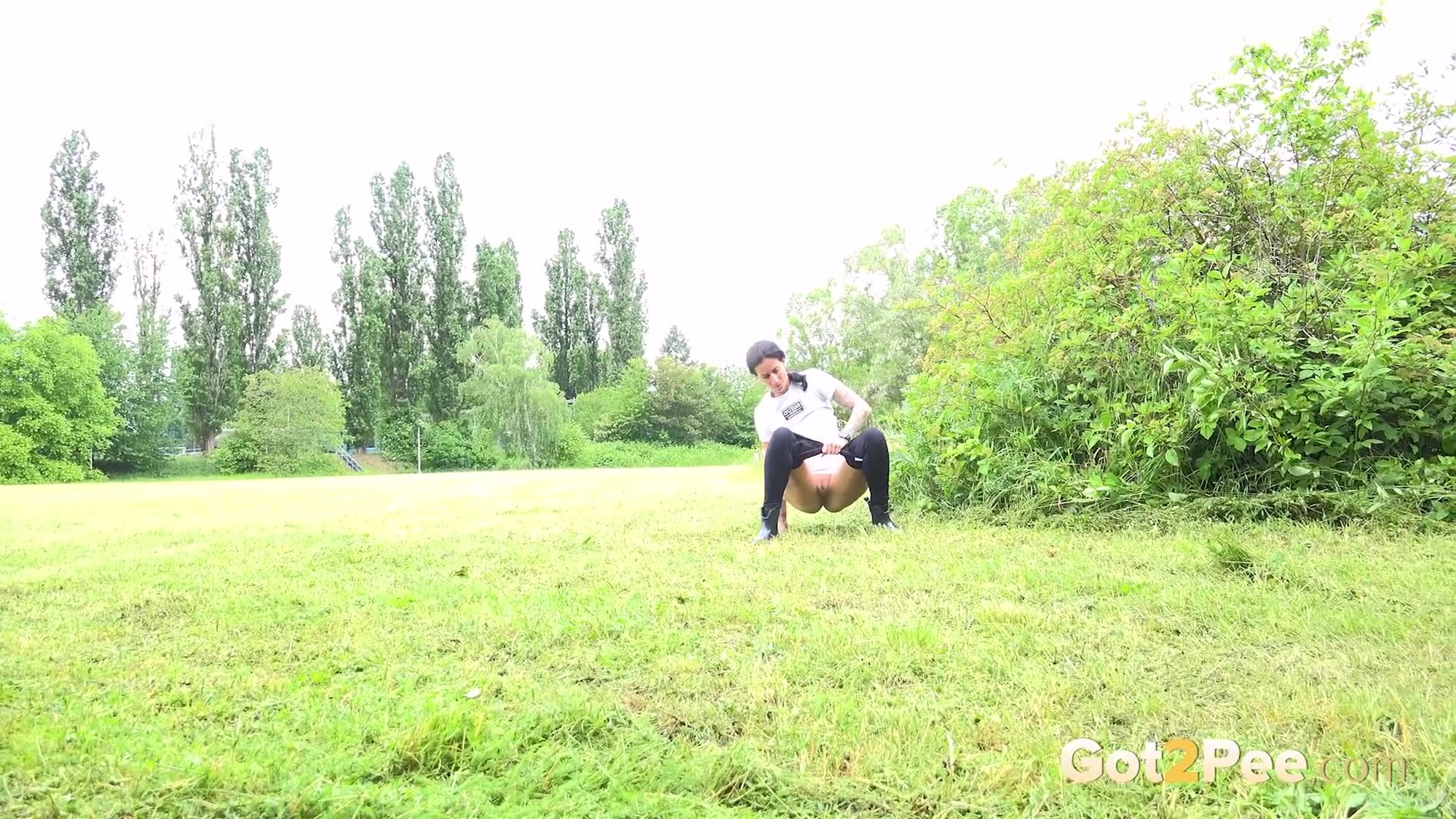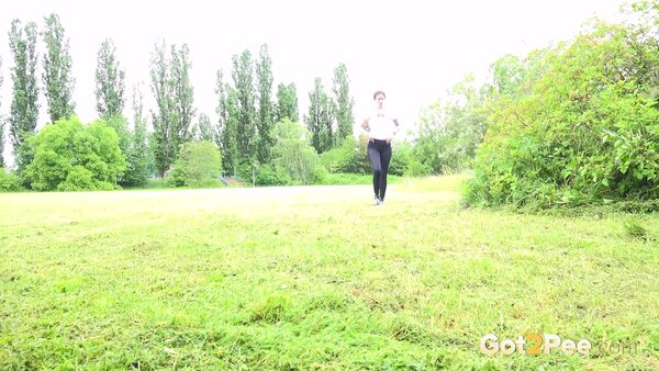 Dark haired babe Ali B walks across a field while being filmed in the suburbs. She pulls down her leggings and squatting to pee, sprays her golden streams down onto the grass. We zoom in close to capture the action in our latest Got2Pee pissing porno!