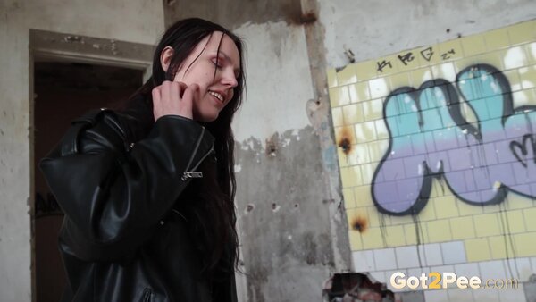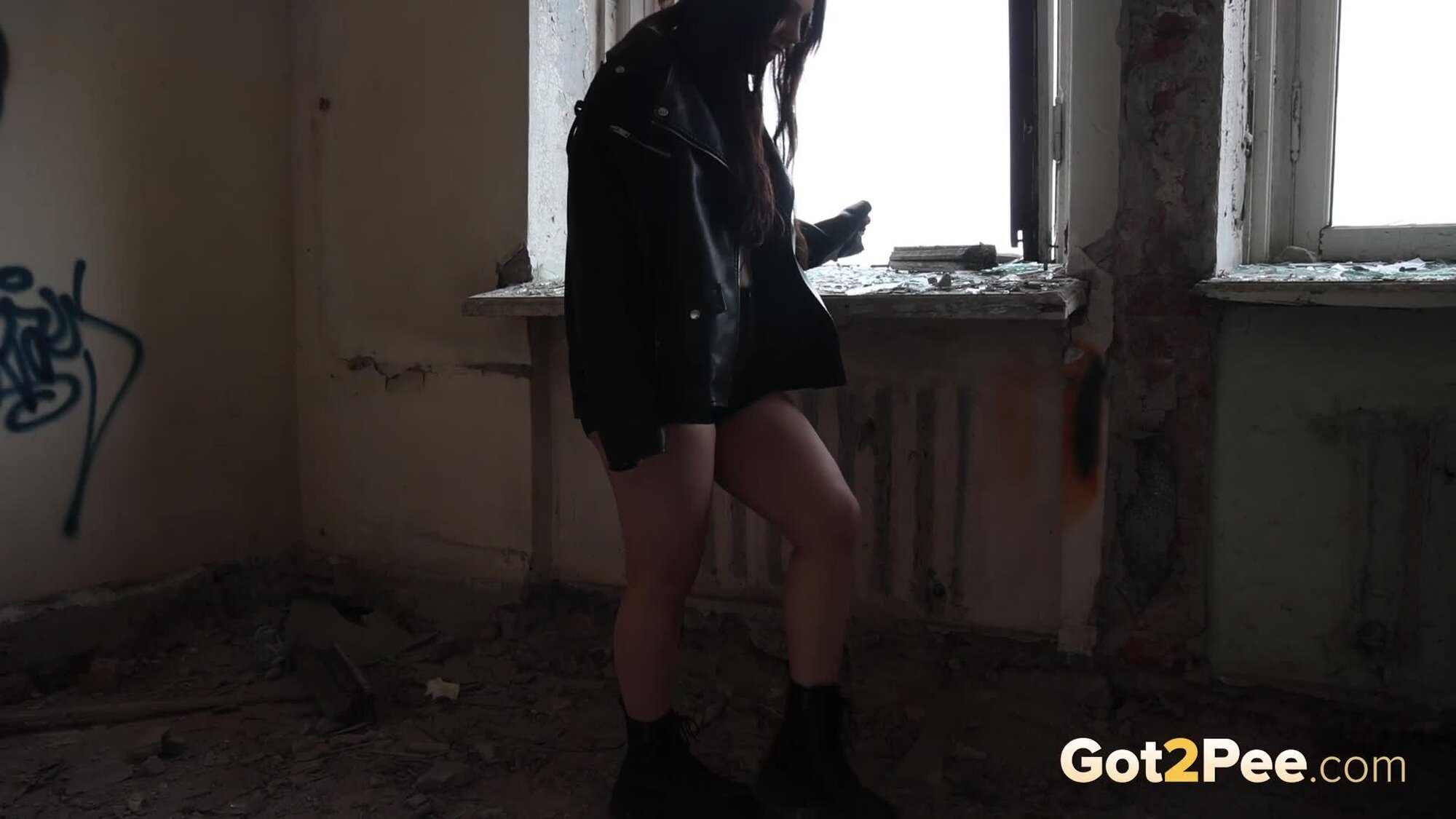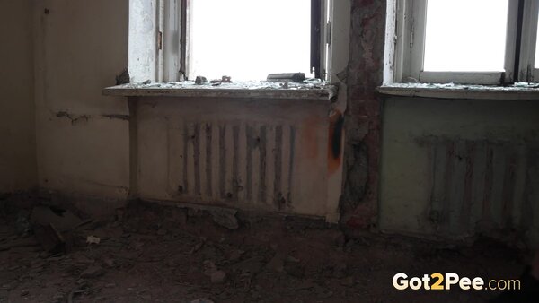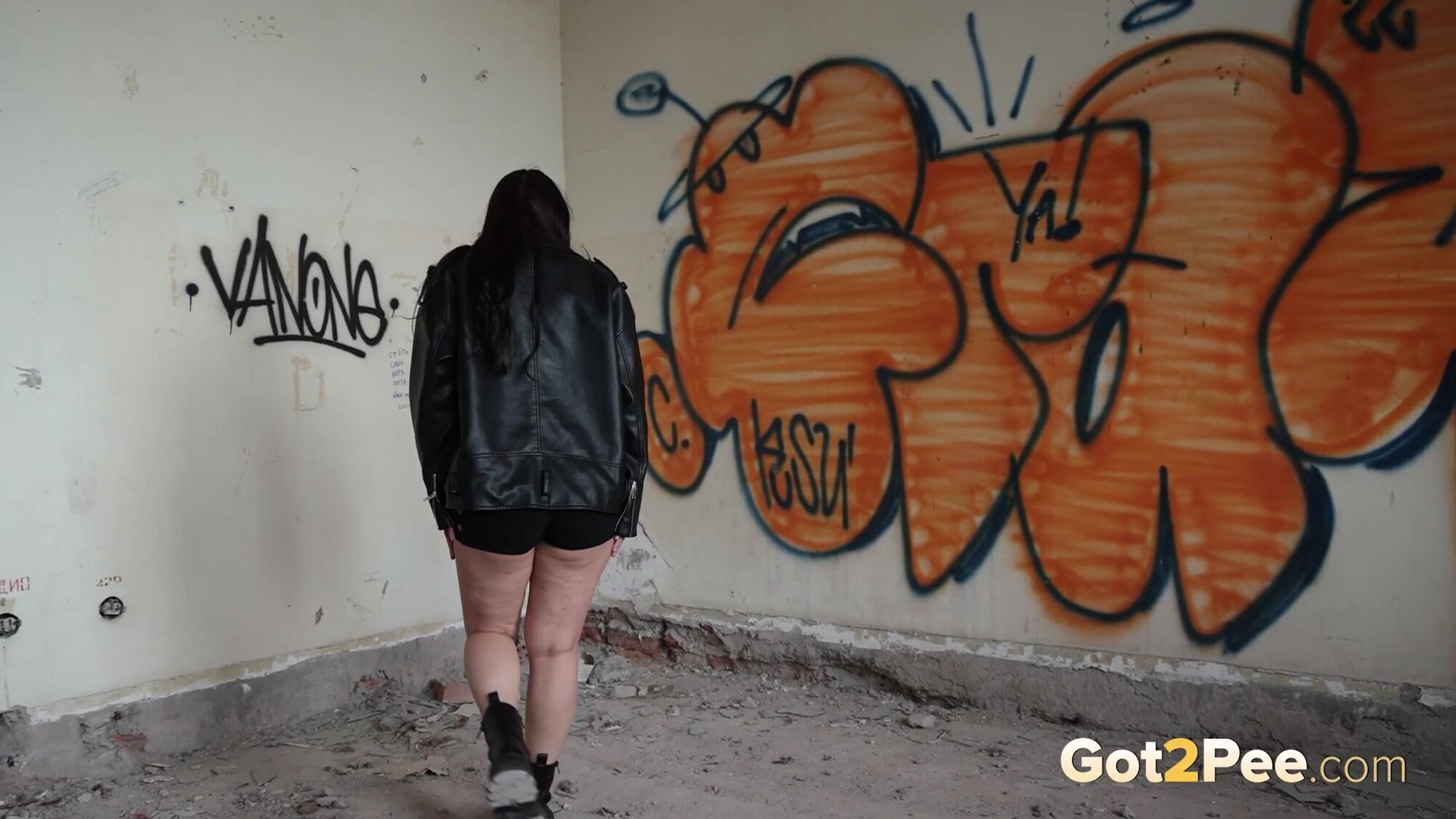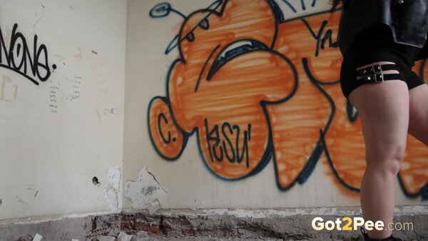 Today on Got2Pee watch as Violet Rilz walks into a graffiti covered abandoned building. She holds onto her crotch and really needs to relieve her piss desperation so pulls down her hotpants before squatting to pee. Violet sprays down onto the concrete beneath her and looks very relieved in the process!