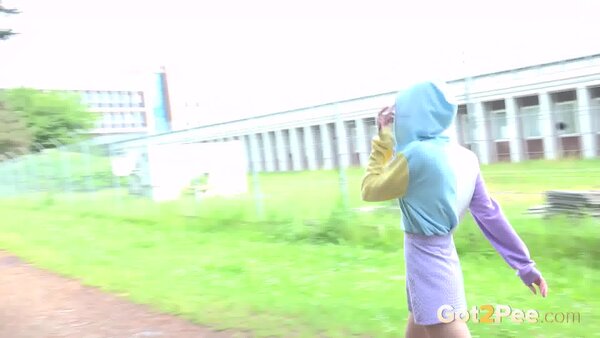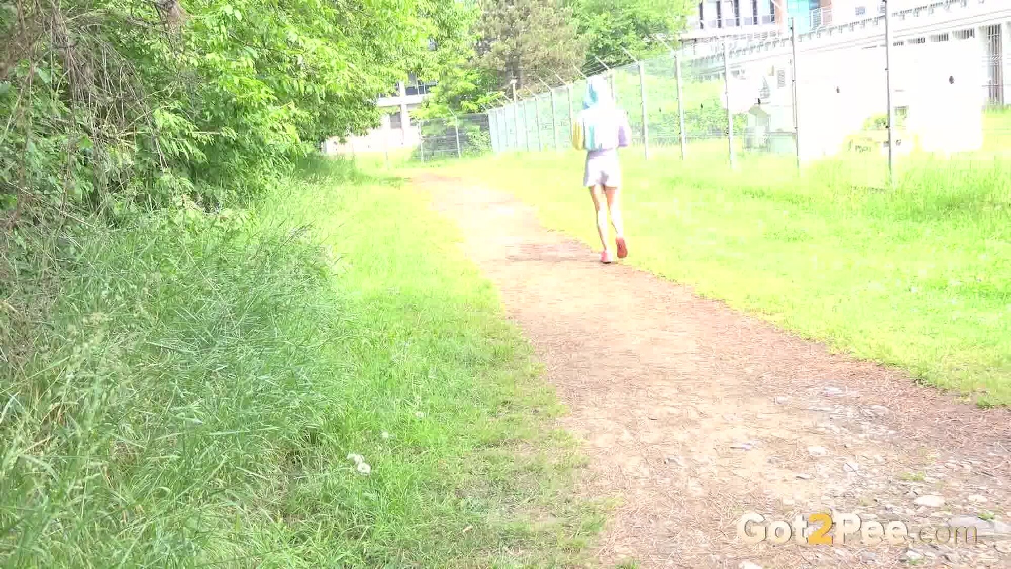 Brunette cutie Dragon Fruit holds onto her crotch as she walks down a path in the suburbs. She stops near a tree and lifts up her miniskirt, revealing she isn't wearing any panties. Dragon Fruit is filmed squatting to pee and gushes all over the ground in our newest Got2Pee pissing porno.
