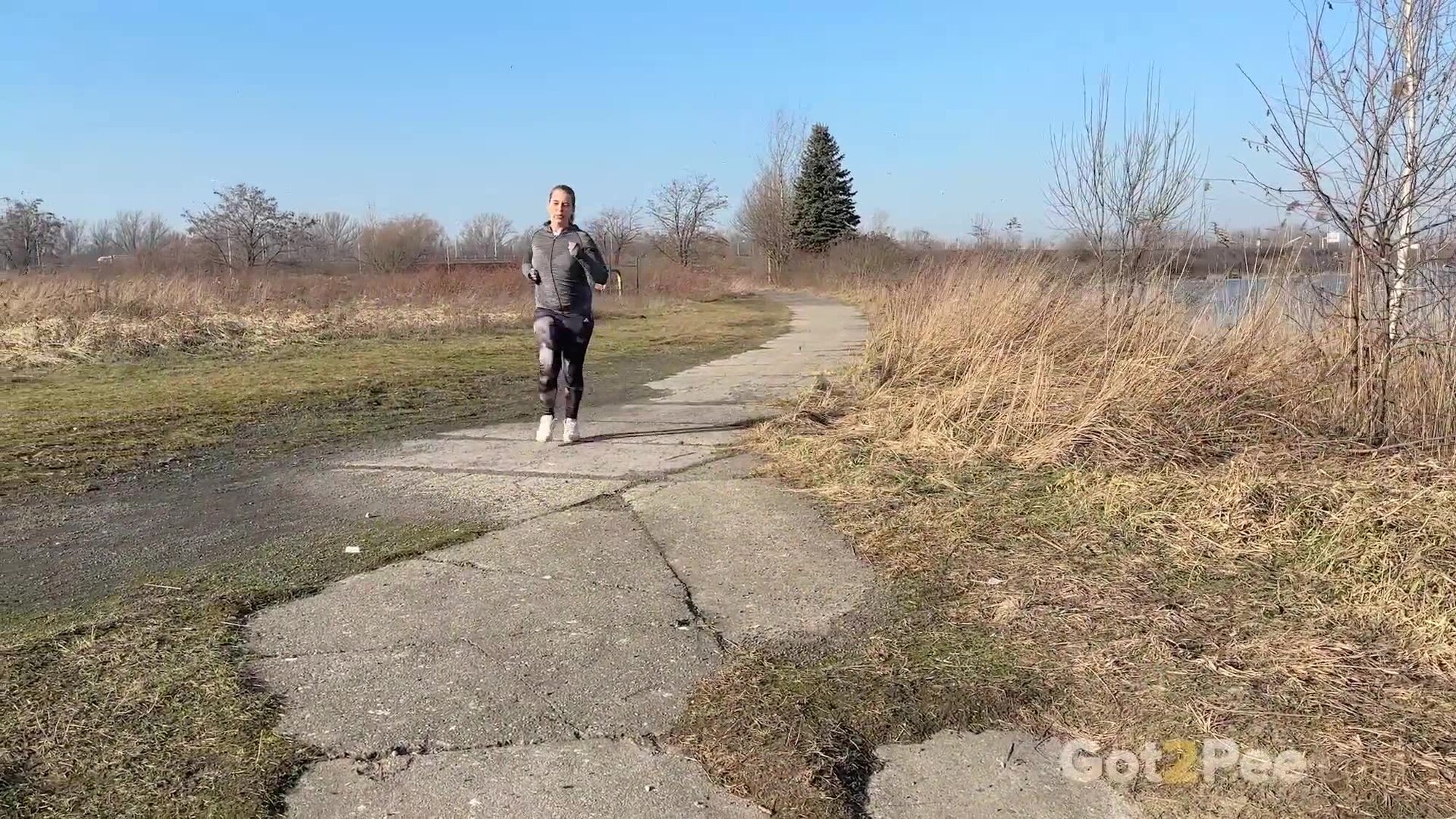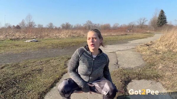 A European babe is out for a jog when she needs to stop and relieve her piss desperation. She pulls down her gym leggings and balances on her tiptoes while squatting to pee. We film this hottie as she lets her golden juices flow down onto the ground and leaves behind her mark in this pissing porno.