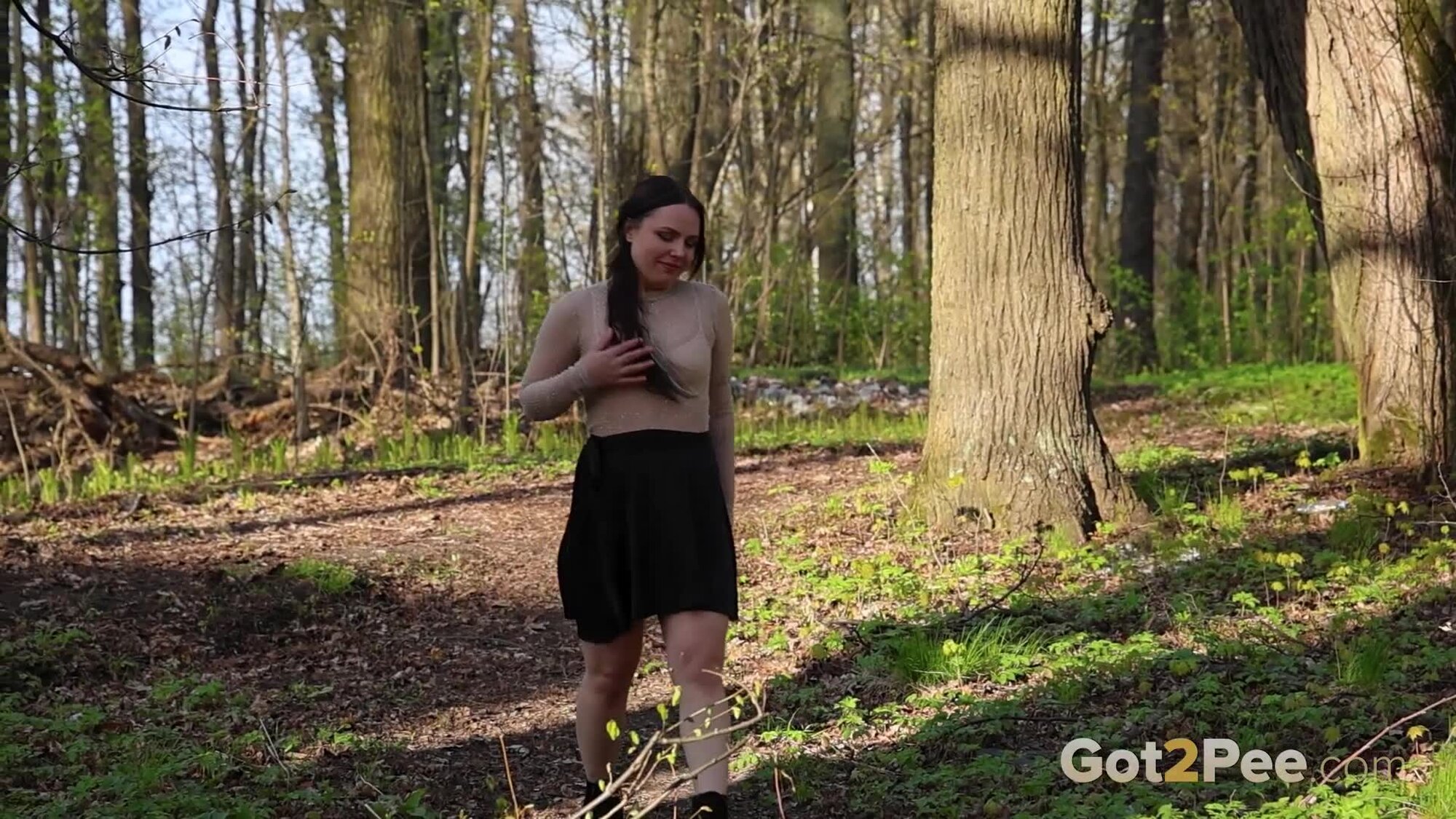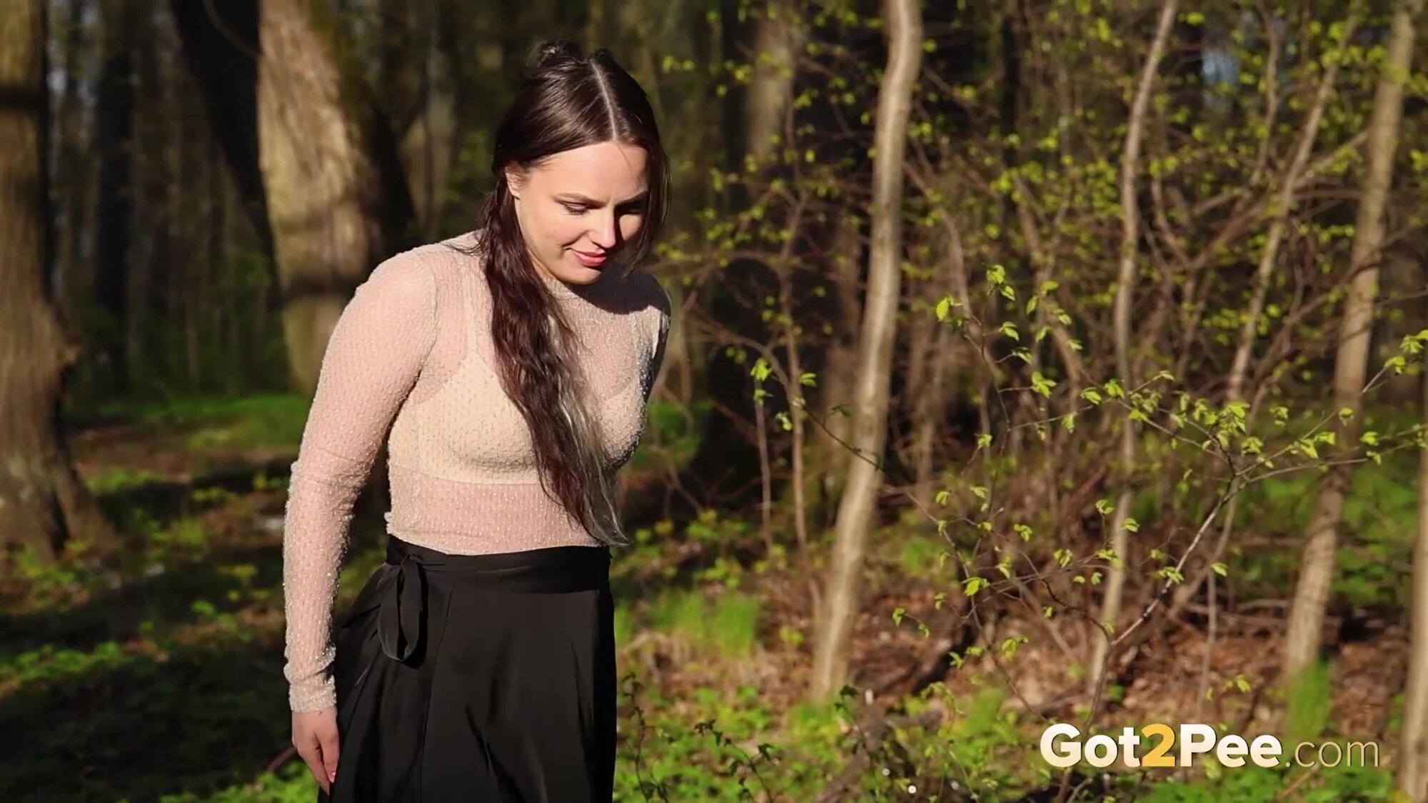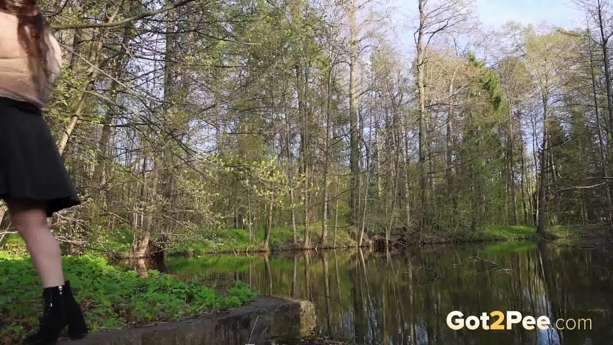 Violet Rilz returns to Got2Pee as she takes a stroll through open woodland. She looks around and decides to stop next to a lake where she lifts up her minidress and pulls down her panties. Squatting to pee, Violet holds onto her panties as a straight stream of golden piss flows down onto the ground. We zoom in close for our latest pissing porno before Violet wipes herself clean.