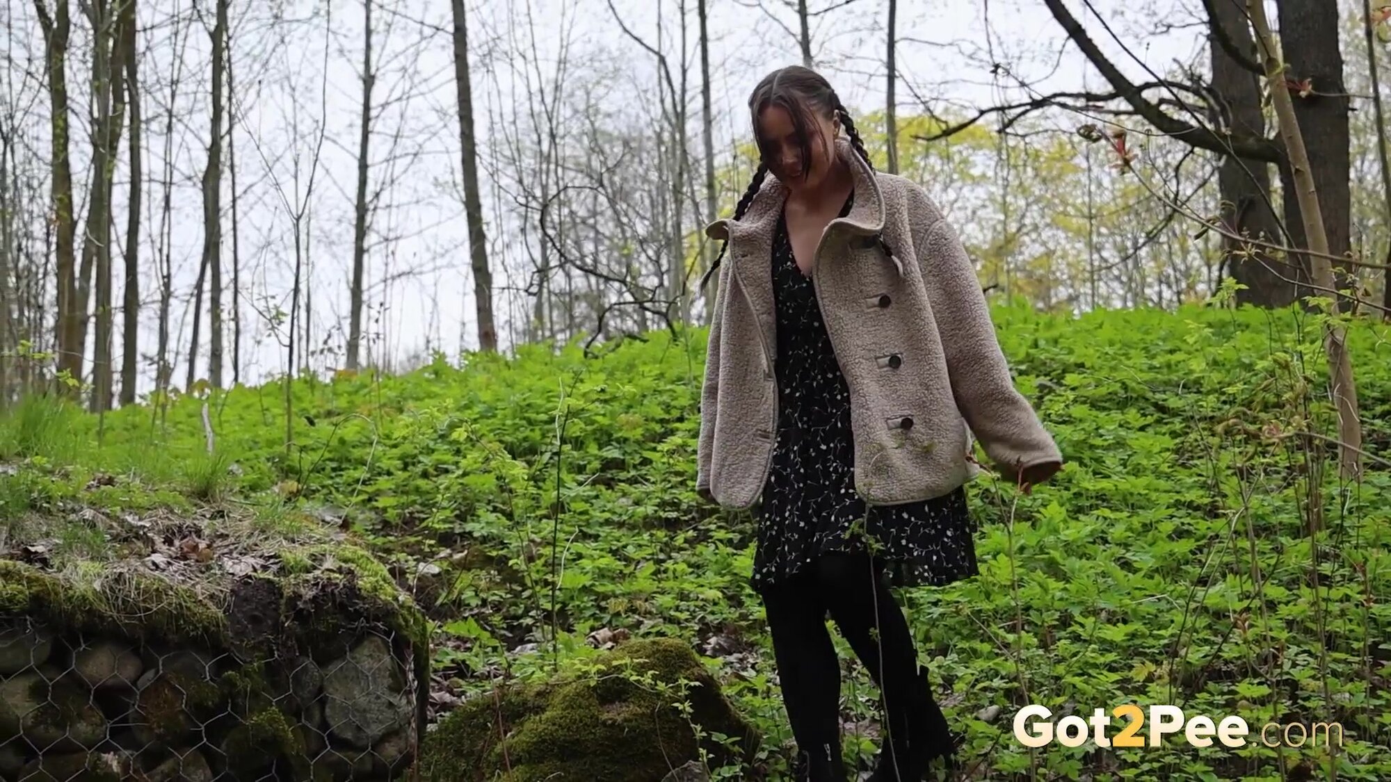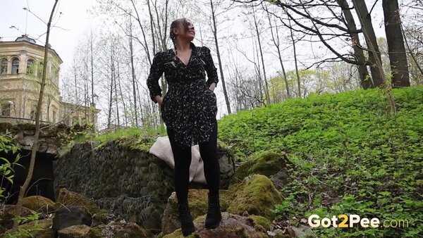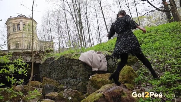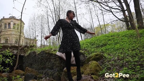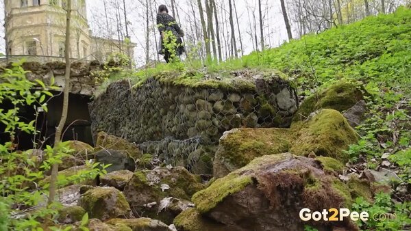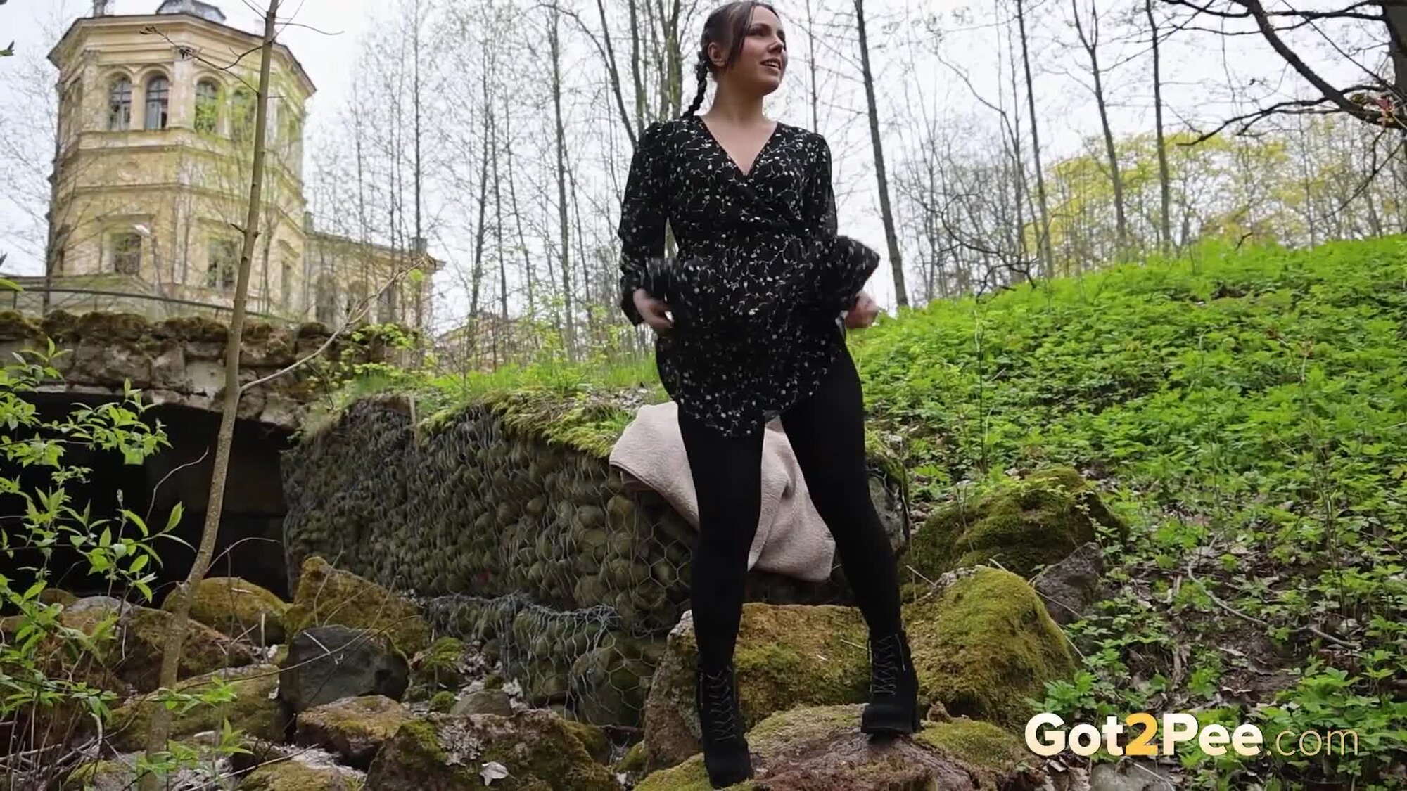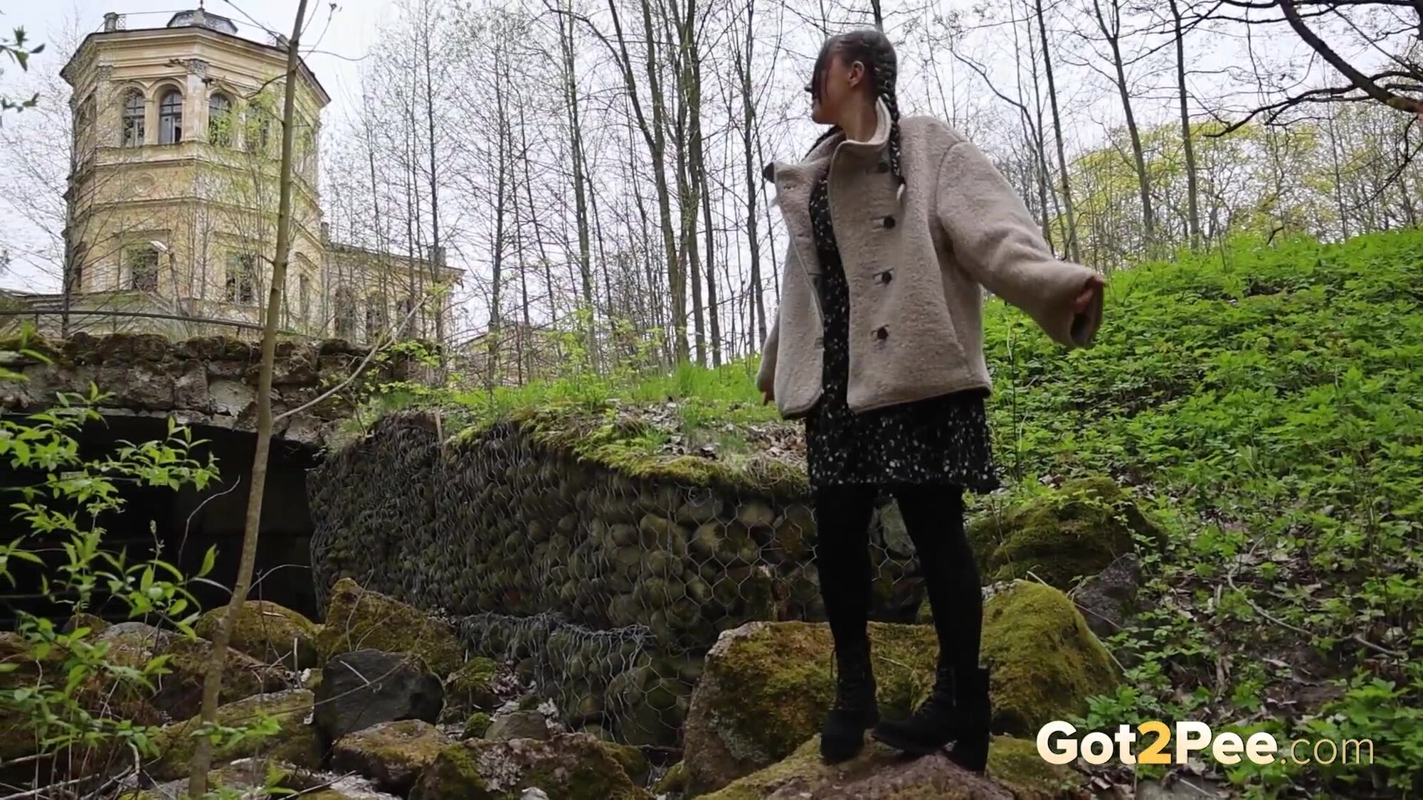 Pigtailed cutie Violet Rilz walks down to a brook and takes off her jacket. She pulls down her pantyhose and squatting to pee, keeps a lookout while releasing her golden juices over the edge of a moss covered rock. We zoom in close to capture her messy pee for our newest Got2Pee pissing porn video.