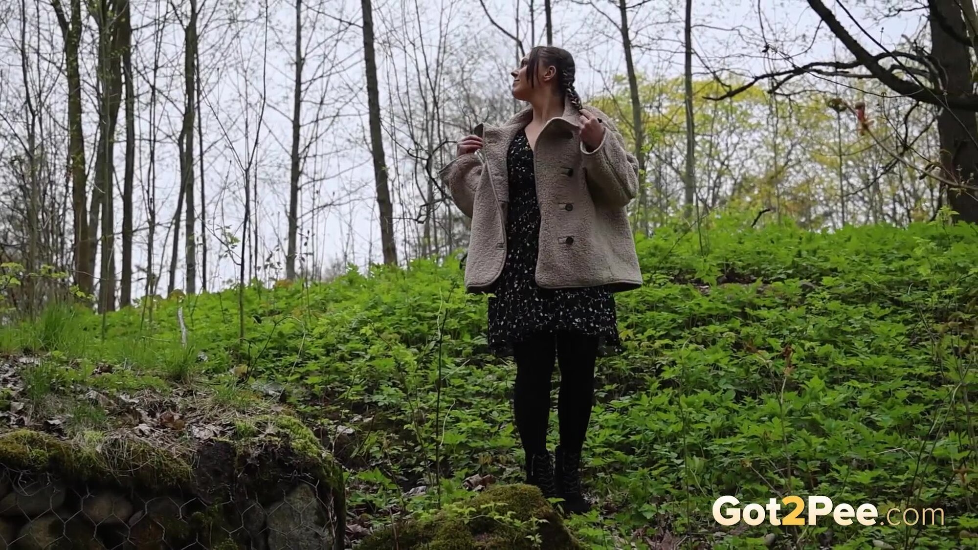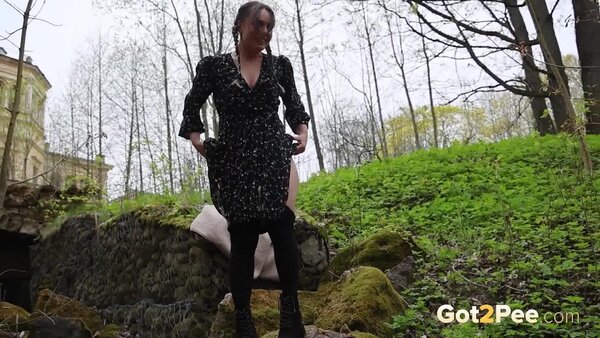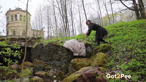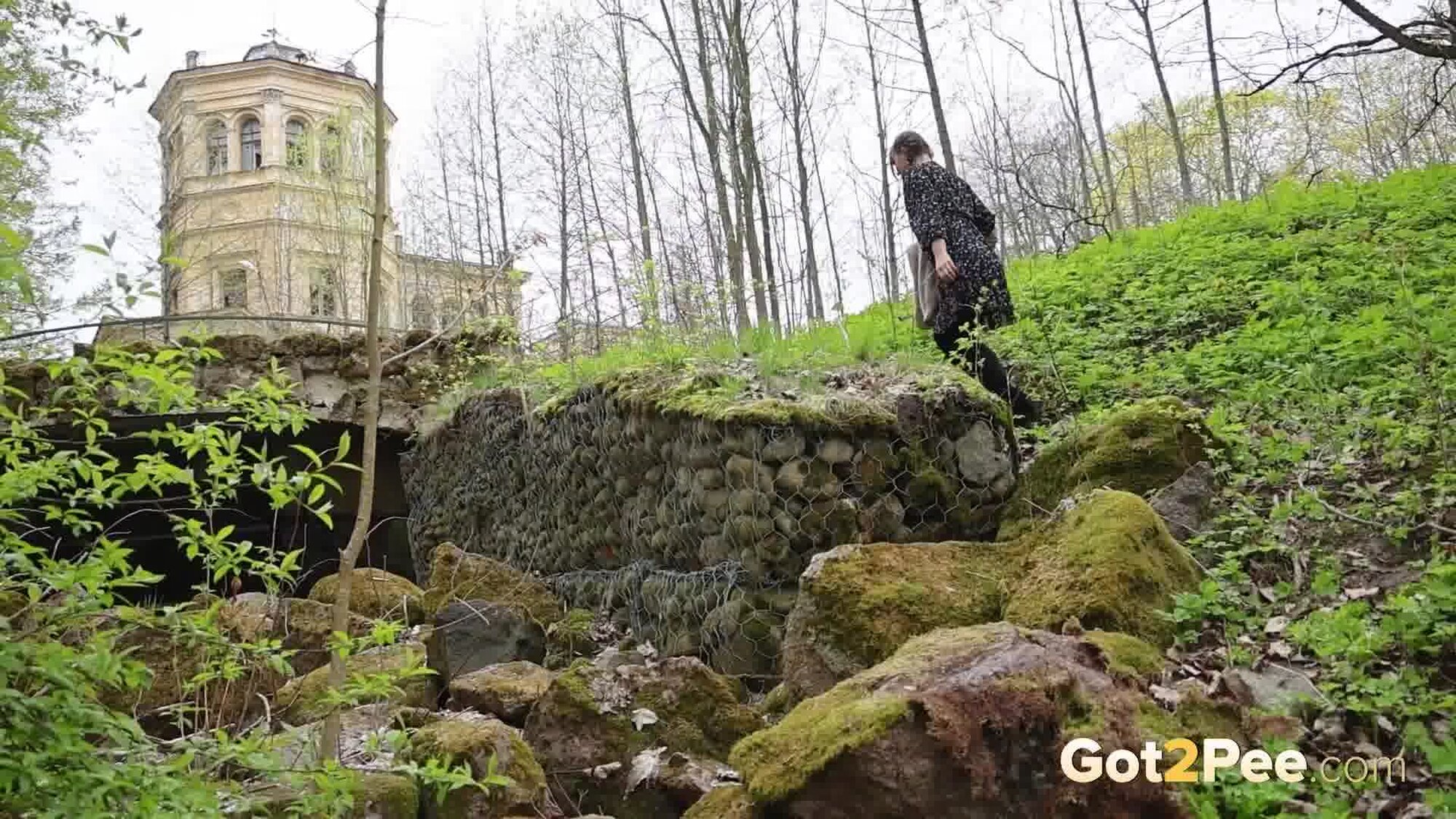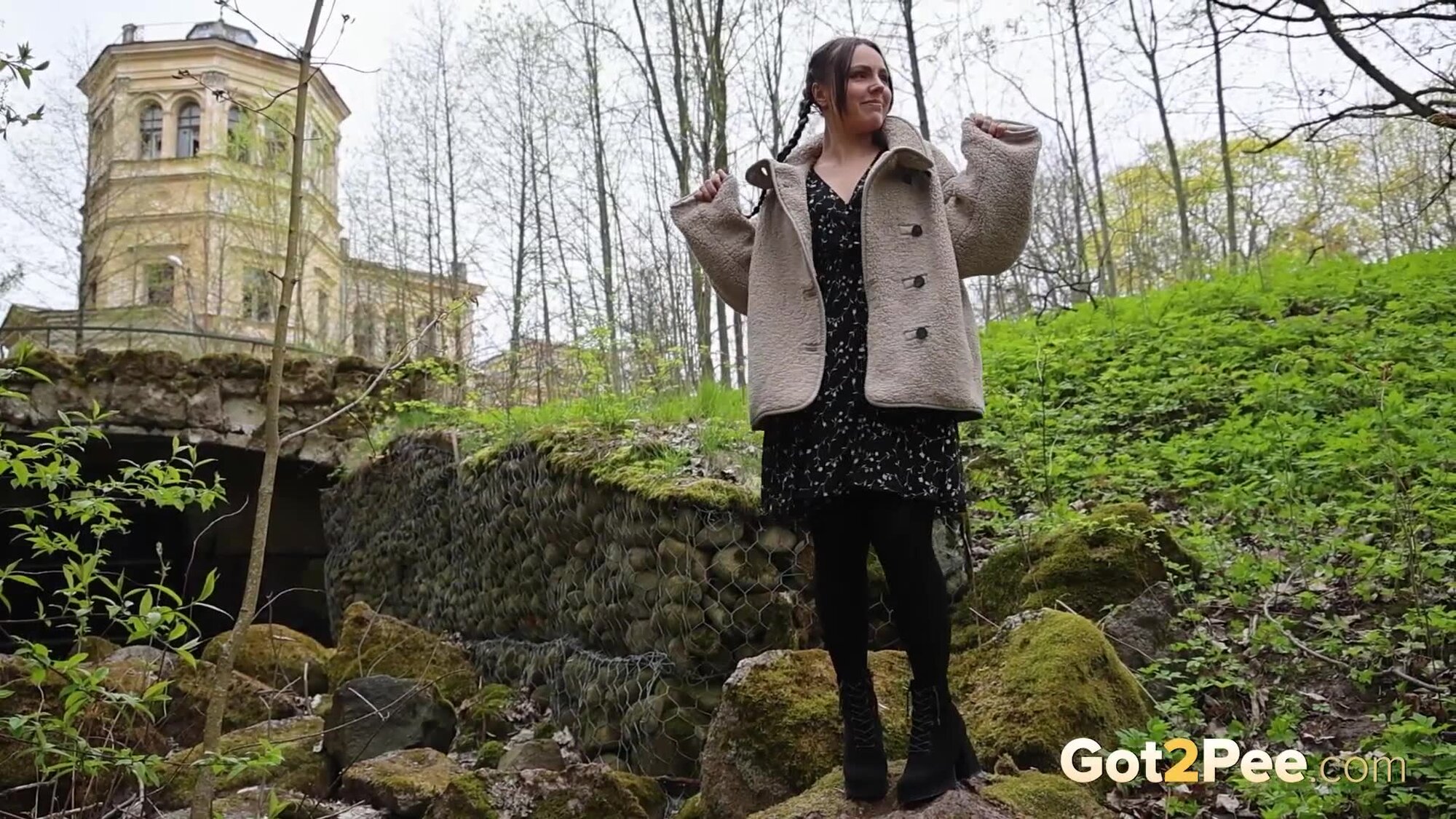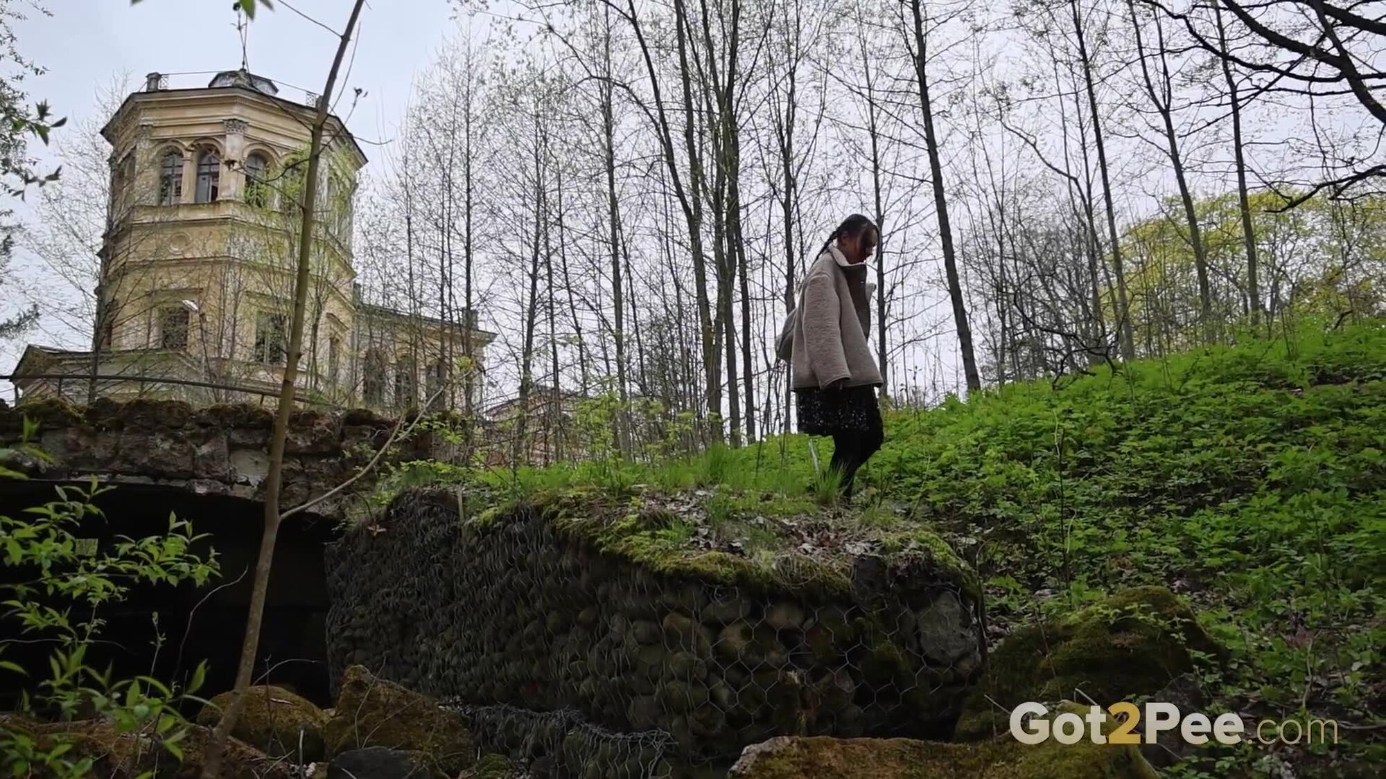 Pigtailed cutie Violet Rilz walks down to a brook and takes off her jacket. She pulls down her pantyhose and squatting to pee, keeps a lookout while releasing her golden juices over the edge of a moss covered rock. We zoom in close to capture her messy pee for our newest Got2Pee pissing porn video.