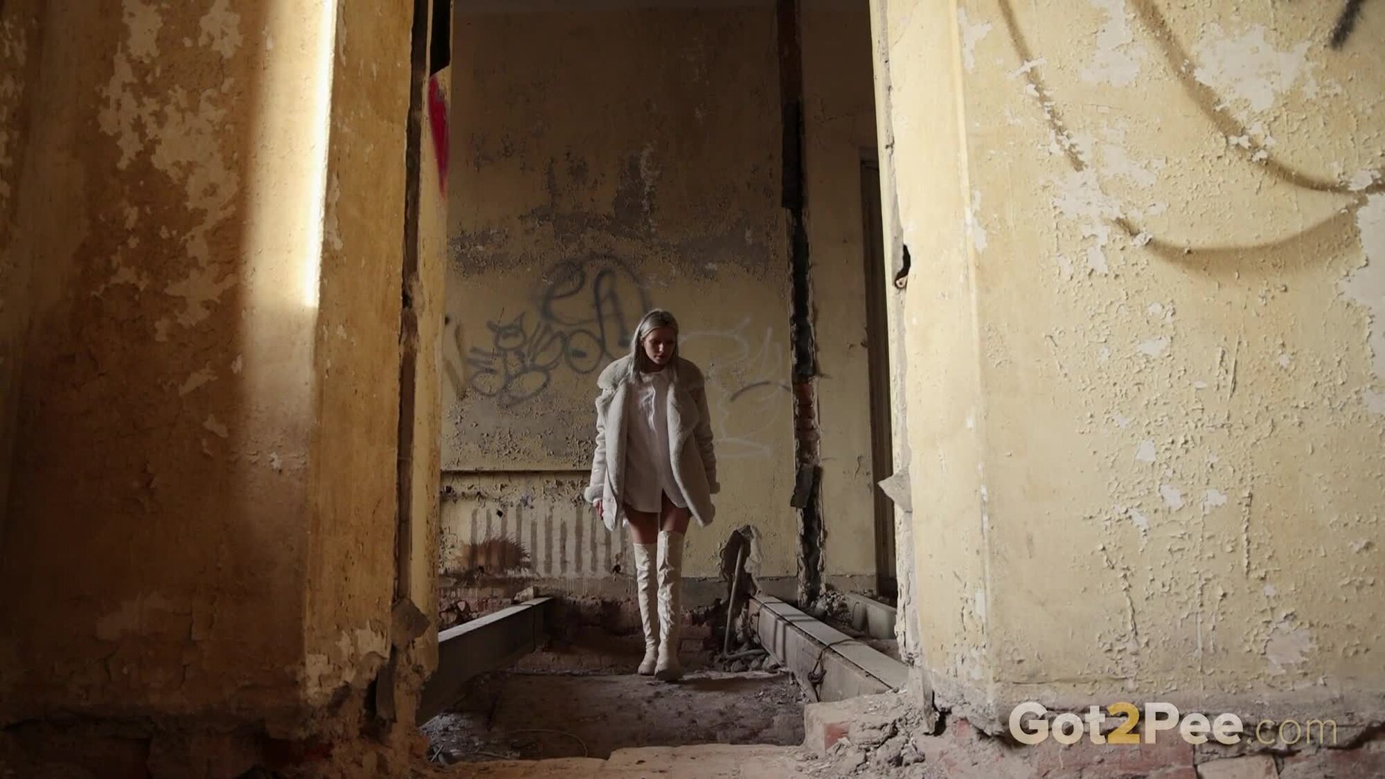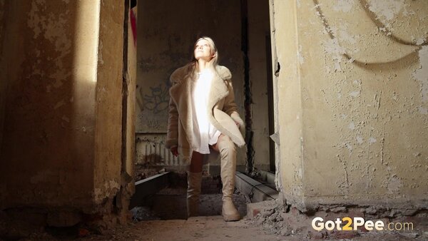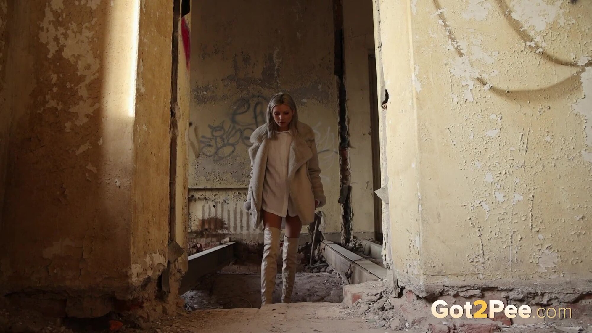 If you want to watch a pretty blonde pissing, you've come to the right place! In our latest Got2Pee update, a sexy girl in over the knee boots walks through an abandoned graffiti covered building. She looks around before lifting up her white blouse, revealing that she isn't wearing any panties. We film this hottie enjoying a pee standing and zoom in closer while she trickles over the ground.