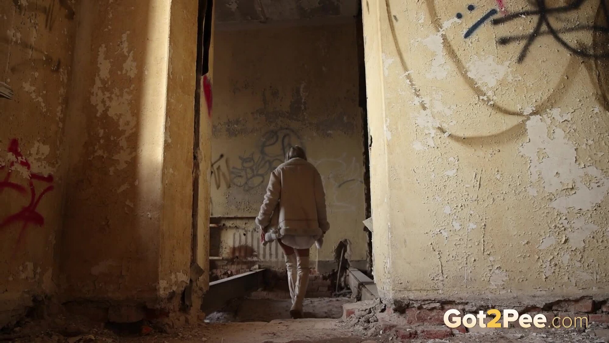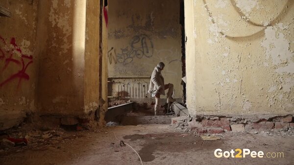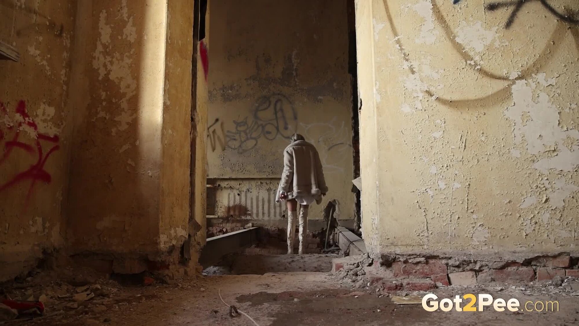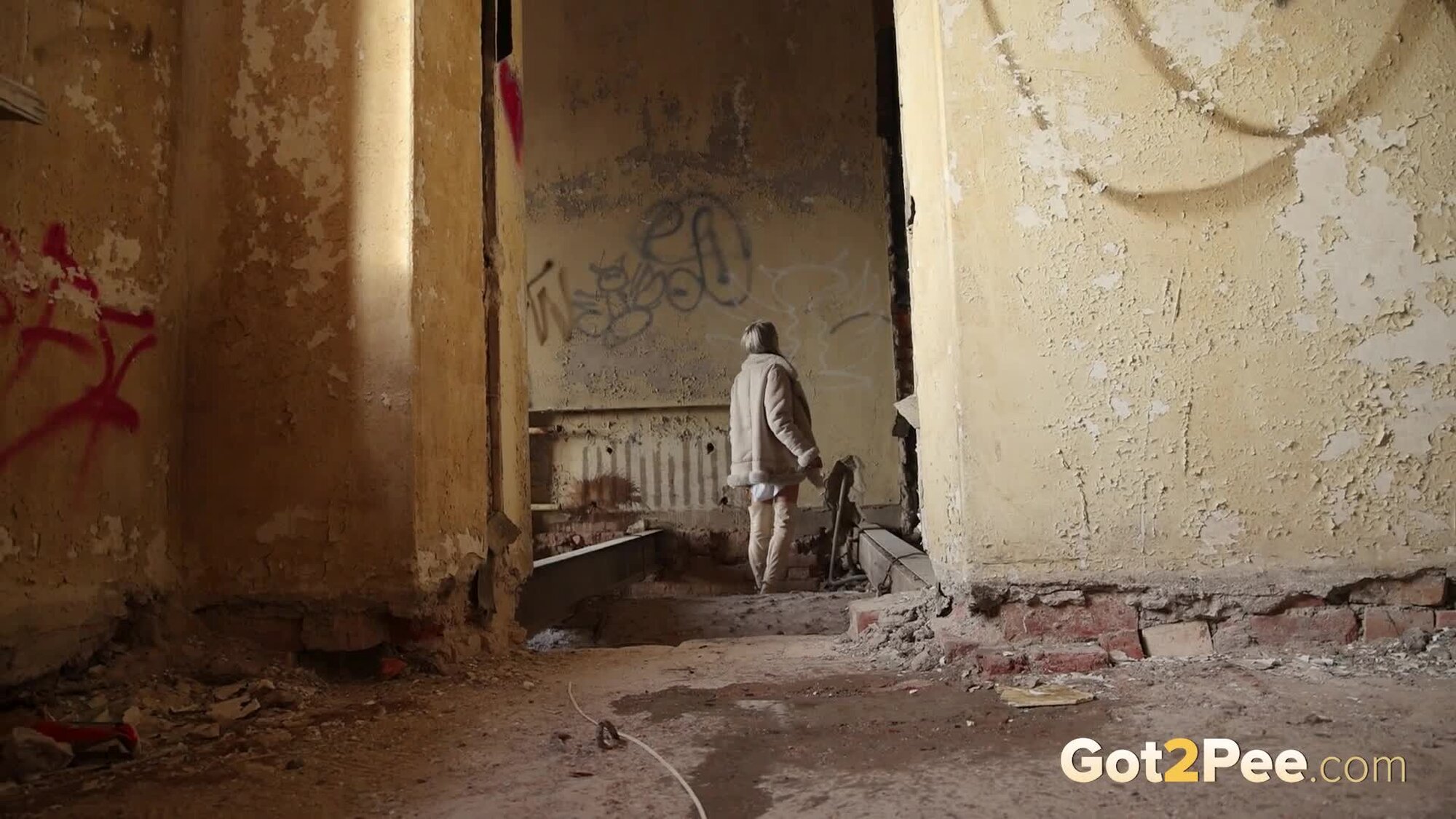 If you want to watch a pretty blonde pissing, you've come to the right place! In our latest Got2Pee update, a sexy girl in over the knee boots walks through an abandoned graffiti covered building. She looks around before lifting up her white blouse, revealing that she isn't wearing any panties. We film this hottie enjoying a pee standing and zoom in closer while she trickles over the ground.