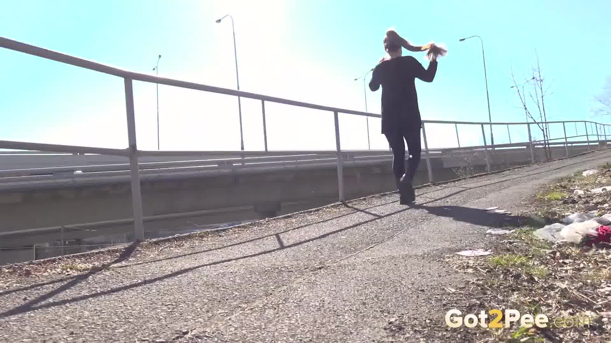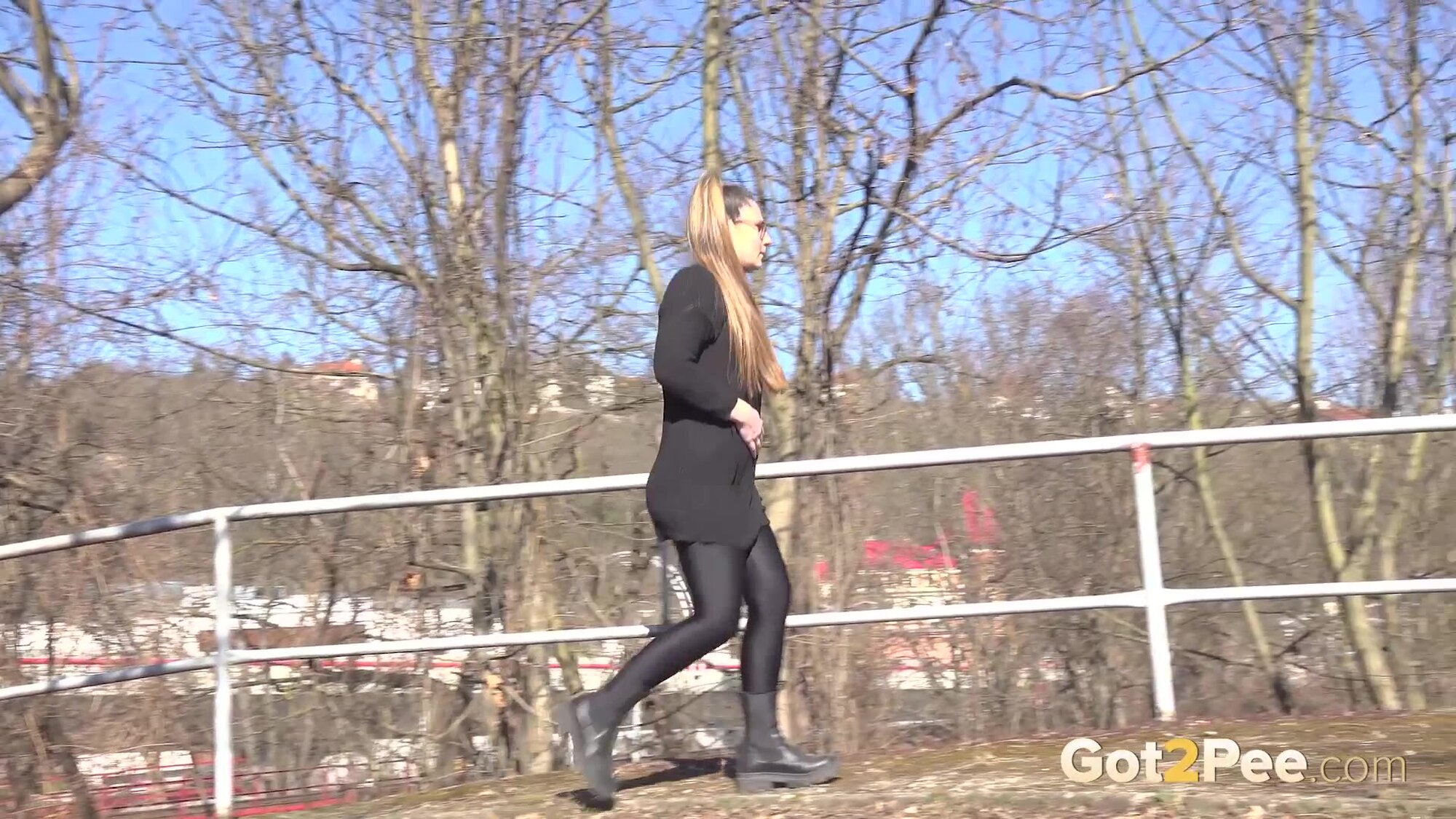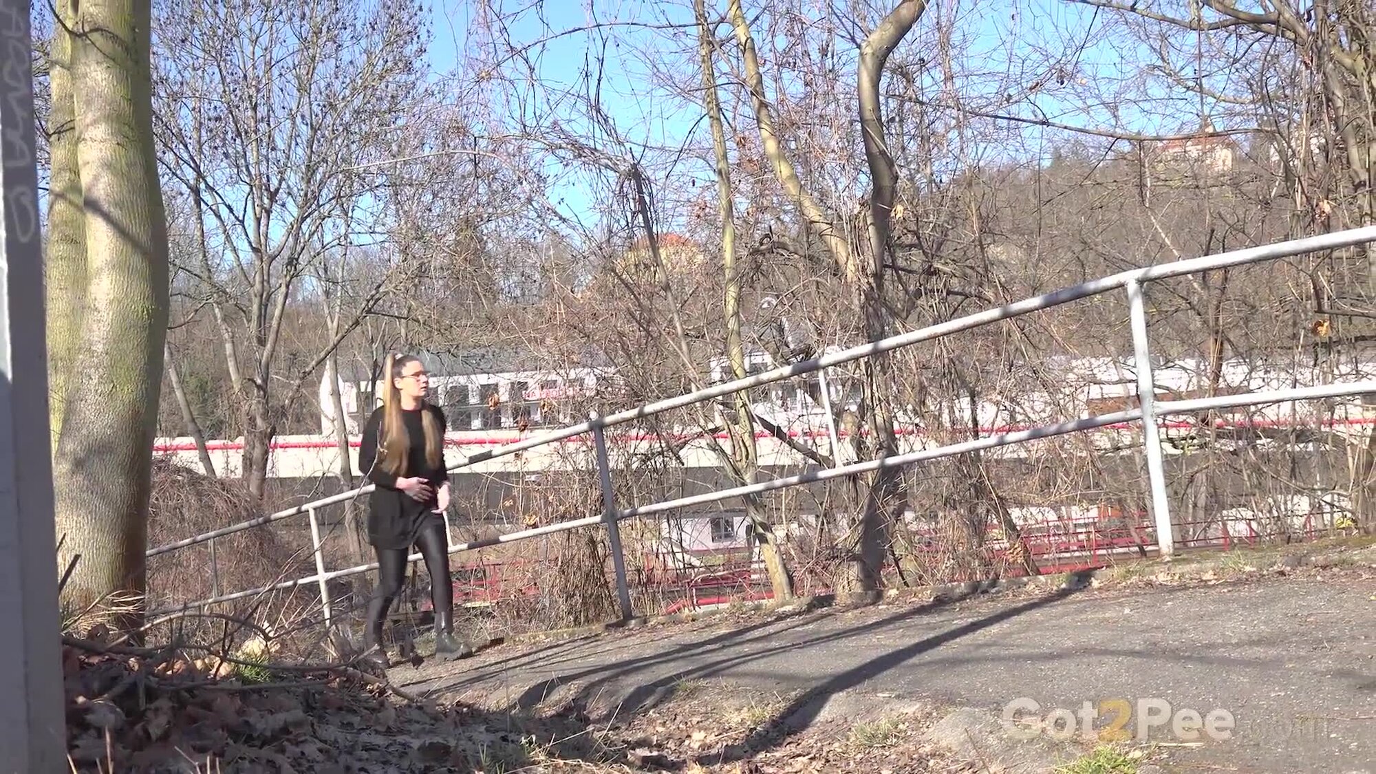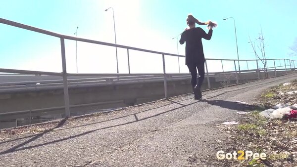 In today's Got2Pee scene, Lara Fox walks along a path in the suburbs. She stops by some railings and pulls down her leggings before squatting to pee. We zoom in close as long haired Lara relieves her piss desperation over the ground in full view of the roads nearby.