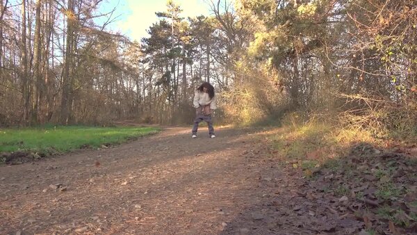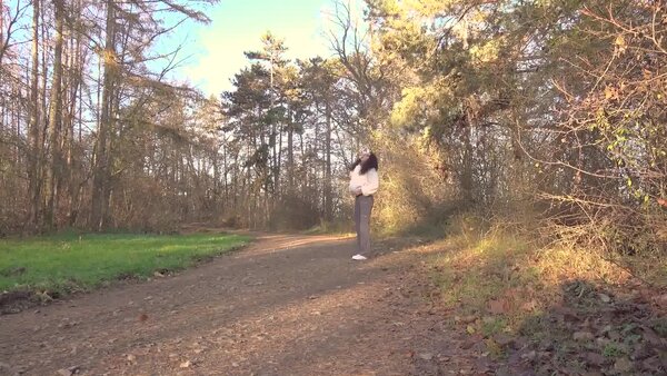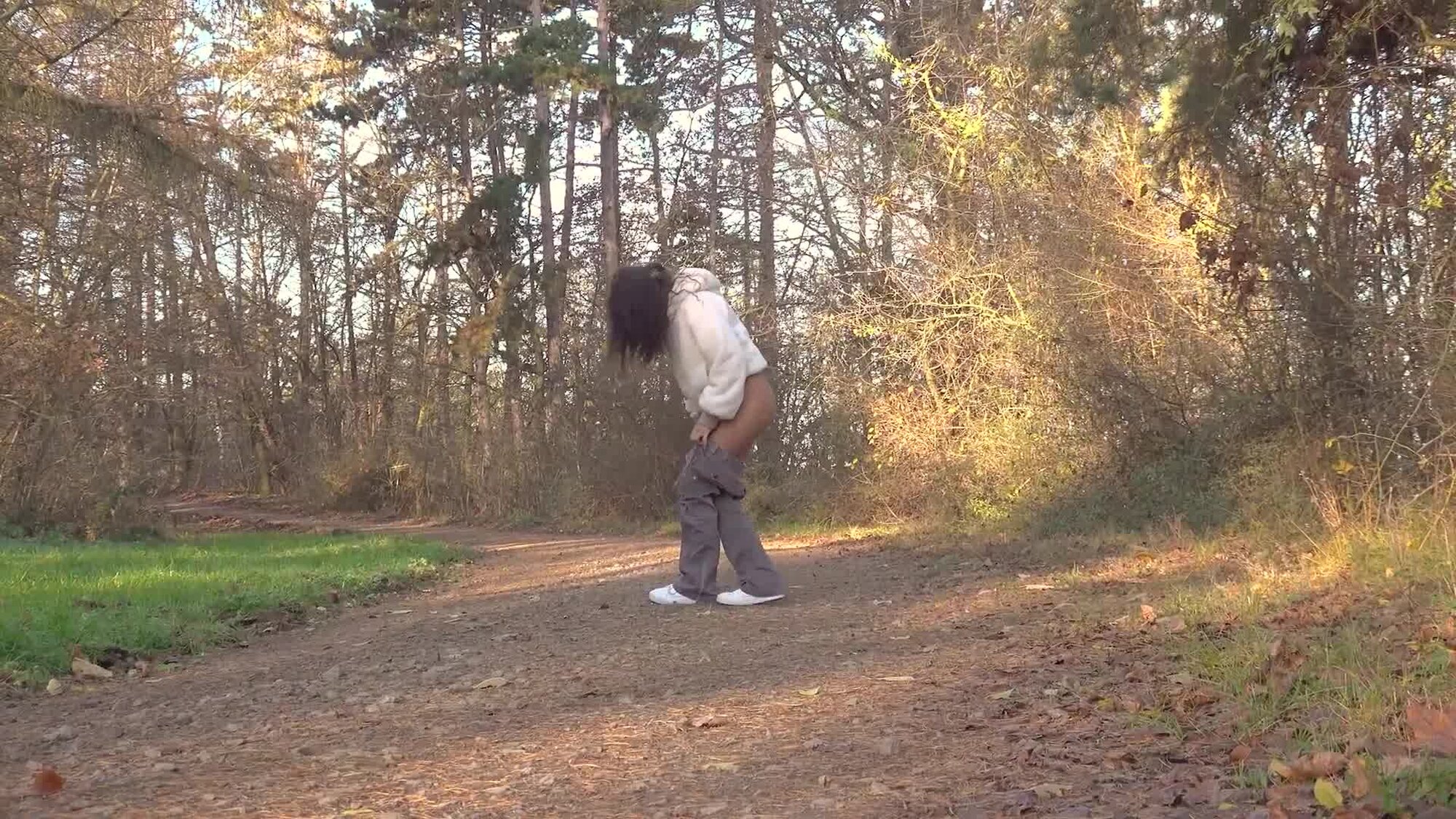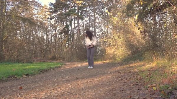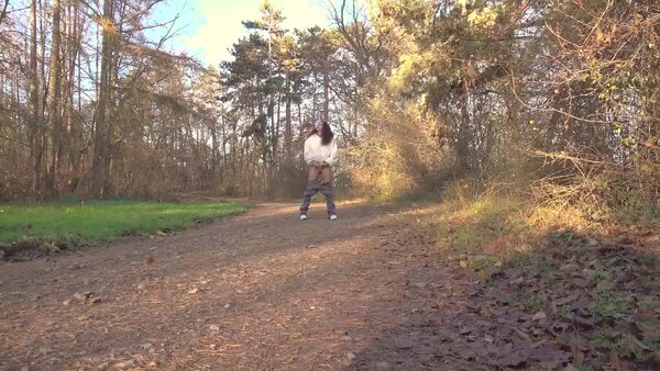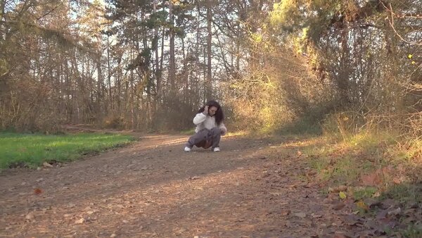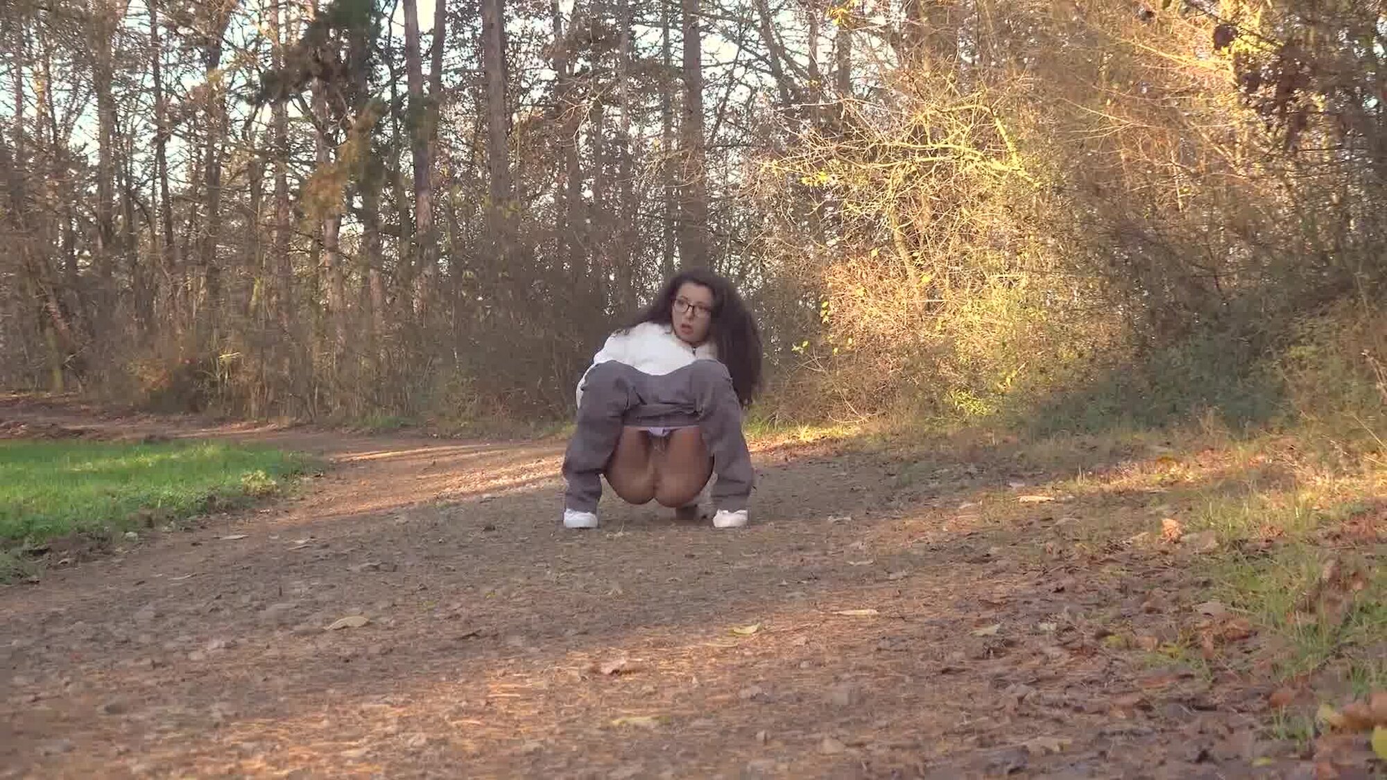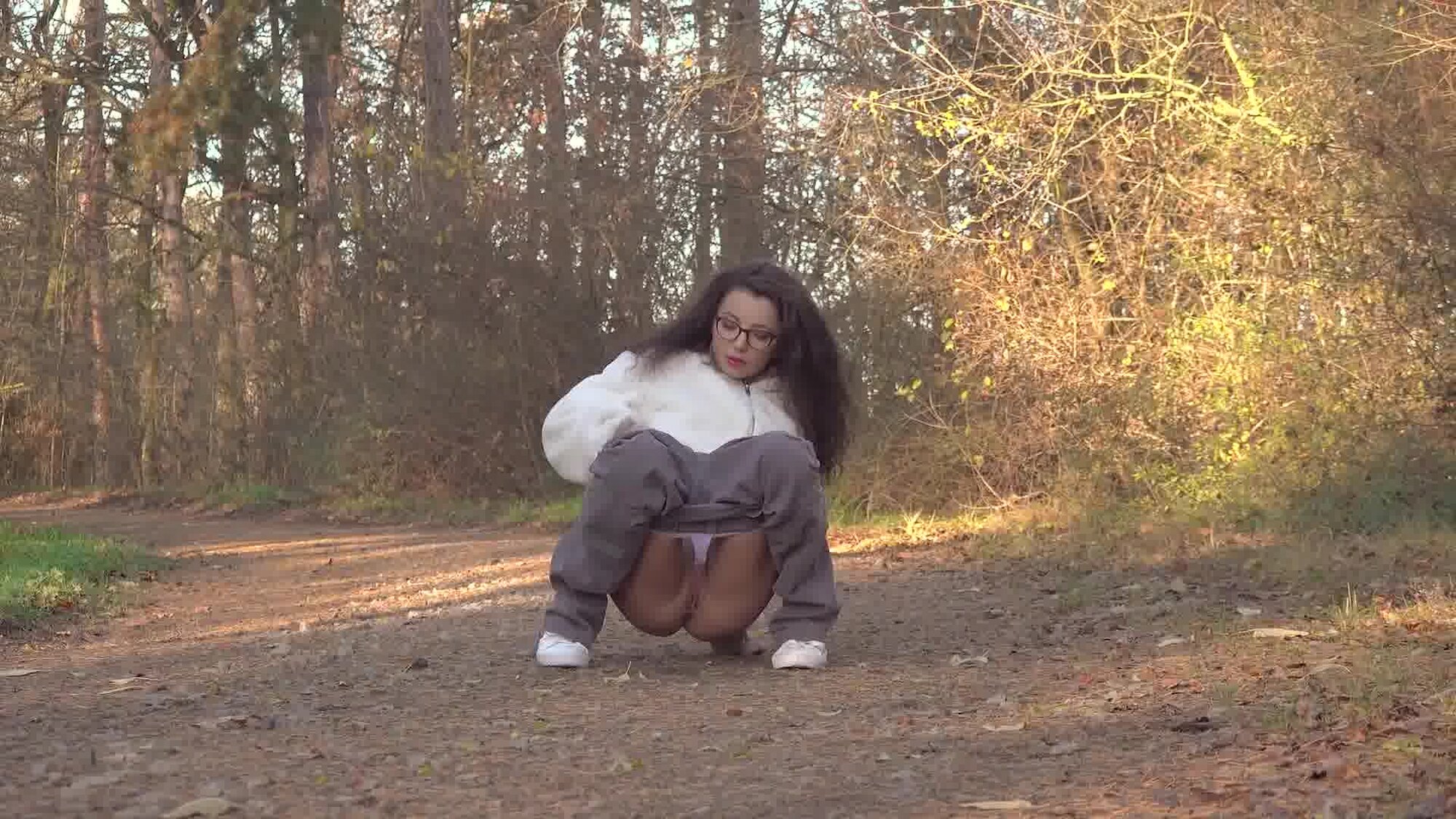 Gorgeous brunette Mini Mitzi is walking along a countryside track road when she looks to be suffering from pee desperation. She stops and pulls down her trousers while looking around, then squatting to pee, holds onto her pussy as we zoom in on her stream as it flows down to the ground. Another perfect addition to Got2Pee!