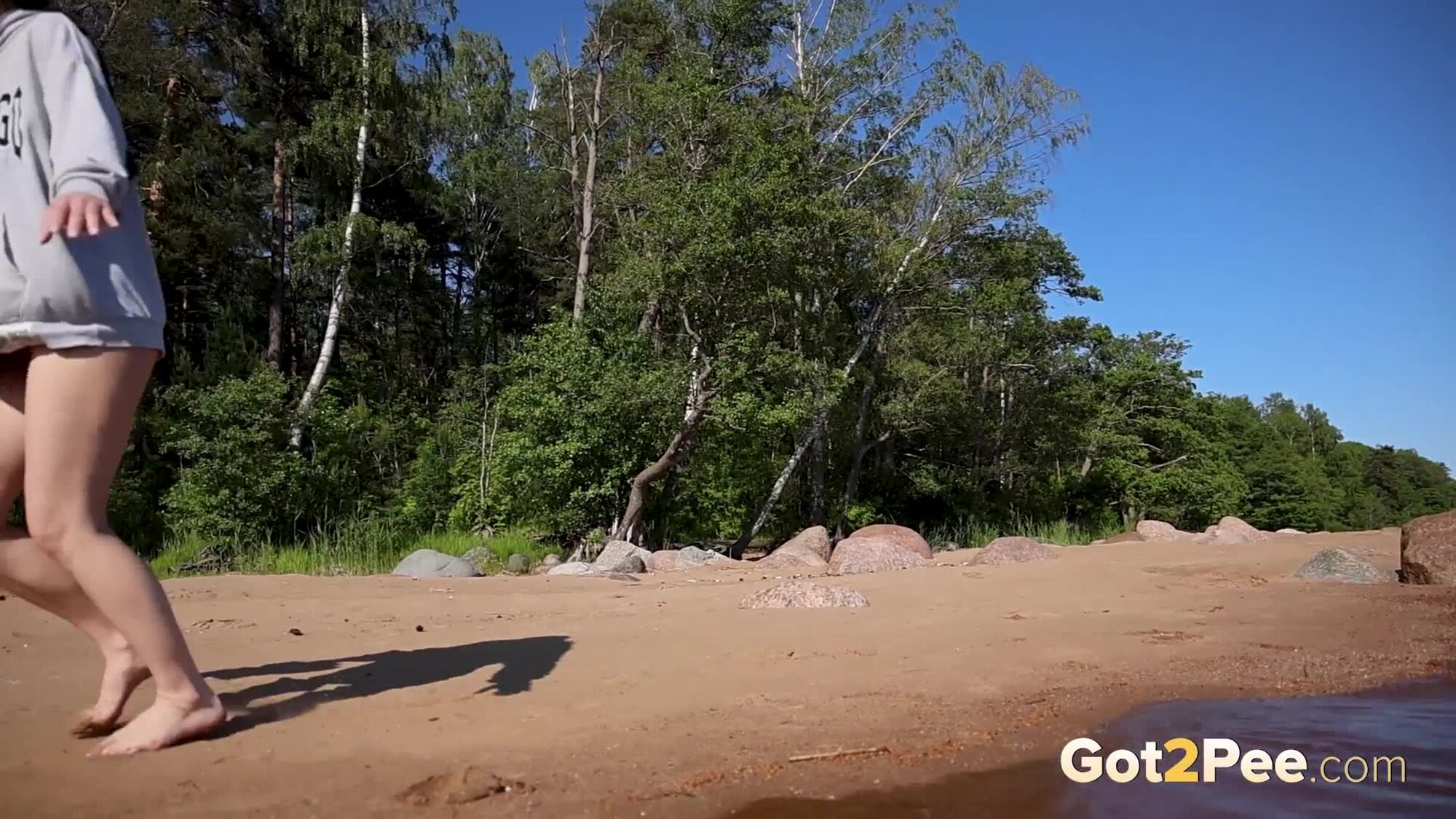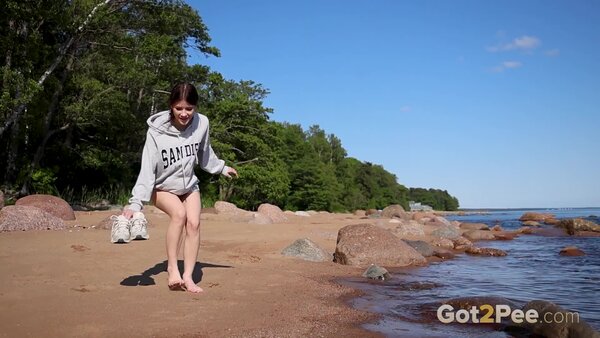 Join us for another public pissing porn video as Sophie Weben is on the beach carefully climbing over the rocks. She lifts up her sweatshirt, reveals that she isnt wearing any panties and starts to piss while standing over the sea! Imagine walking along the beach and spotting this slim beauty in the distance!