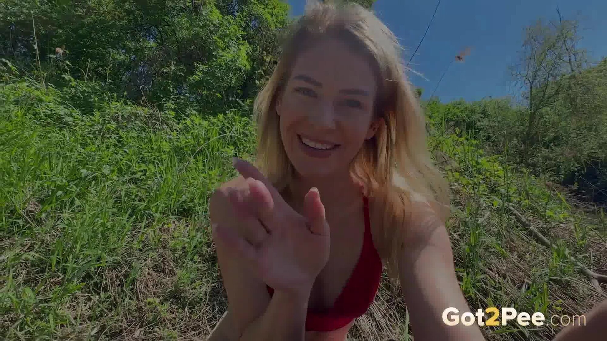 Watch Claudia Macc in our newest Got2Pee pissing porno with a twist. Claudia films herself in our latest installment and holds onto the camera while pulling down her leggings. Squatting to pee, she keeps things zoomed in as she sprays her golden droplets almost horizontally over the ground!