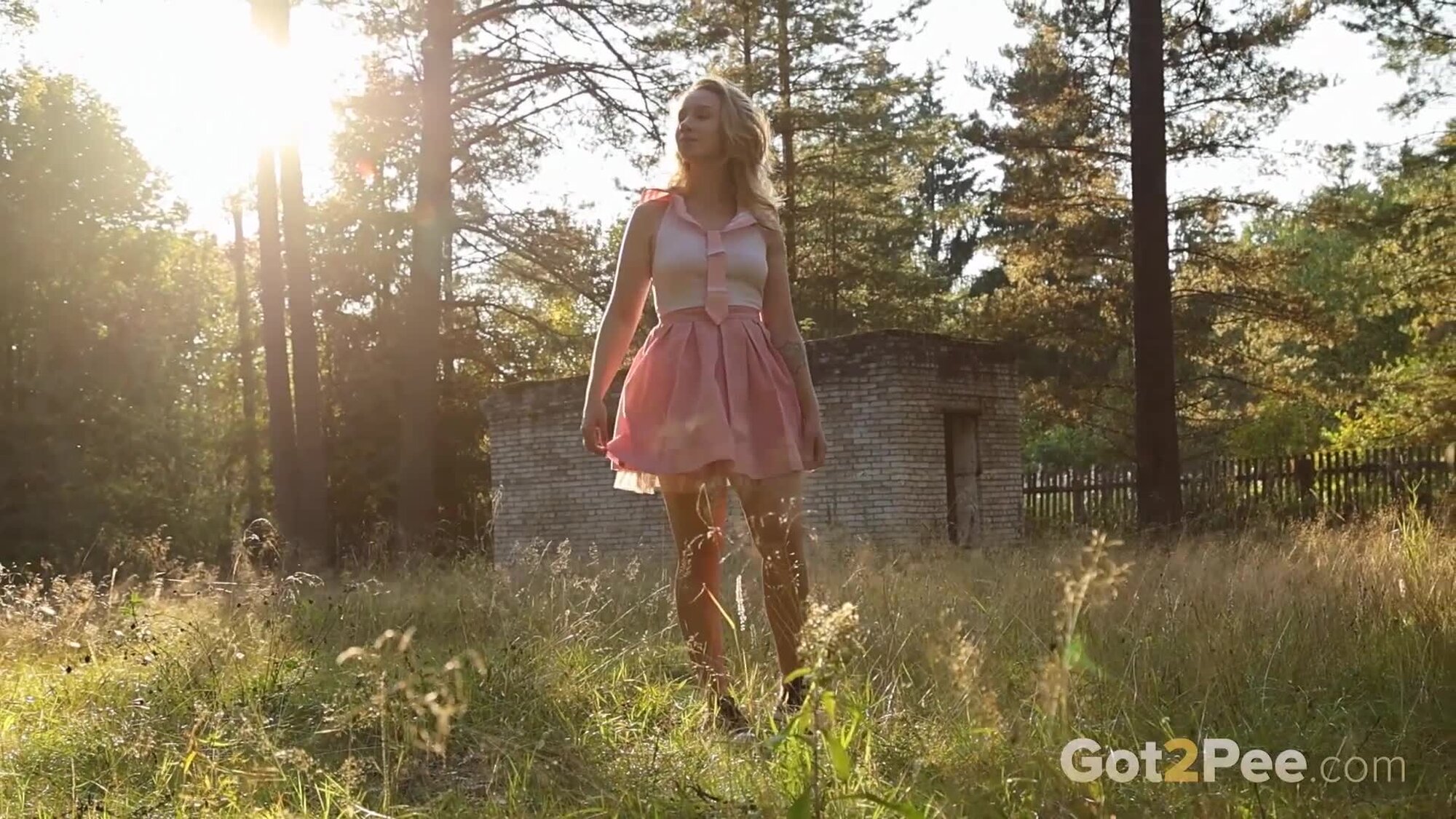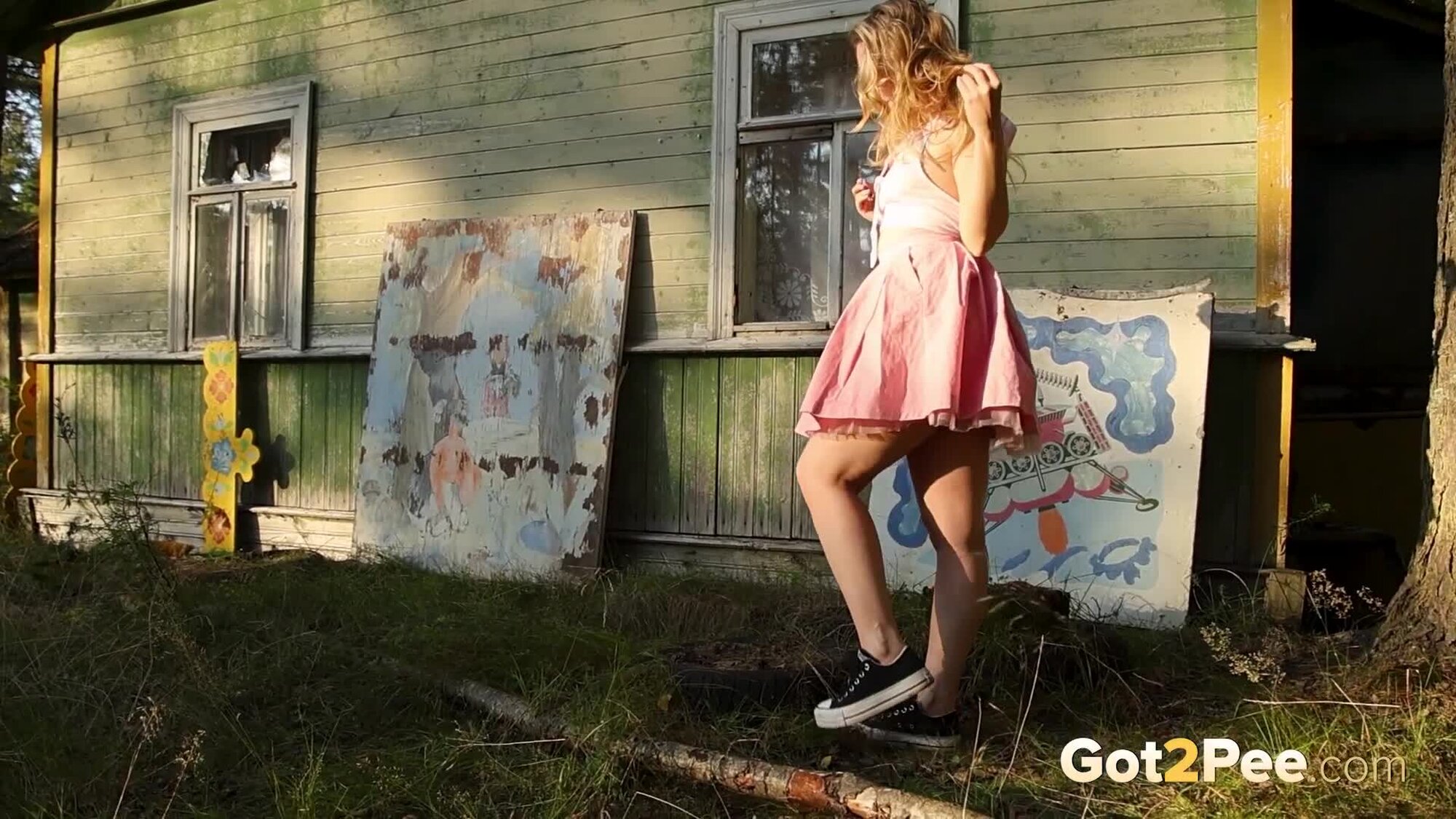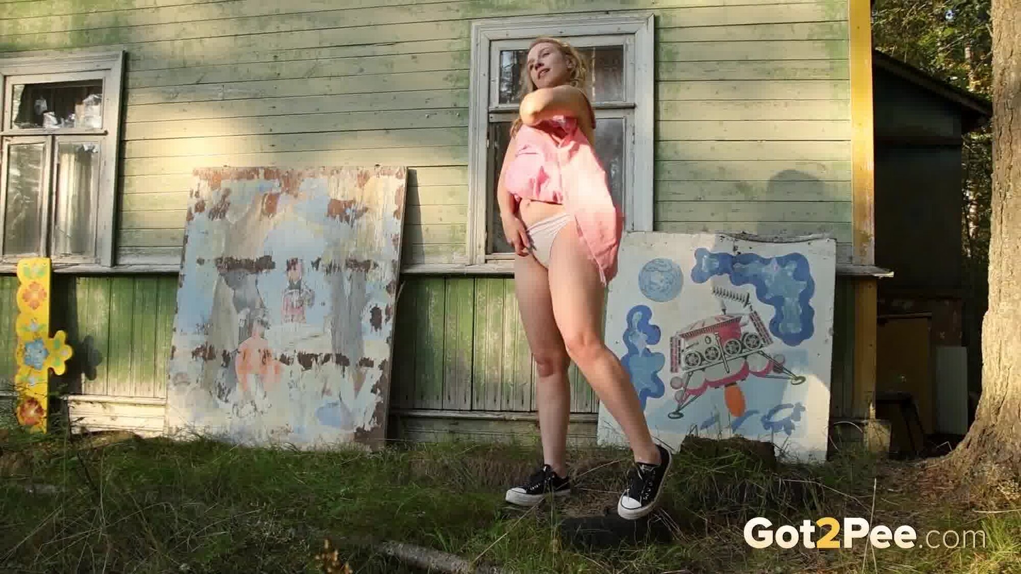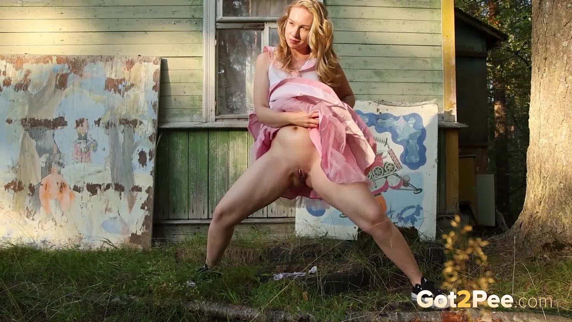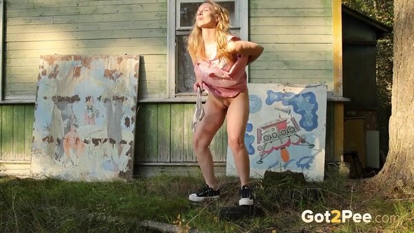 Sexy babe Alice Klay appears in our newest Got2Pee pissing porn video as she walks around enjoying the sun in a pretty dress. She finds an old cabin in the suburbs and decides to stop outside it before taking off her white panties. Alice is filmed squatting to pee and holds onto her panties while soaking them in her juices!