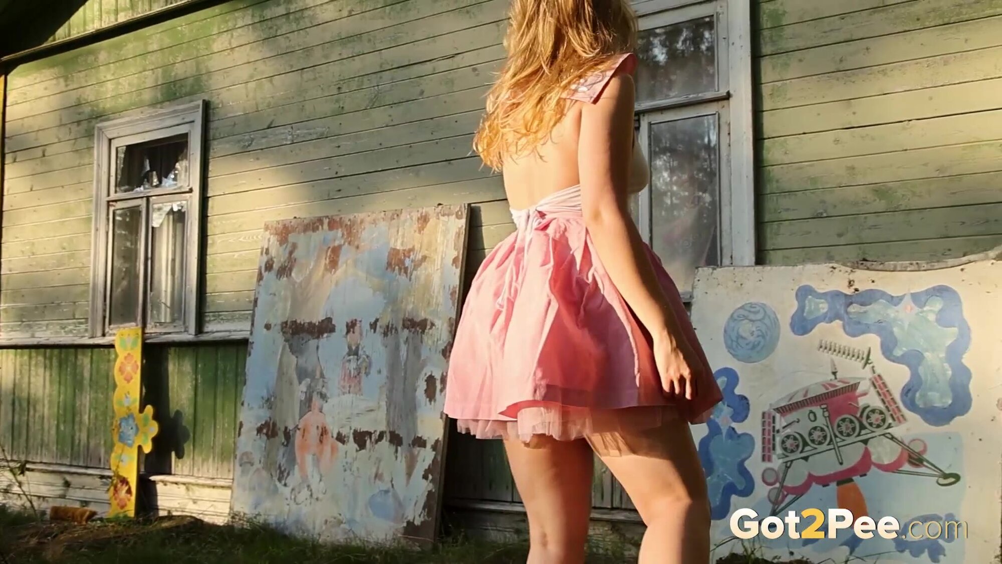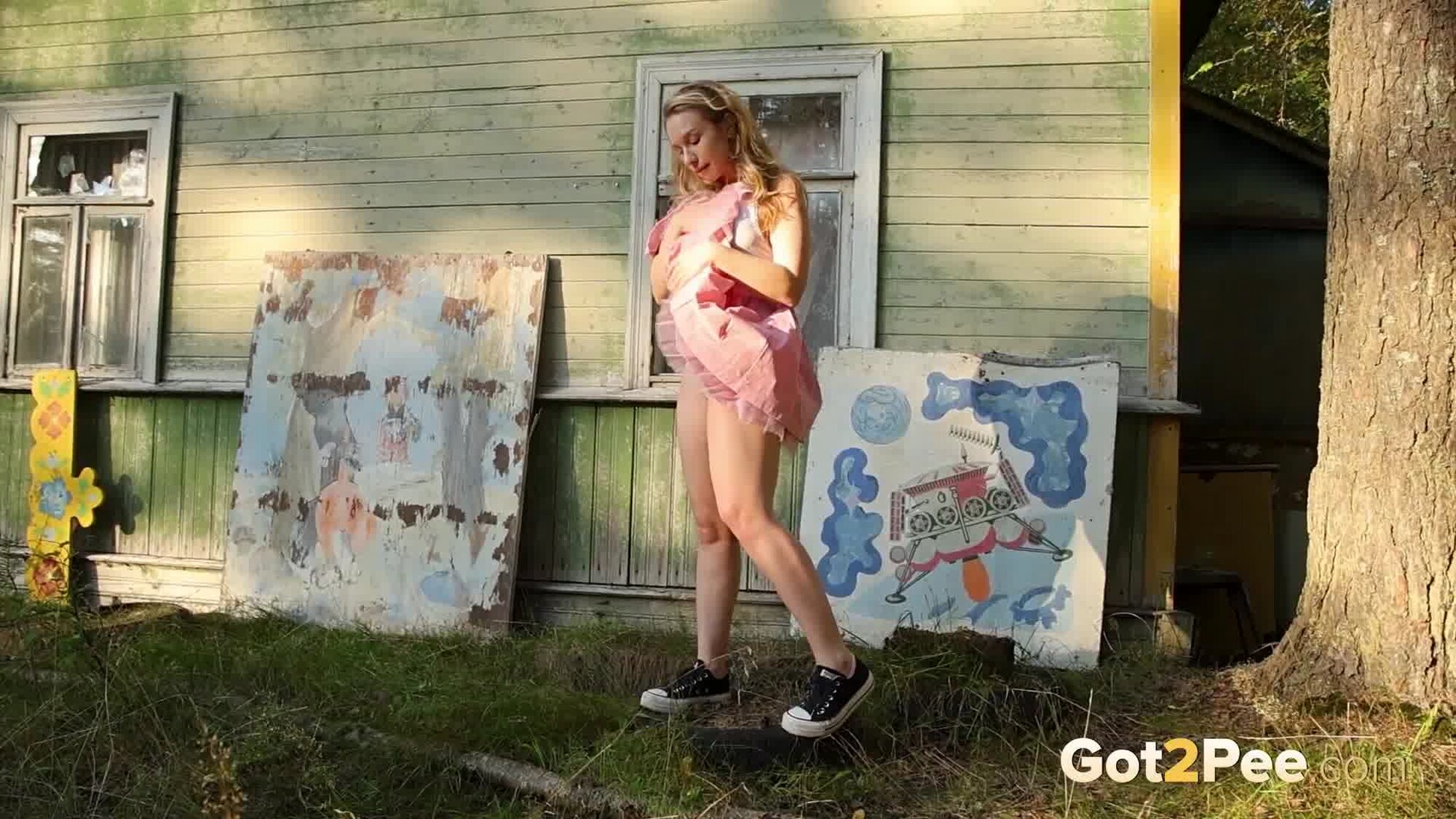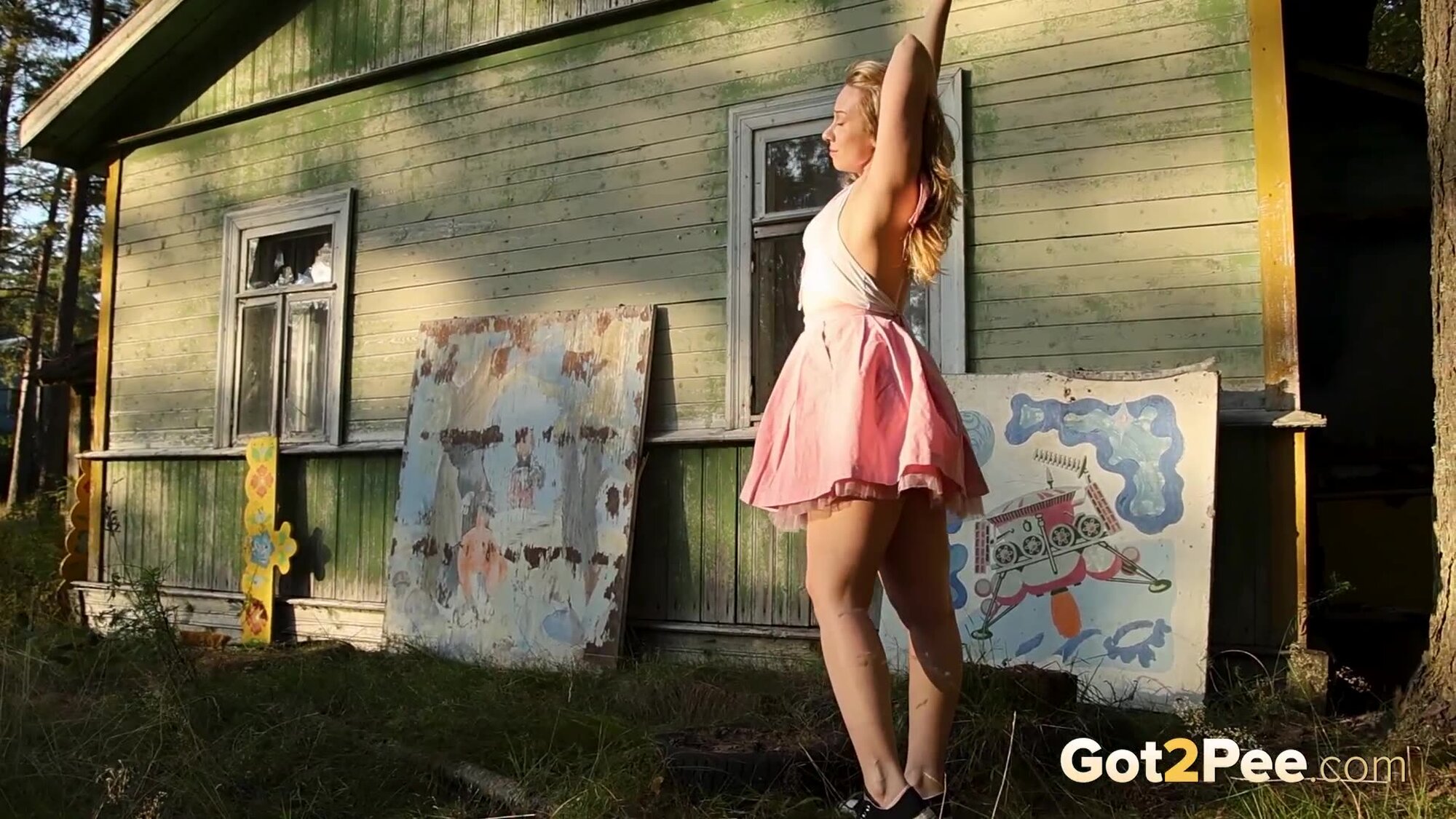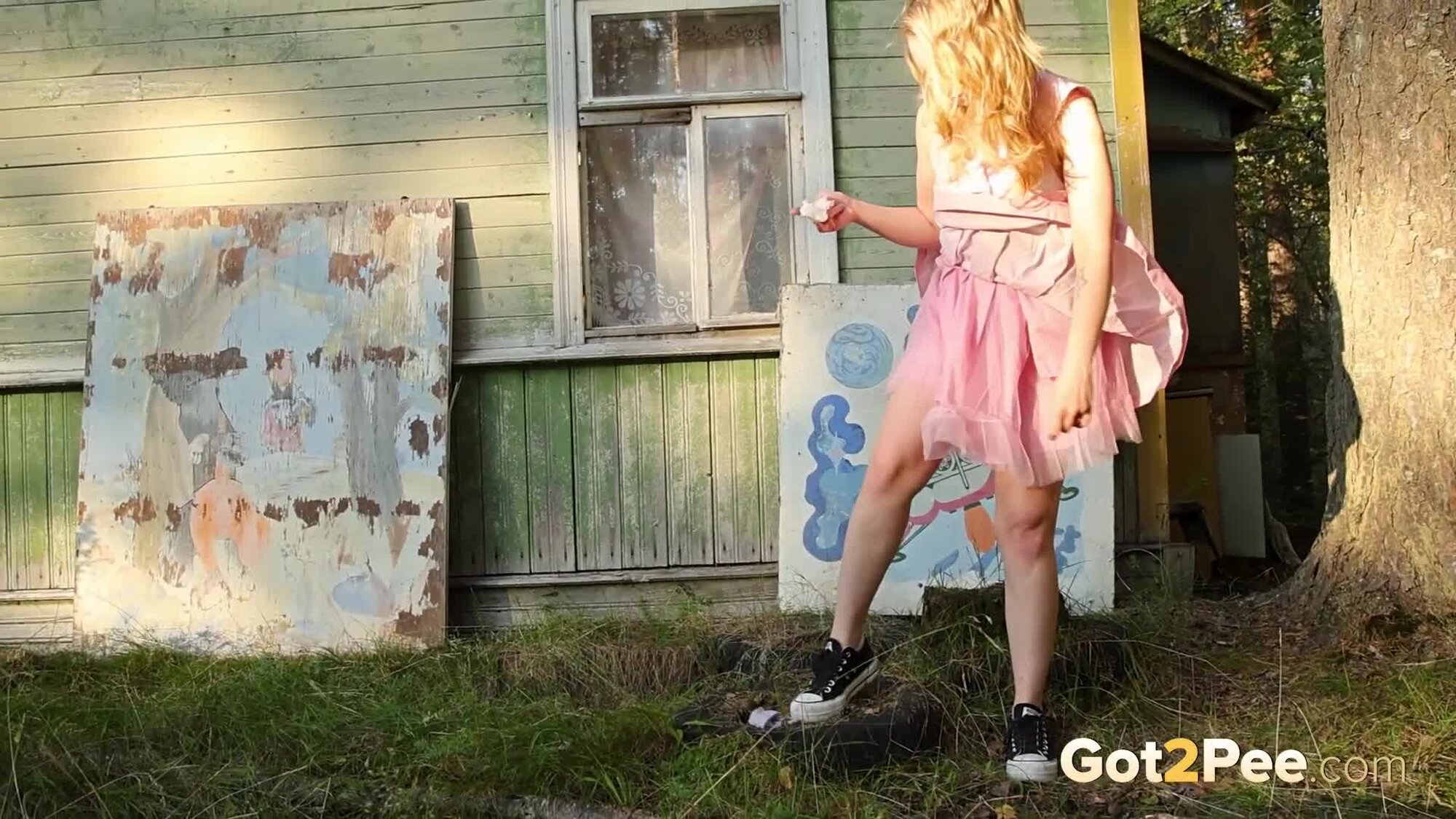 Sexy babe Alice Klay appears in our newest Got2Pee pissing porn video as she walks around enjoying the sun in a pretty dress. She finds an old cabin in the suburbs and decides to stop outside it before taking off her white panties. Alice is filmed squatting to pee and holds onto her panties while soaking them in her juices!