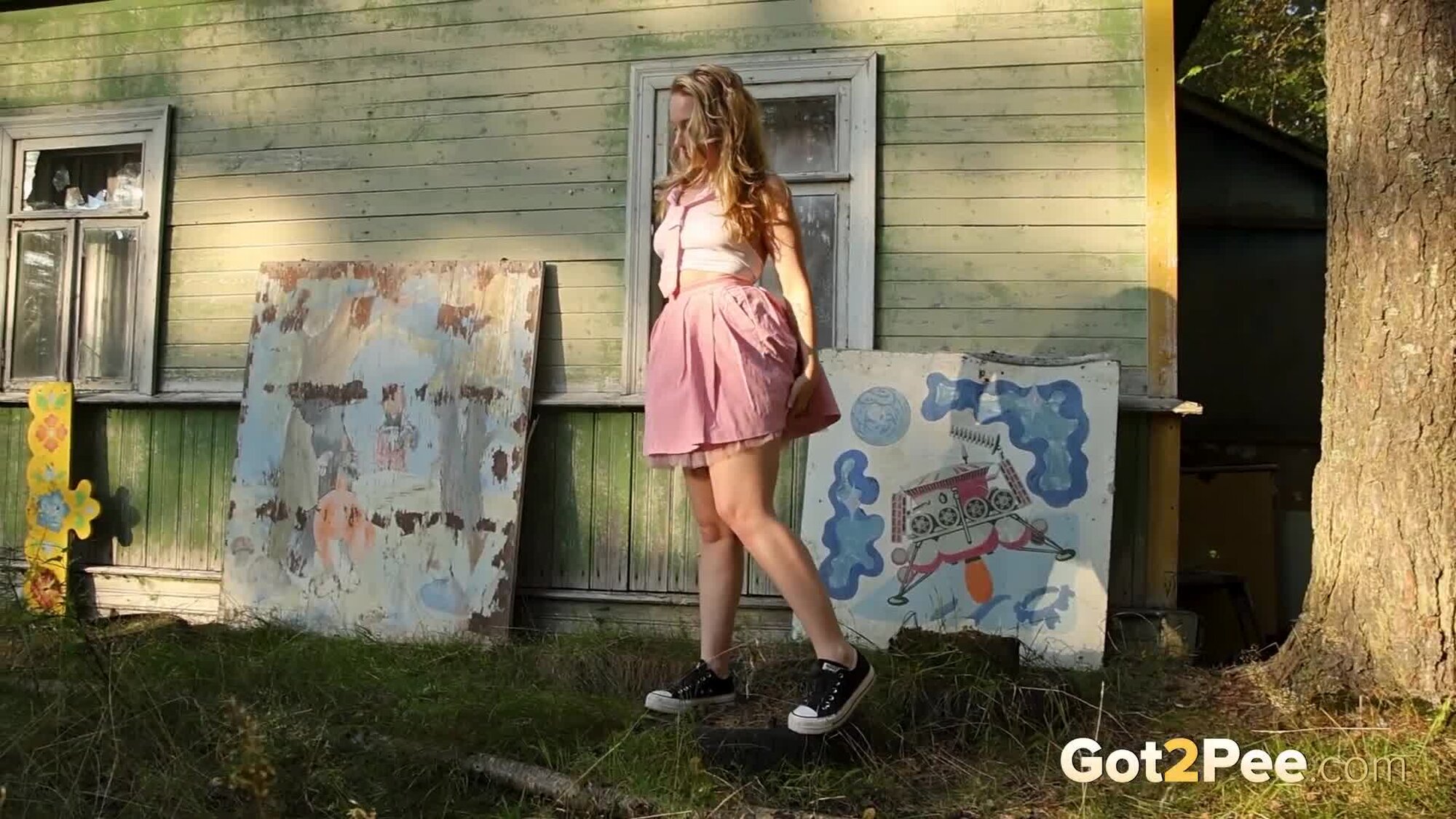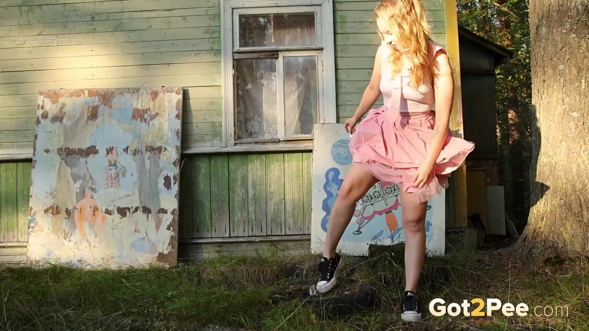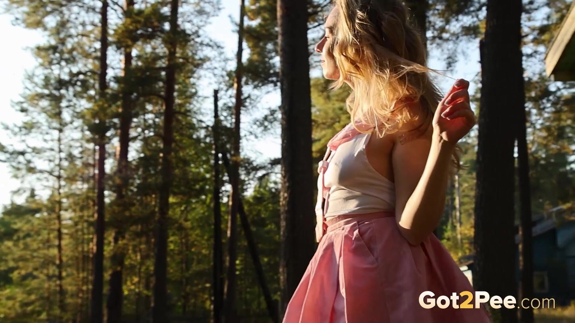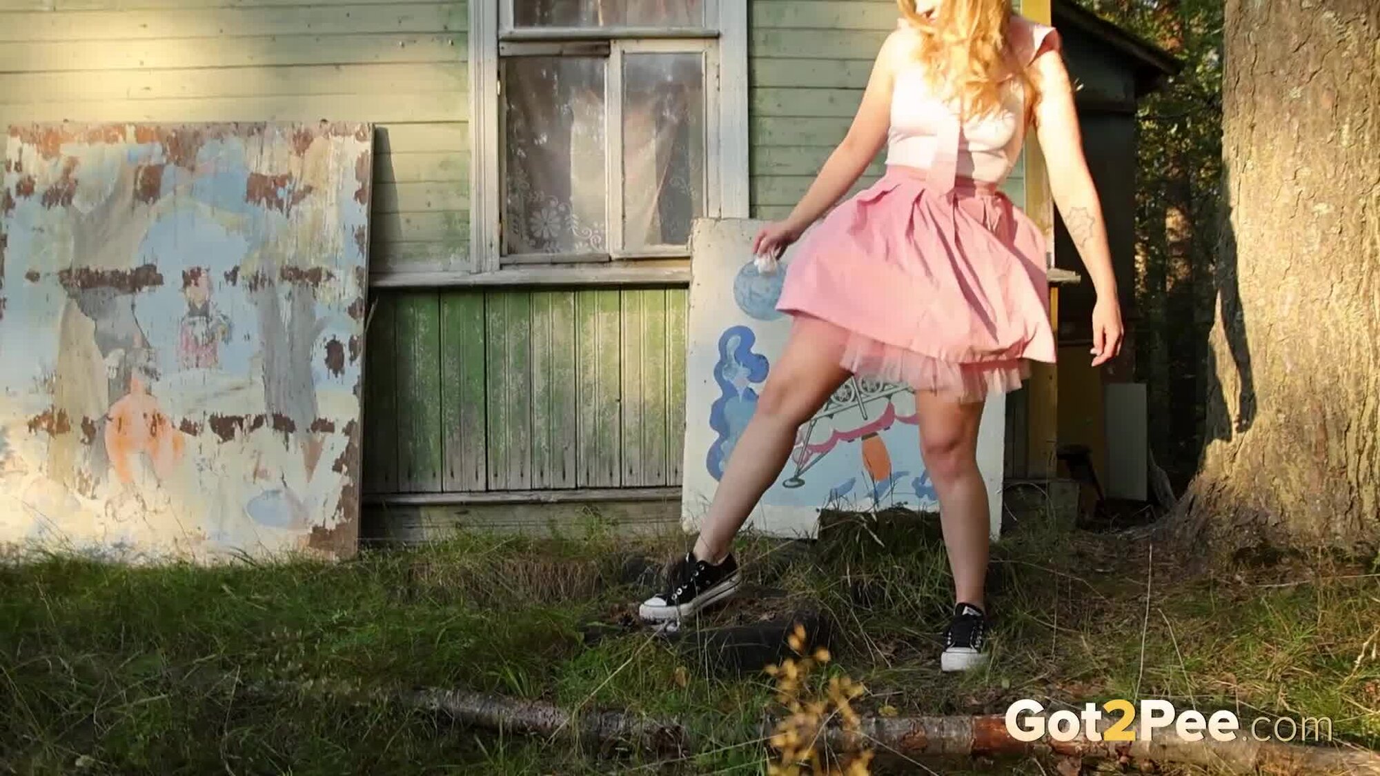 Sexy babe Alice Klay appears in our newest Got2Pee pissing porn video as she walks around enjoying the sun in a pretty dress. She finds an old cabin in the suburbs and decides to stop outside it before taking off her white panties. Alice is filmed squatting to pee and holds onto her panties while soaking them in her juices!