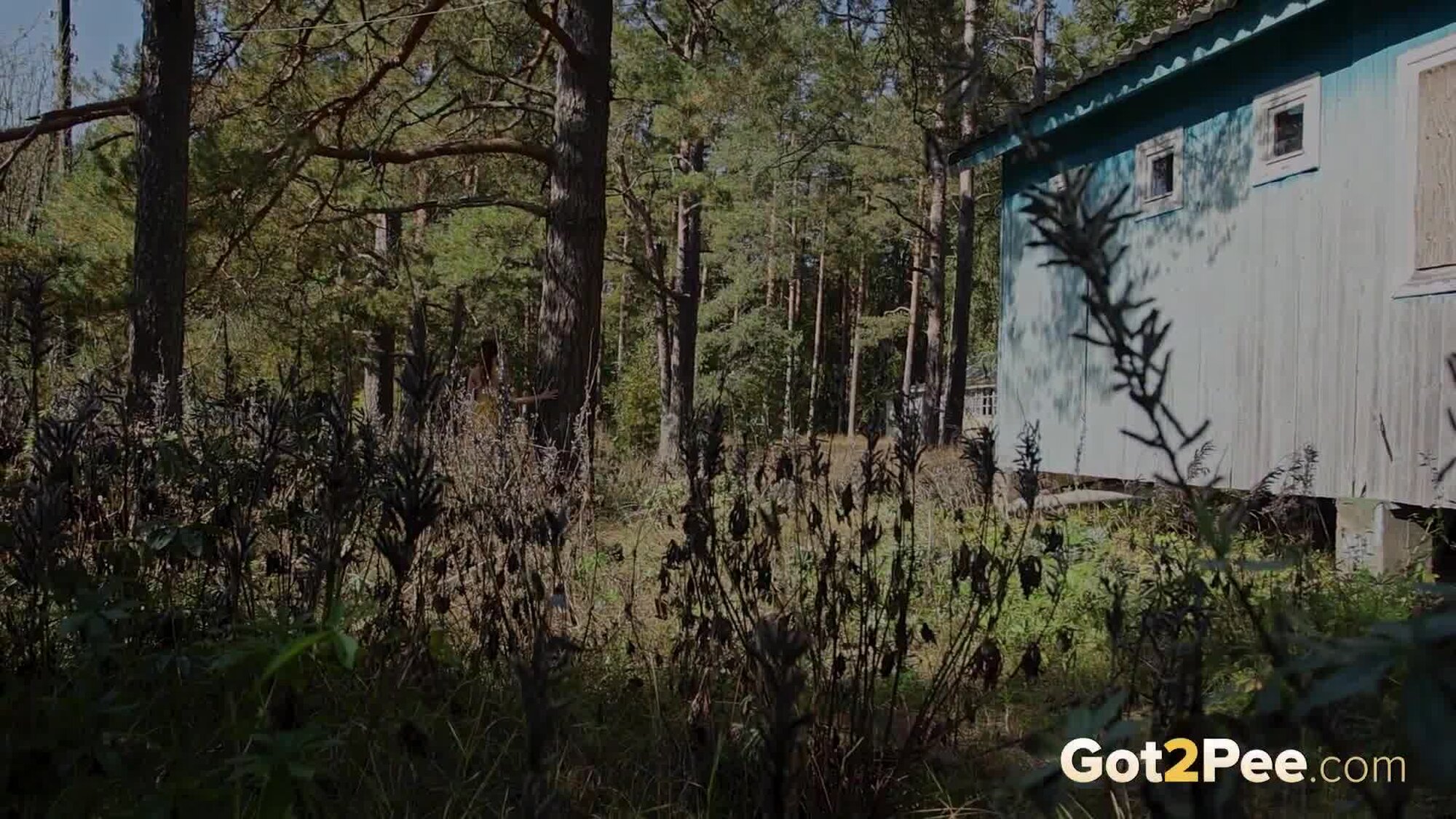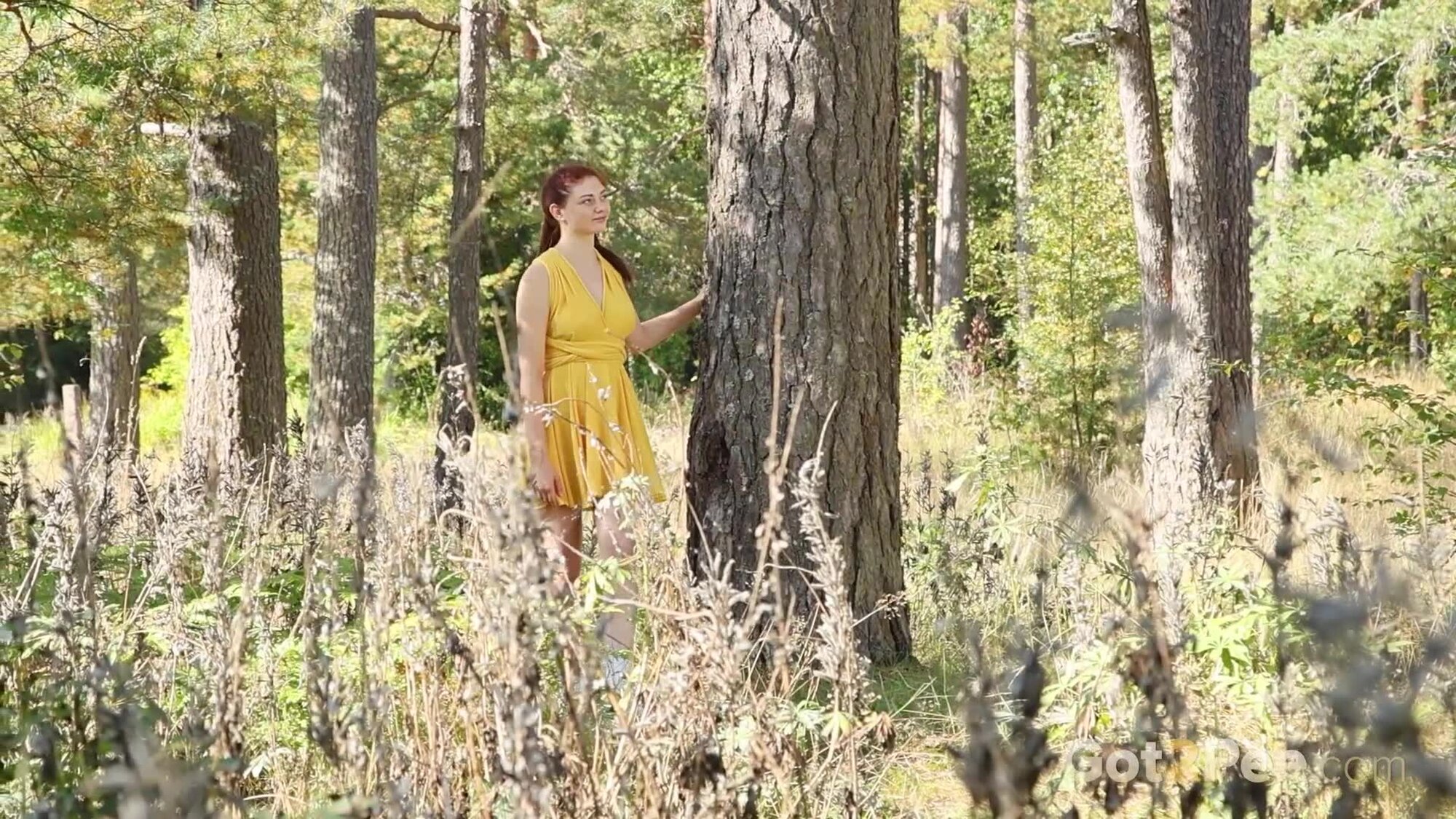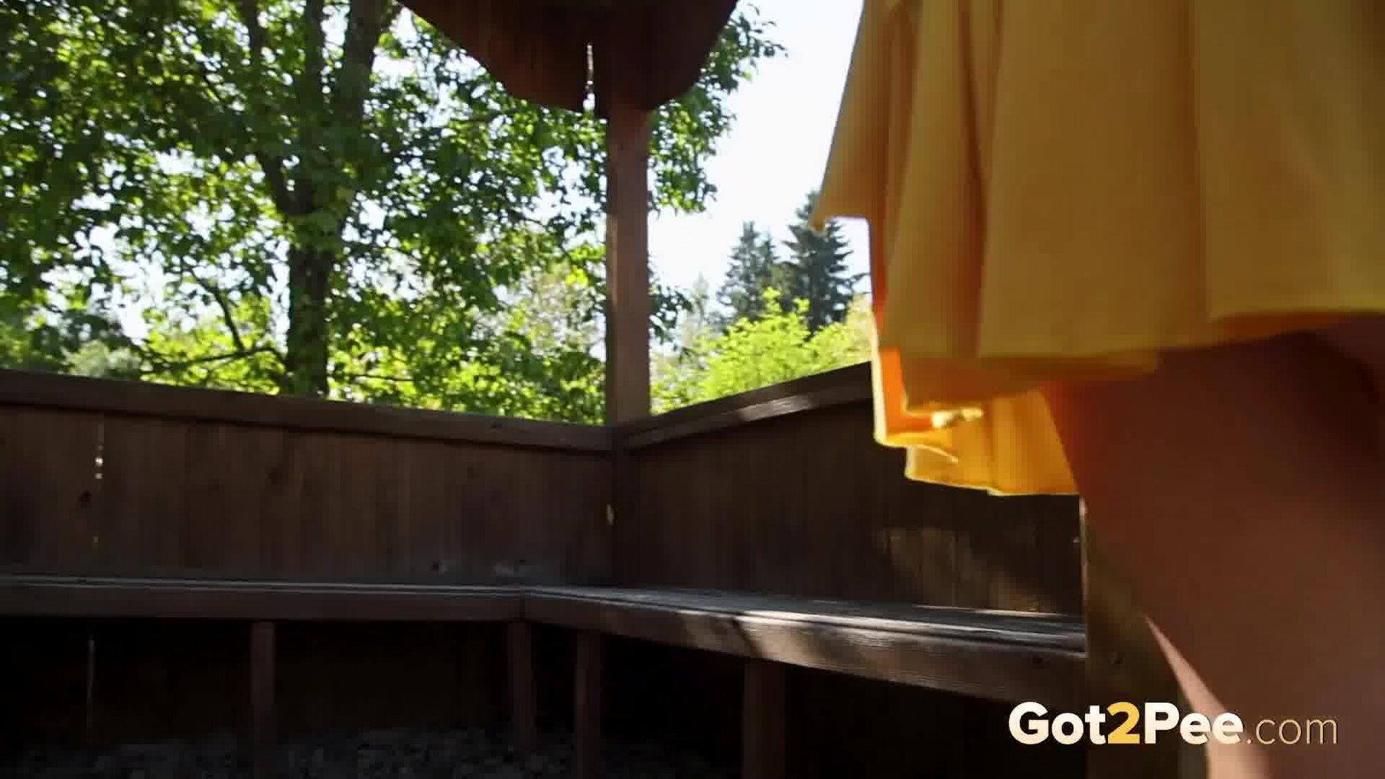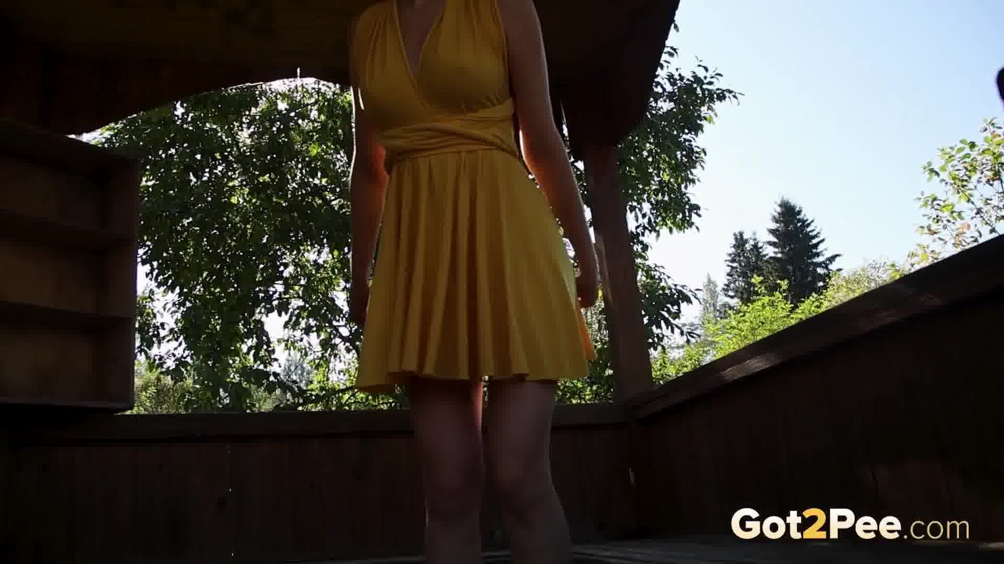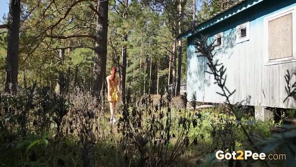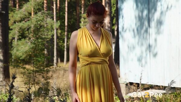 Long haired redhead Foxy Dream features in our newest Got2Pee pissing porn video and walks outside while wearing a short yellow dress. She stumbles across a covered wooden bench structure and climbs on top of the seating. She lifts her dress out of the way and bares her ass while pissing down onto the ground. Zooming in really close on her pussy lips, we capture this redhead pissing and shaking off to finish!