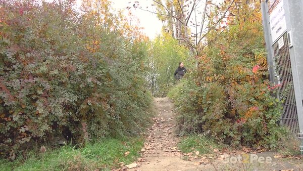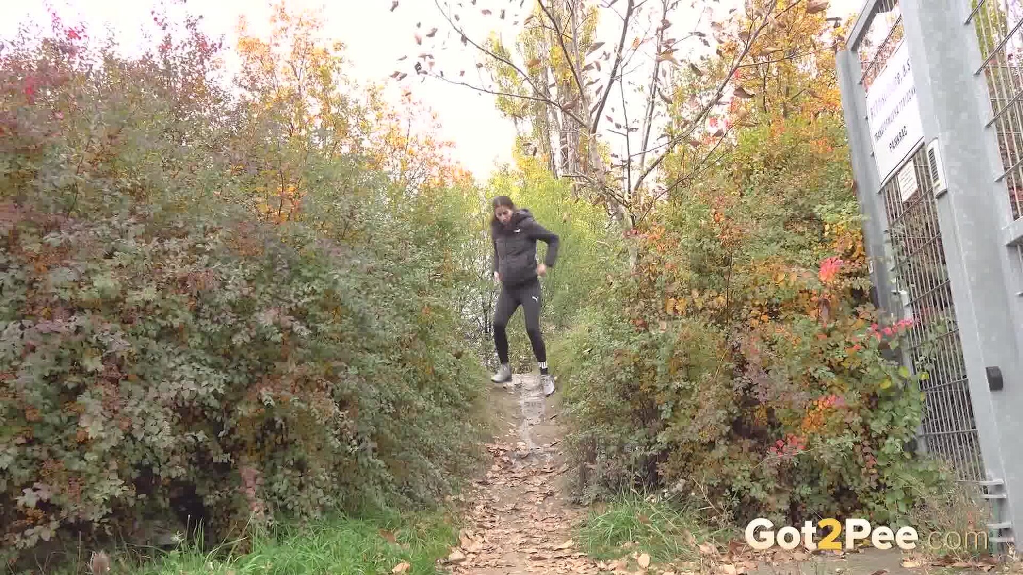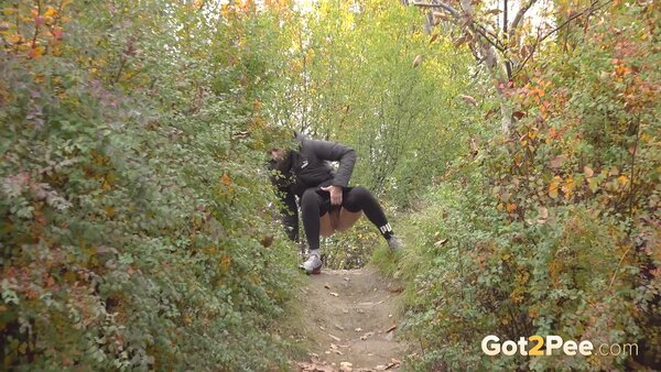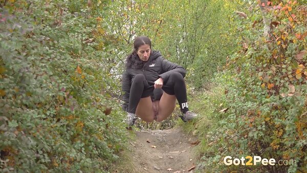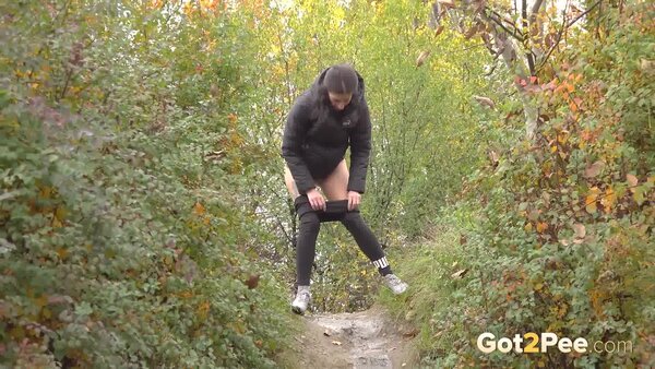 Brunette babe Ali B is walking outside in a padded coat and leggings when she decides to stop at the top of a sloped makeshift path which heads down to a road. Squatting to pee, Ali holds onto her leggings while balancing and spraying her golden stream down onto the ground. She looks into the distance while finishing off and we capture all the action for our newest Got2Pee pissing porn scene.