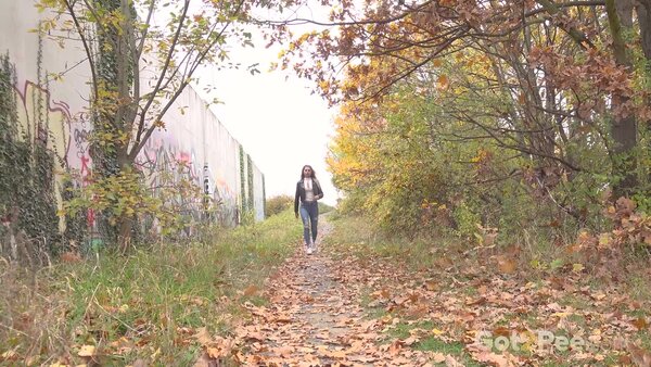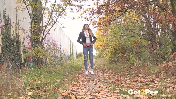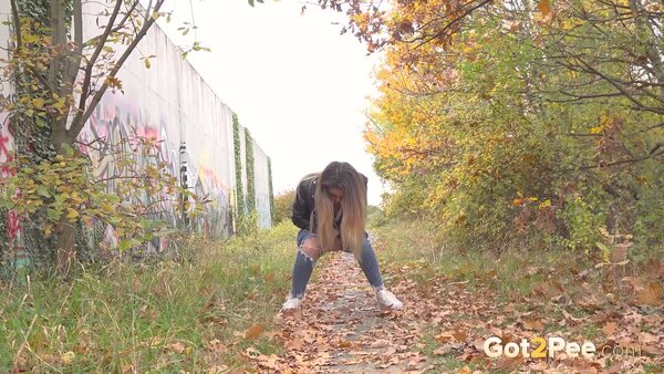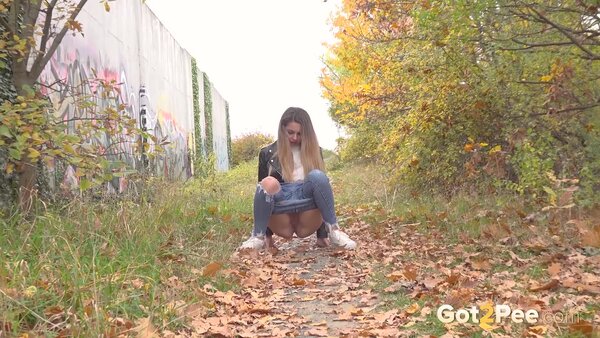 Sexy babe Vanessa Leone walks along a path in the suburbs covered in fallen leaves. She stops and pulls down her ripped denim jeans before squatting to pee. With one hand behind her on the ground, and the other holding onto her denims, Vanessa relieves her pee desperation over the ground in our latest Got2Pee scene.