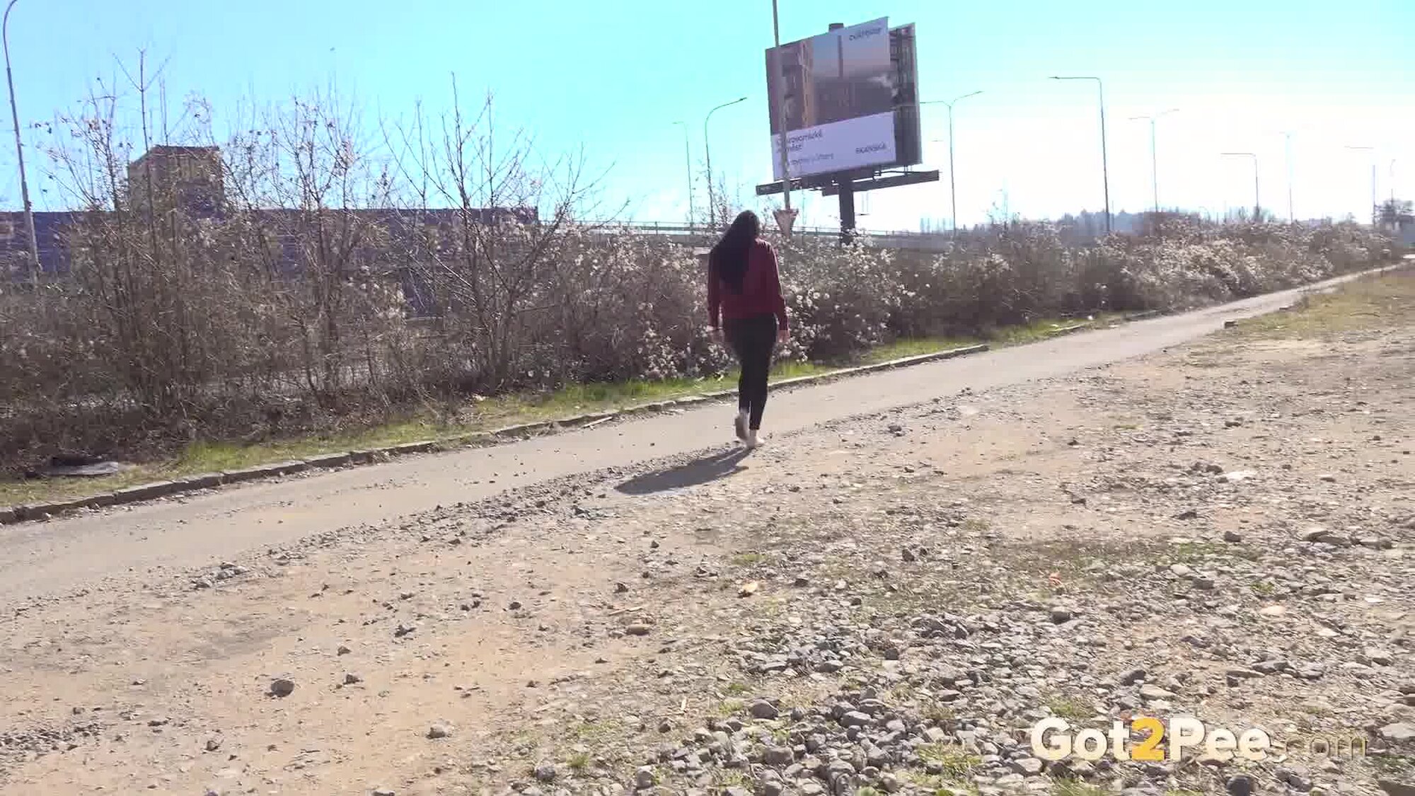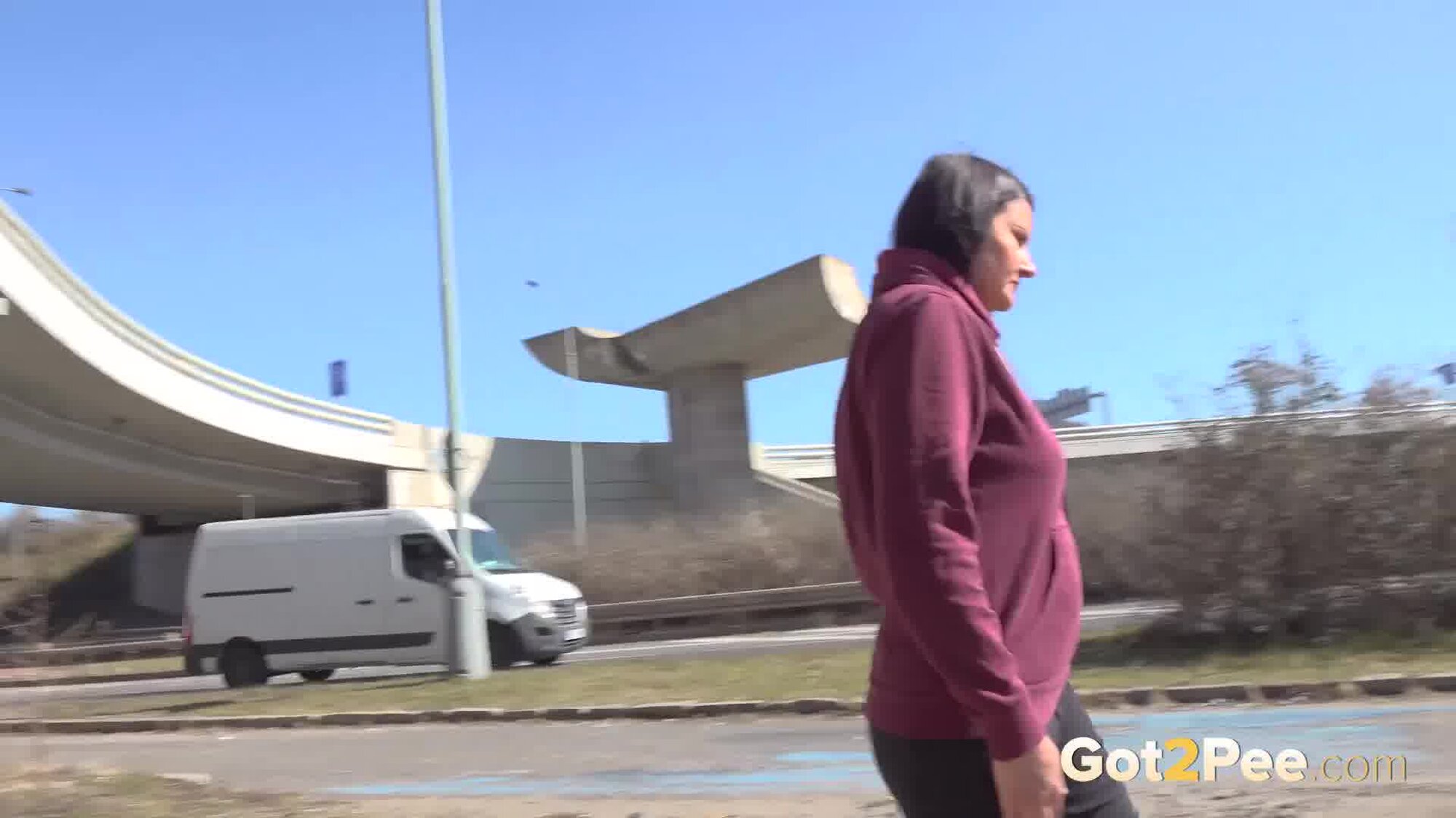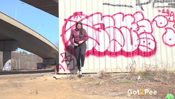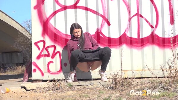 Brunette babe Tiny Tina walks in the suburbs by an interchange and stops in front of a large metal container. Squatting to pee, Tina relieves her piss desperation while we zoom in closeup to capture her public pissing fun near the roads. After she has finished, Tina walks away without worry.