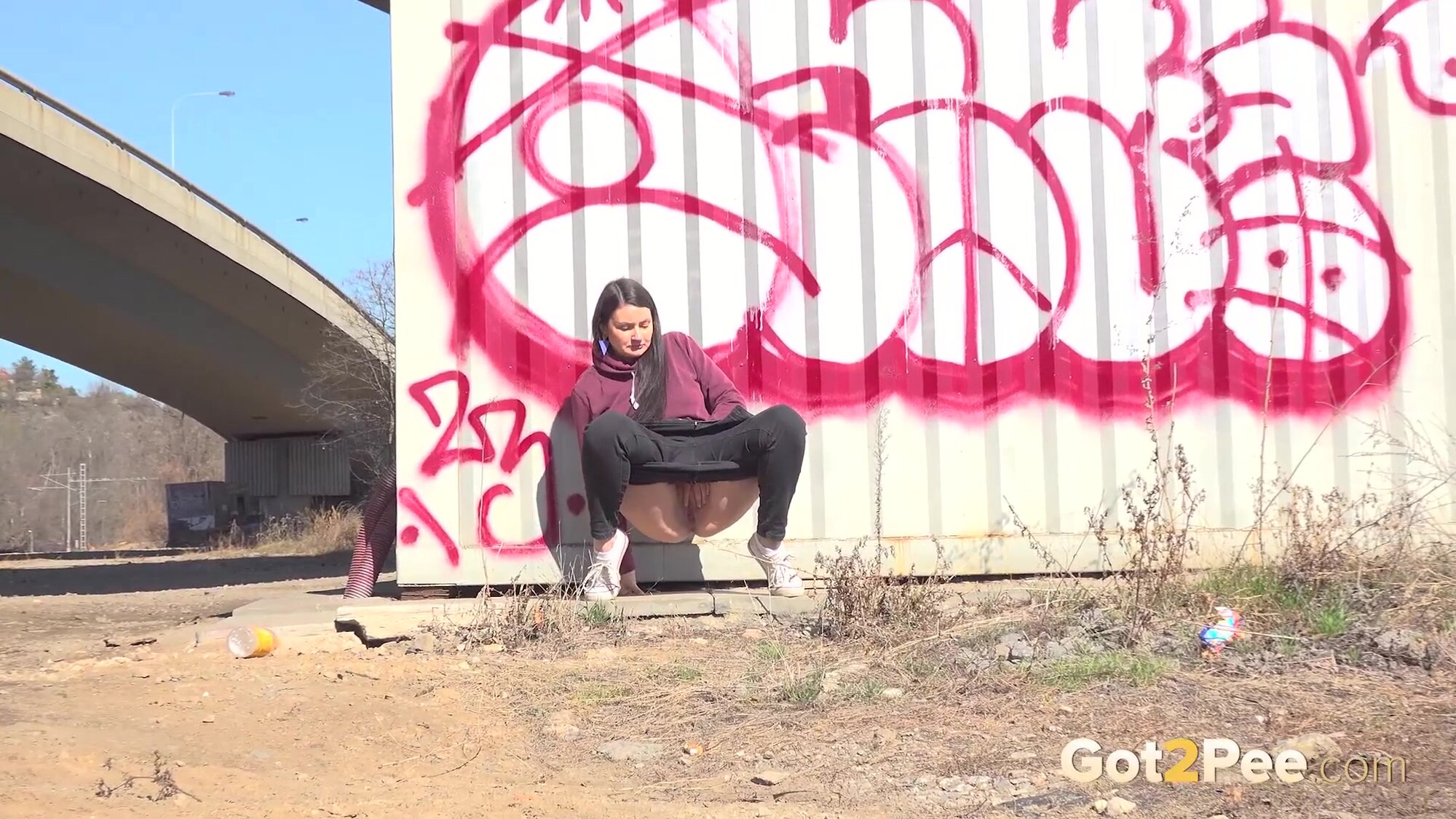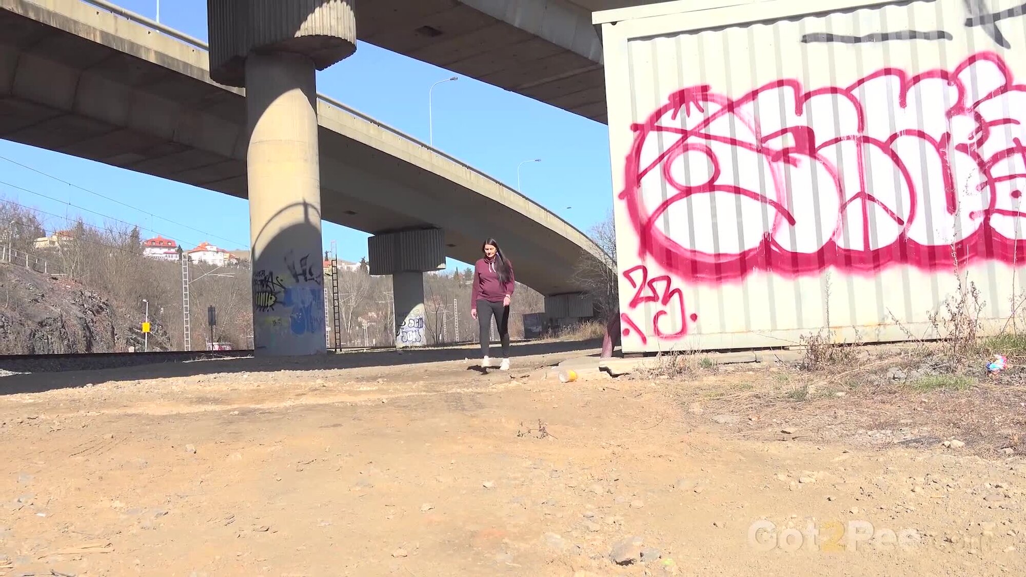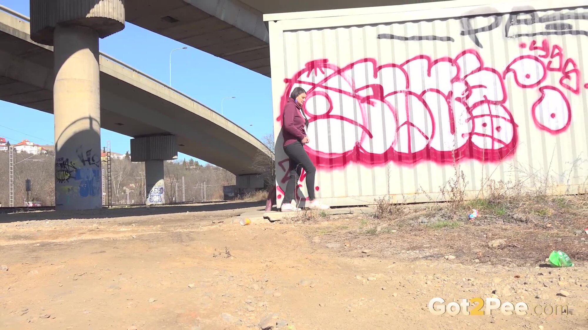 Brunette babe Tiny Tina walks in the suburbs by an interchange and stops in front of a large metal container. Squatting to pee, Tina relieves her piss desperation while we zoom in closeup to capture her public pissing fun near the roads. After she has finished, Tina walks away without worry.