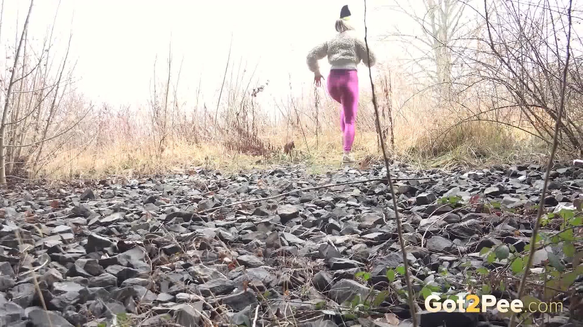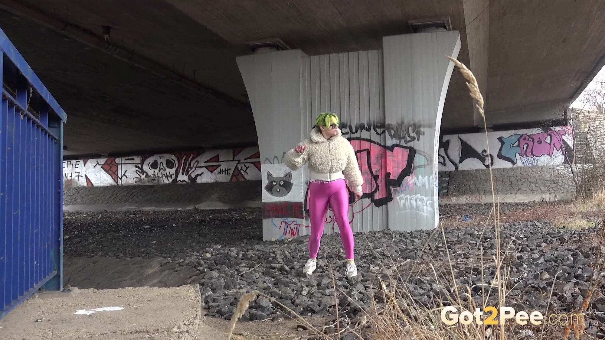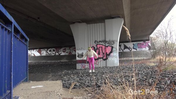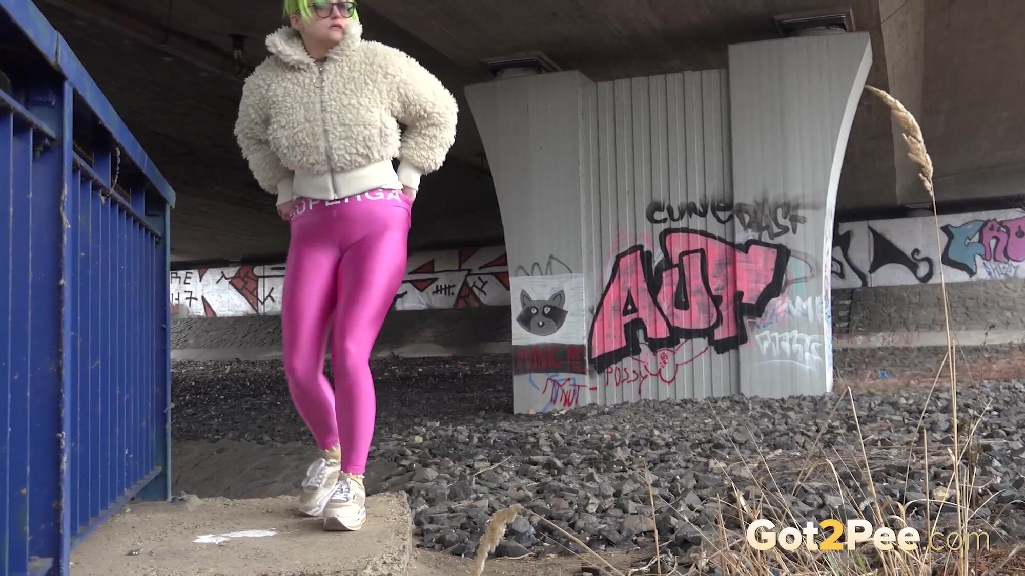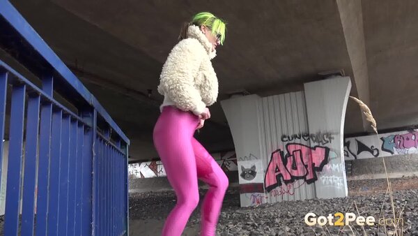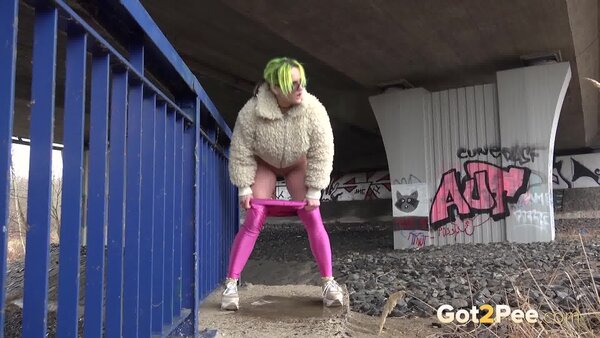 Our latest pissing porn scene features punk babe Barbara Bieber who carefully walks over some rocky ground under a bridge. She stops next to some blue railings and pulls down her pink spandex leggings before she enjoys a pee standing while we film her for Got2Pee. She ends up soaking her leggings with her golden streams and then pulls them up to walk away.