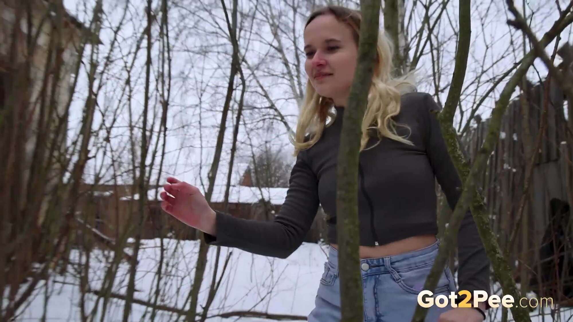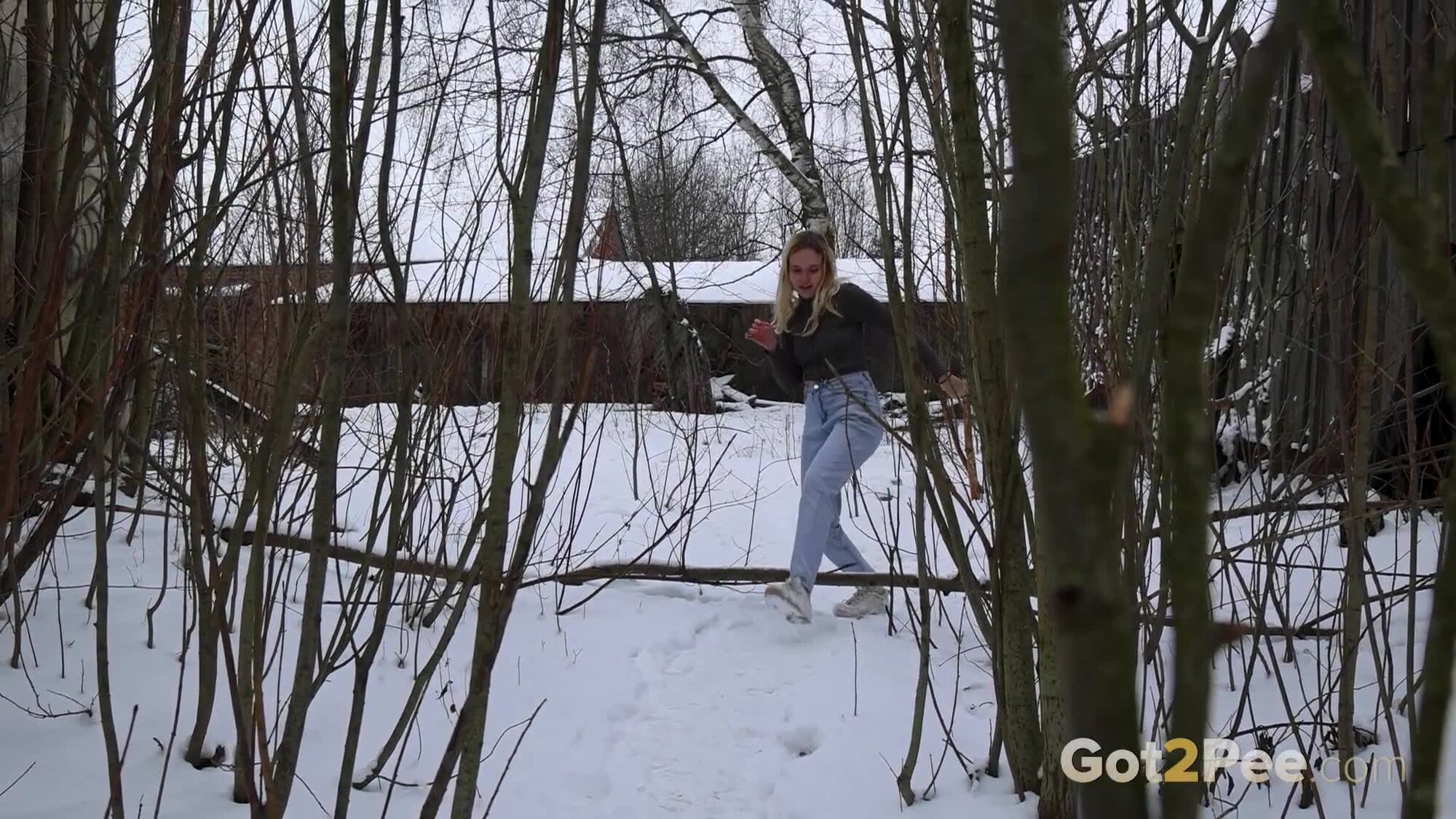 European cutie Lolipop returns to Got2Pee for another pissing porn video. She walks in the snow while wearing denim jeans and a zip up top, looking for somewhere fun to relieve her piss desperation. Climbing up into an abandoned buildings window, Lolipop pulls down her denims and squats, firing her golden pee out and over the snow beneath her!