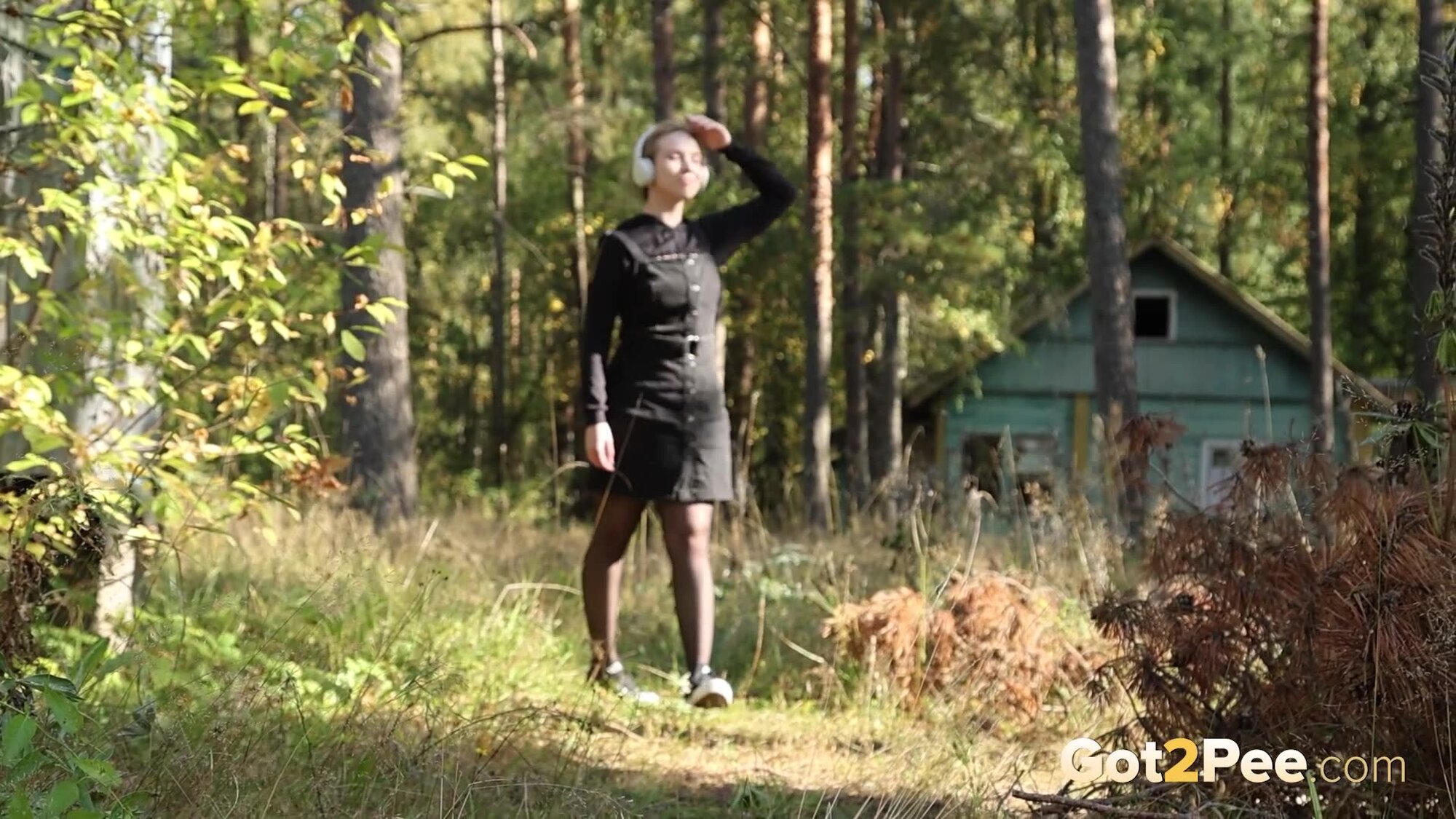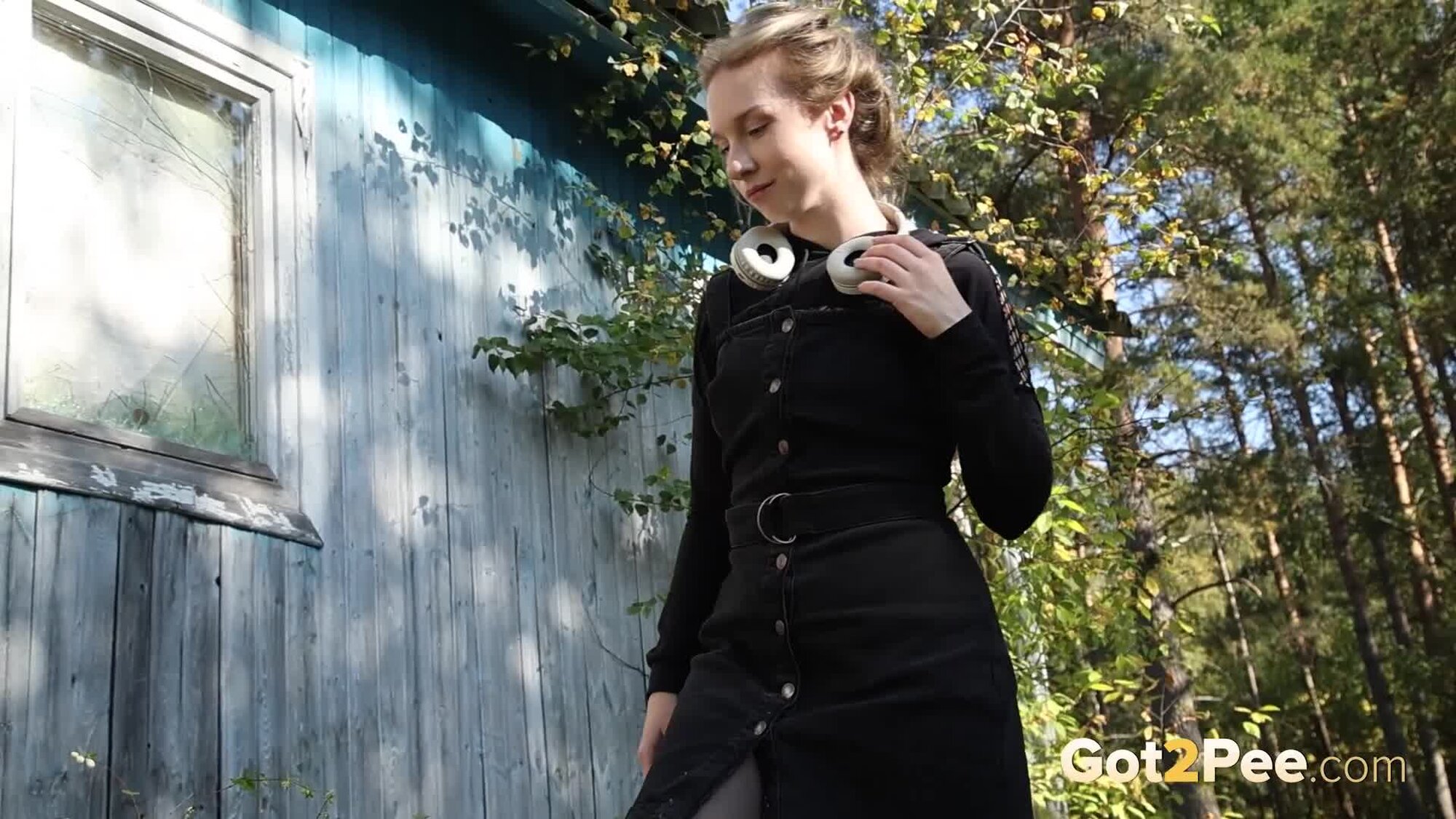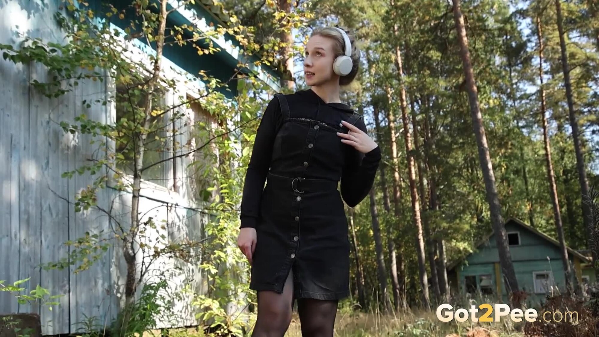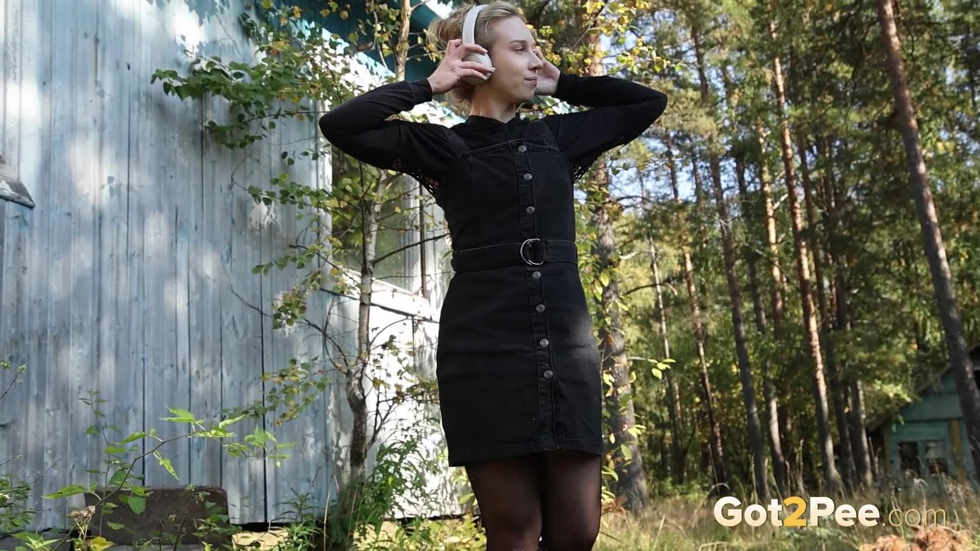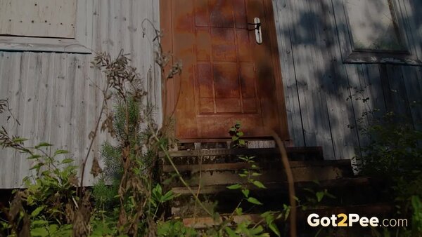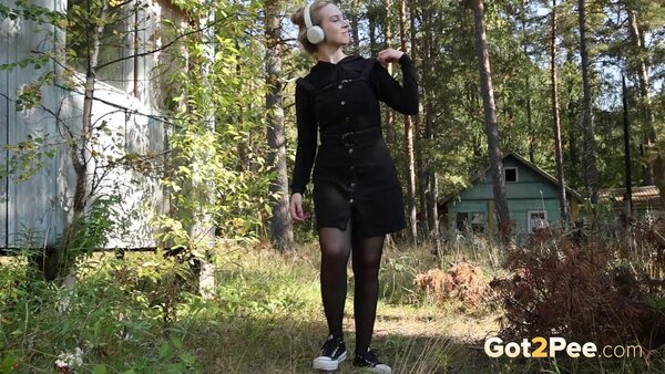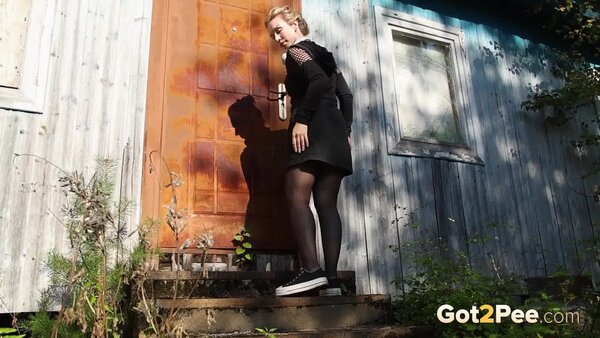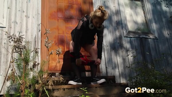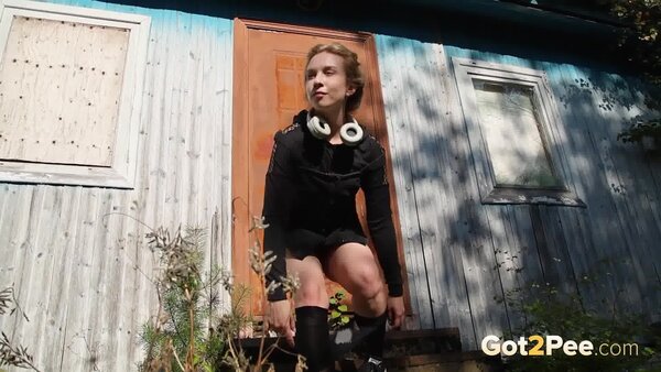 Sexy babe Alice Klay walks outside while listening to music. She looks around to try and find somewhere to pee and decides on a spot near a wooden building. She pulls down her headphones and stands on some wooden steps before she pulls down her pantyhose. Alice is filmed squatting to pee over the steps, and looks seriously relieved as she solves her piss desperation in our newest Got2Pee scene.