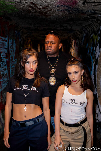 Slut Bitch Gang members Emily & Jane are hanging out in downtown LA when Detective Prince shows up to ruin their fun. Jane was just released from prison and is happy to be out and chillin with her gang friends again, so she and Emily decide to get into some trouble tonight. They’re hanging in a grungy tunnel when Prince notices them and decides to check out what’s going on. He knows they’re part of the Slut Bitch Gang so he frisks them to make sure they’re not packing and then throws them in the back of his car. Prince heads to his house to see what these sluts are really made of. Once the garage door has closed, Prince pulls them out of the car and tells them both to get on their knees, they know the drill. Prince unbuckles his belt and drops his pants as Emily & Jane get right to work tag-teaming that BBC as they feed that cock to each other and stroke it at the same time. Prince has them both get against the wall and strip all their clothes off then puts them on the hood of his squad car so he can pound them hard. He doesn’t waste his time with their pussies, Prince only wants their Slut Bitch Gang assholes. Jane gets assfucked in doggystyle against the car, then climbs on the hood so she can hold Emily’s legs open as she gets anally reamed. They head over to the living room to continue the anal assault with Prince making sure to fuck each of their assholes equally. He stacks them on top of each other so he can take turns on both of their buttholes before blasting their faces with his huge load.