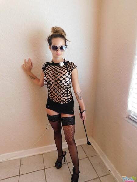 Kinky Teen Amateur Becky C is a 19 year old teen from west central coast Florida. She works as a waitress at a bar. She has always had a kinky side. She has a thing about her panties. She loves to get them creamy and smell them while she gets off. She loves to sell them to her customers at the bar. She makes a lot of good money doing it. Her boobs a so firm and big. Her pussy well shaved along with her asshole. She has a big pussy. Here she is getting in her mistress outfit. She has on here fishnet stockings, high heels, fishnet dress, whip, black cotton panties, nipple clamps, and a ball gag. She is Hot in this outfit. She gives you some nice feet pics. She pulls her panties up tight. Sinking them deep between her pussy lips. She strips off her panties and spreads her shaved pussy wide for you. Slapping her pussy with the whip.